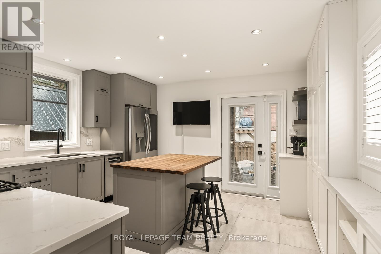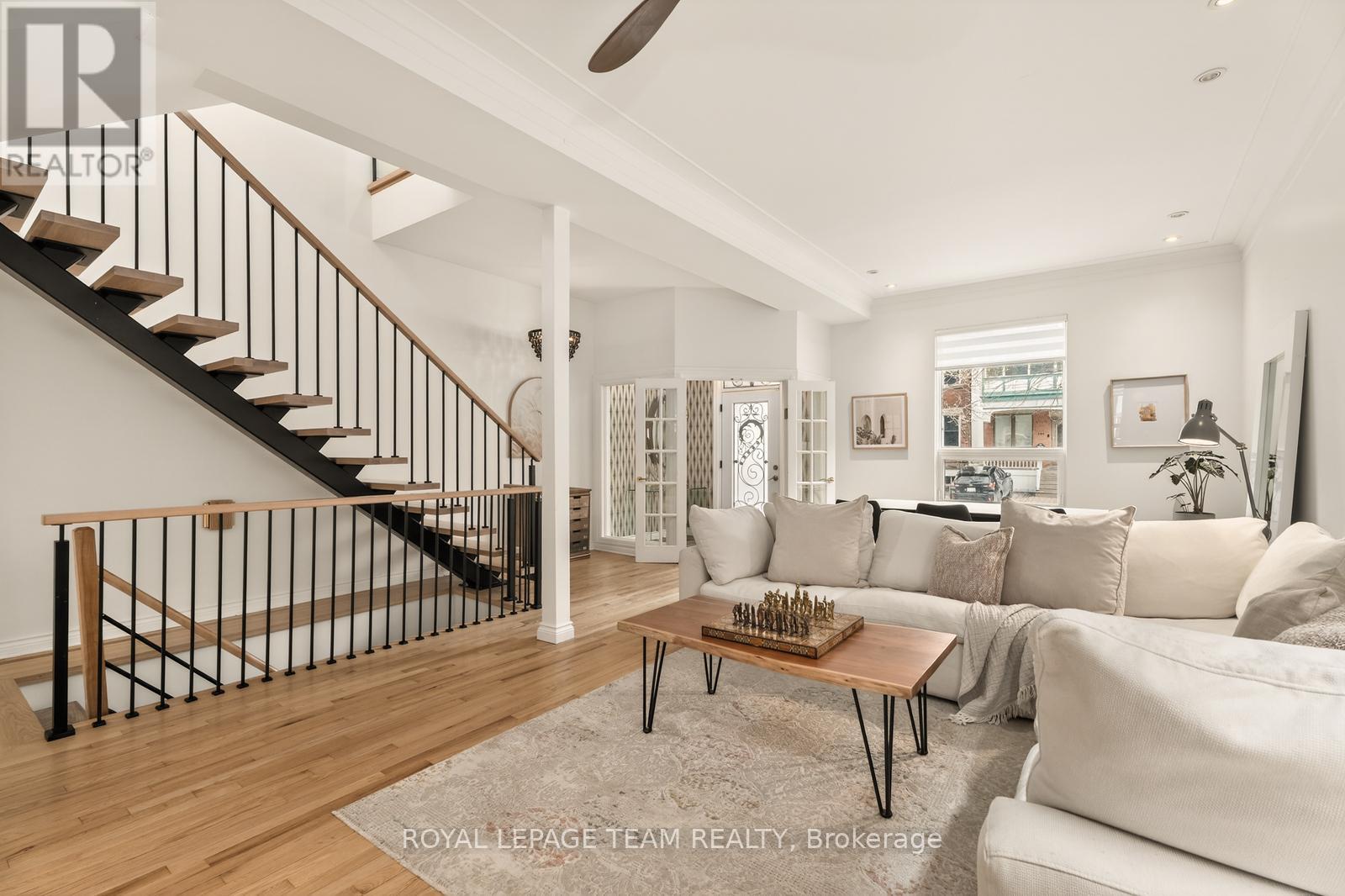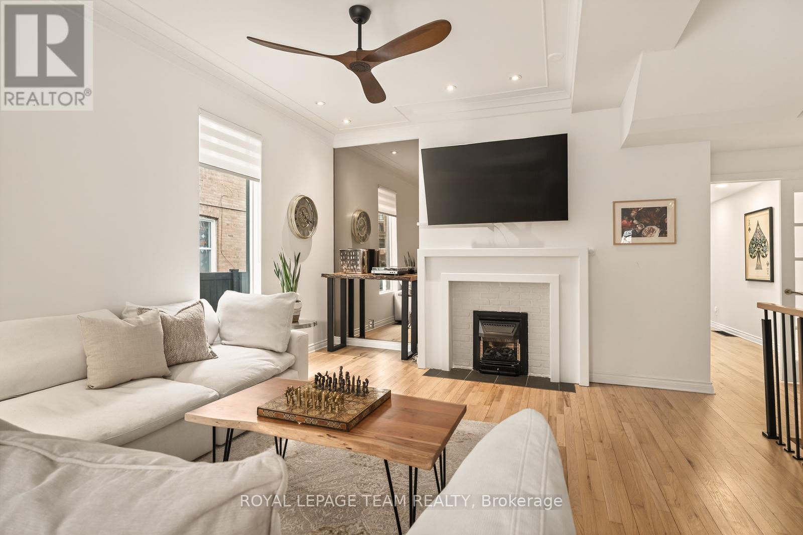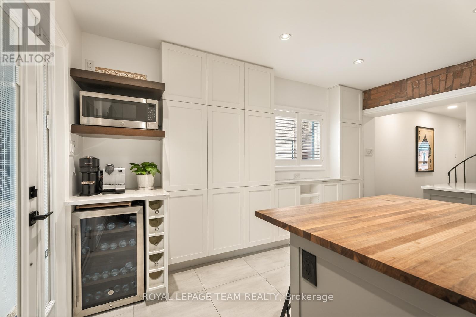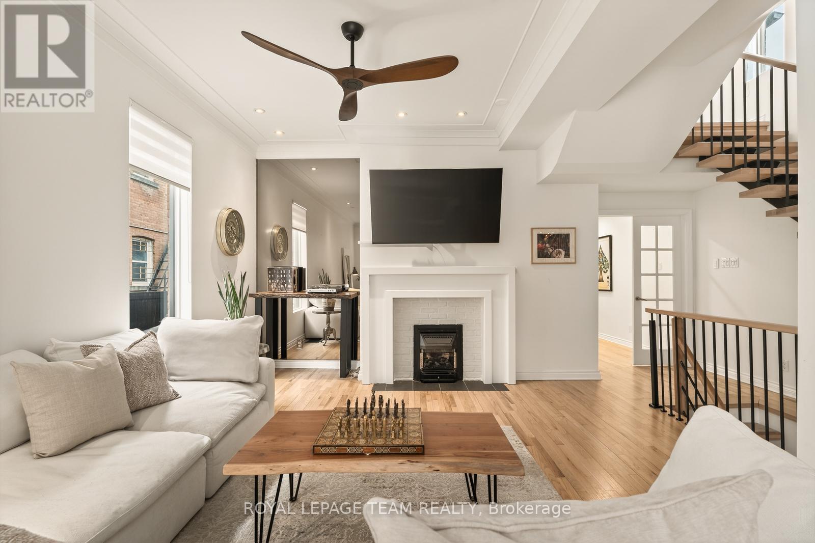 Turnkey and full of personality, 349 Frank Street delivers standout design, function, and lifestyle in a quiet downtown pocket between Elgin and Bank. A rebuilt front porch with privacy gate elevates outdoor living and sharpens curb appeal. Inside, soaring ceilings, refinished hardwood, and a gas fireplace anchor the bright, south-facing living space. The main level flows through a chic full bath and generous laundry to a standout kitchen-wall of cabinetry, oversized fridge, gas range, butcher block island, coffee bar with wine fridge, exposed brick, and original winding staircase. Patio doors open to a vibrant backyard with hot tub, pergola lighting, and a beautifully finished cedar shed with power. Upstairs, an unforgettable two-level loft primary stuns with glass wall, beams, and office nook, plus two private additional bedrooms-including one with balcony-and a spa-scale bath. Lower level features a moody, cinematic home theatre, gym space, bar/kitchenette, and bonus room. (id:64974)