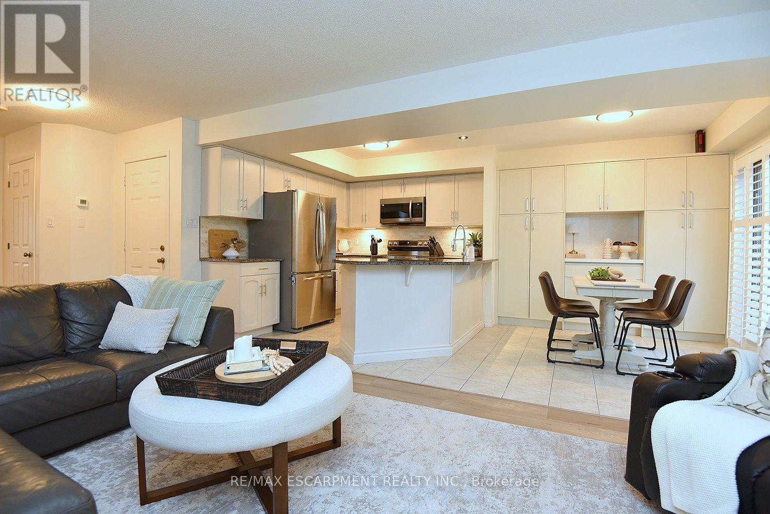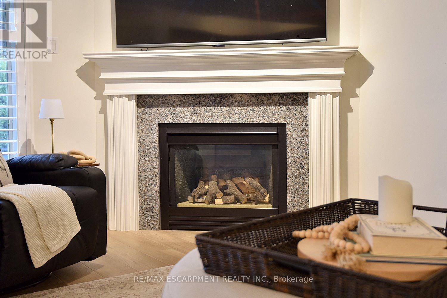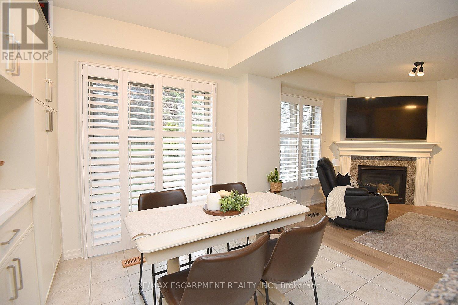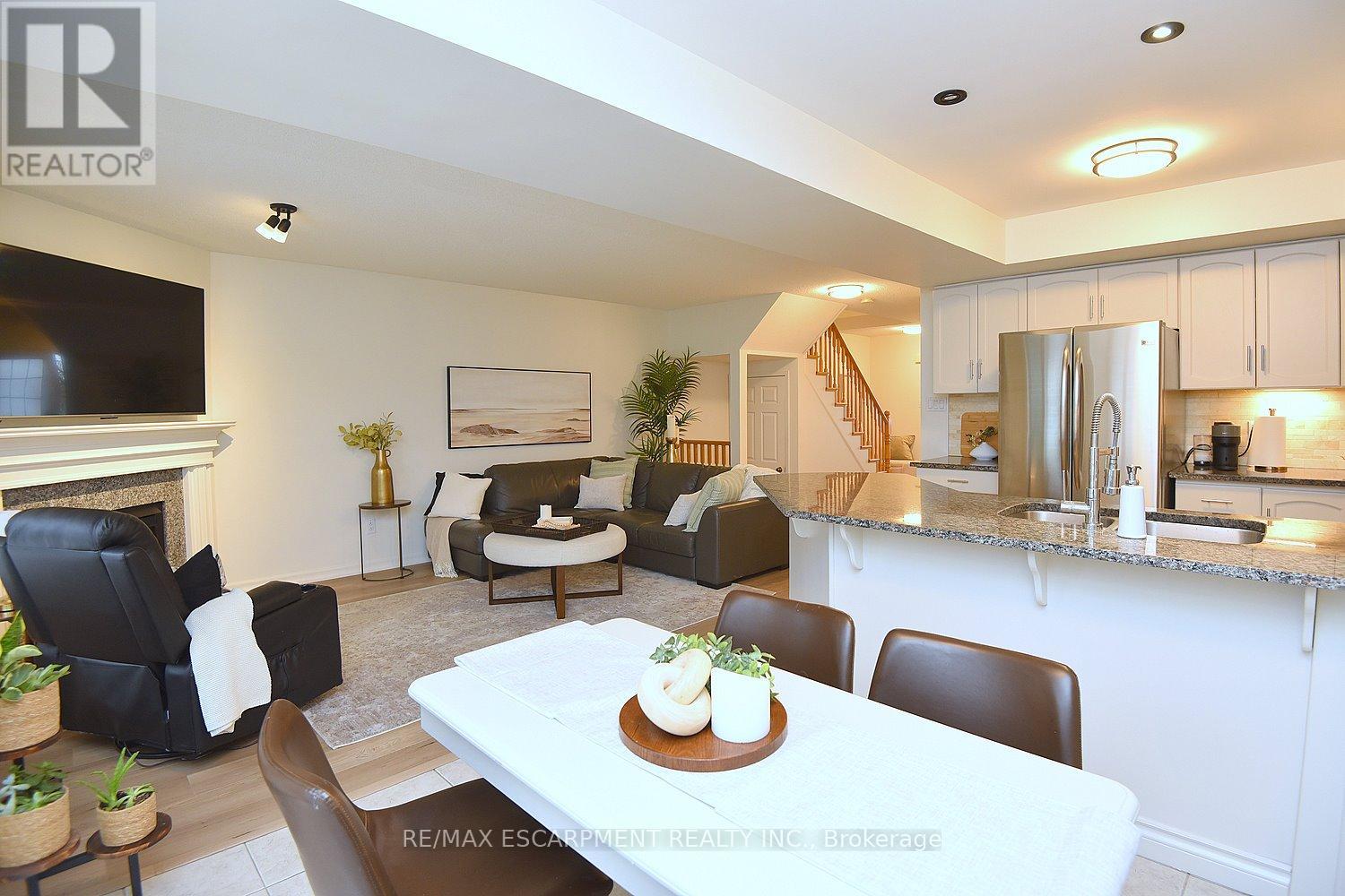 Welcome to the beautifully appointed townhome, ideally located in the heart of family-friendly Grimsby, just 1.3km from the Casablanca/QEW exit for convenient highway assess. The Open-Concept main level is perfect for modern living, featuring a stylish white kitchen, with granite countertops, SS appliances, and additional built-in cabinetry. Recent upgrade; newer wood-look flooring throughout the main & upper levels(2025). California Shutters & cozy gas fireplace. Step outside to a private, treed backyard with an aggregate patio and gas-line bbq. The upper level offers three generously sized bedrooms, along with a small loft space perfect for a home office or reading nook. Lower level is finished with a nice size recroom and laundry. A RARE feature; the driveway accommodates parking for 2 cars along with the garage gives you parking for 3 cars. Don't delay this amazing home will not last. (id:64974)
