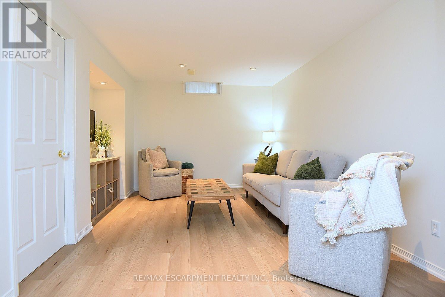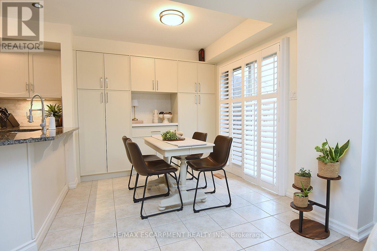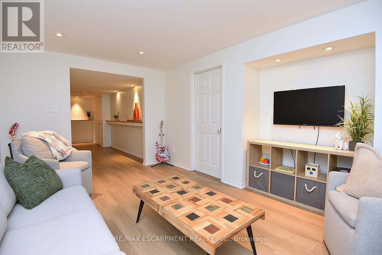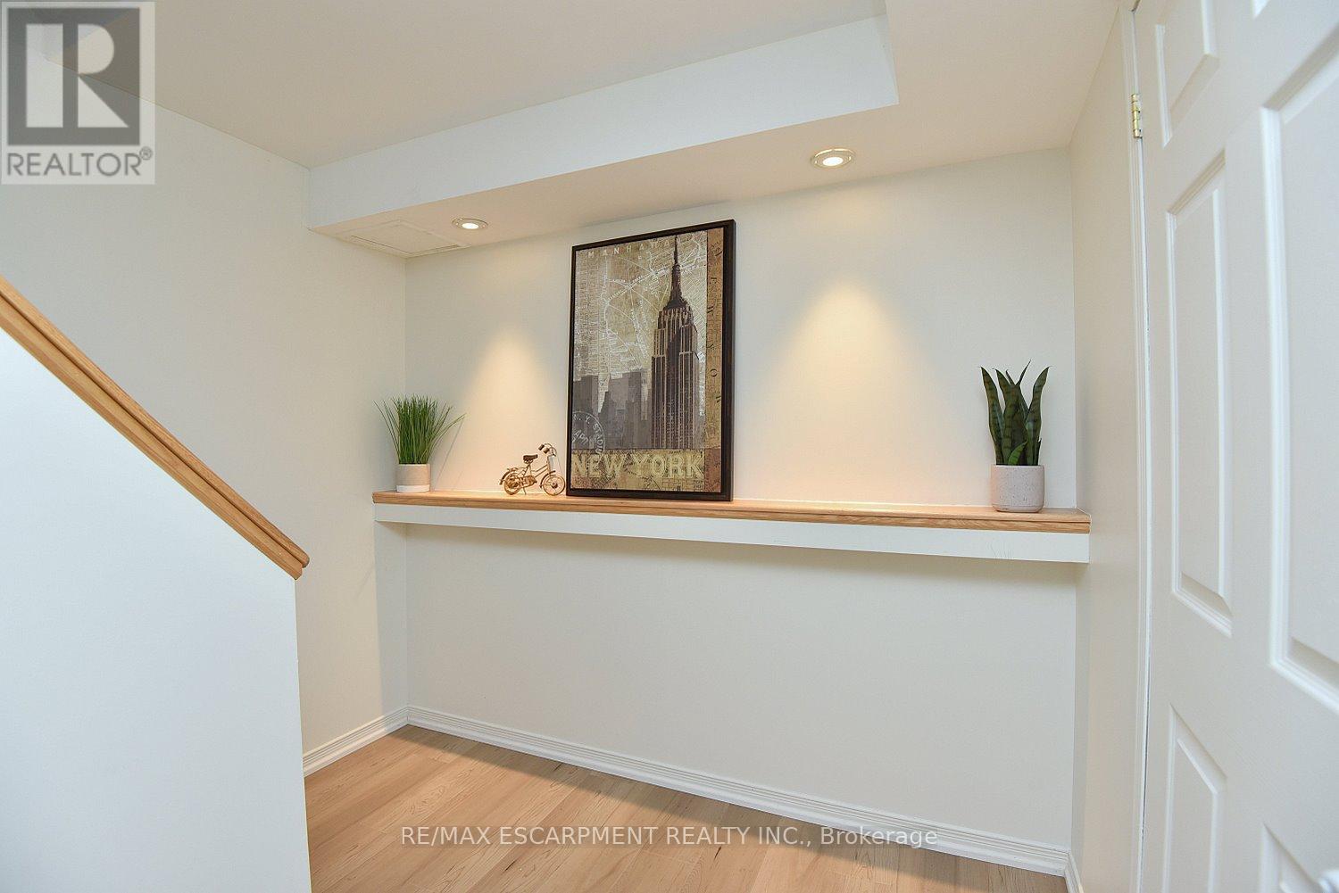 Welcome to the beautifully appointed townhome, ideally located in the heart of family-friendly Grimsby, just 1.3km from the Casablanca/QEW exit for convenient highway assess. The Open-Concept main level is perfect for modern living, featuring a stylish white kitchen, with granite countertops, SS appliances, and additional built-in cabinetry. Recent upgrade; newer wood-look flooring throughout the main & upper levels(2025). California Shutters & cozy gas fireplace. Step outside to a private, treed backyard with an aggregate patio and gas-line bbq. The upper level offers three generously sized bedrooms, along with a small loft space perfect for a home office or reading nook. Lower level is finished with a nice size recroom and laundry. A RARE feature; the driveway accommodates parking for 2 cars along with the garage gives you parking for 3 cars. Don't delay this amazing home will not last. (id:64974)