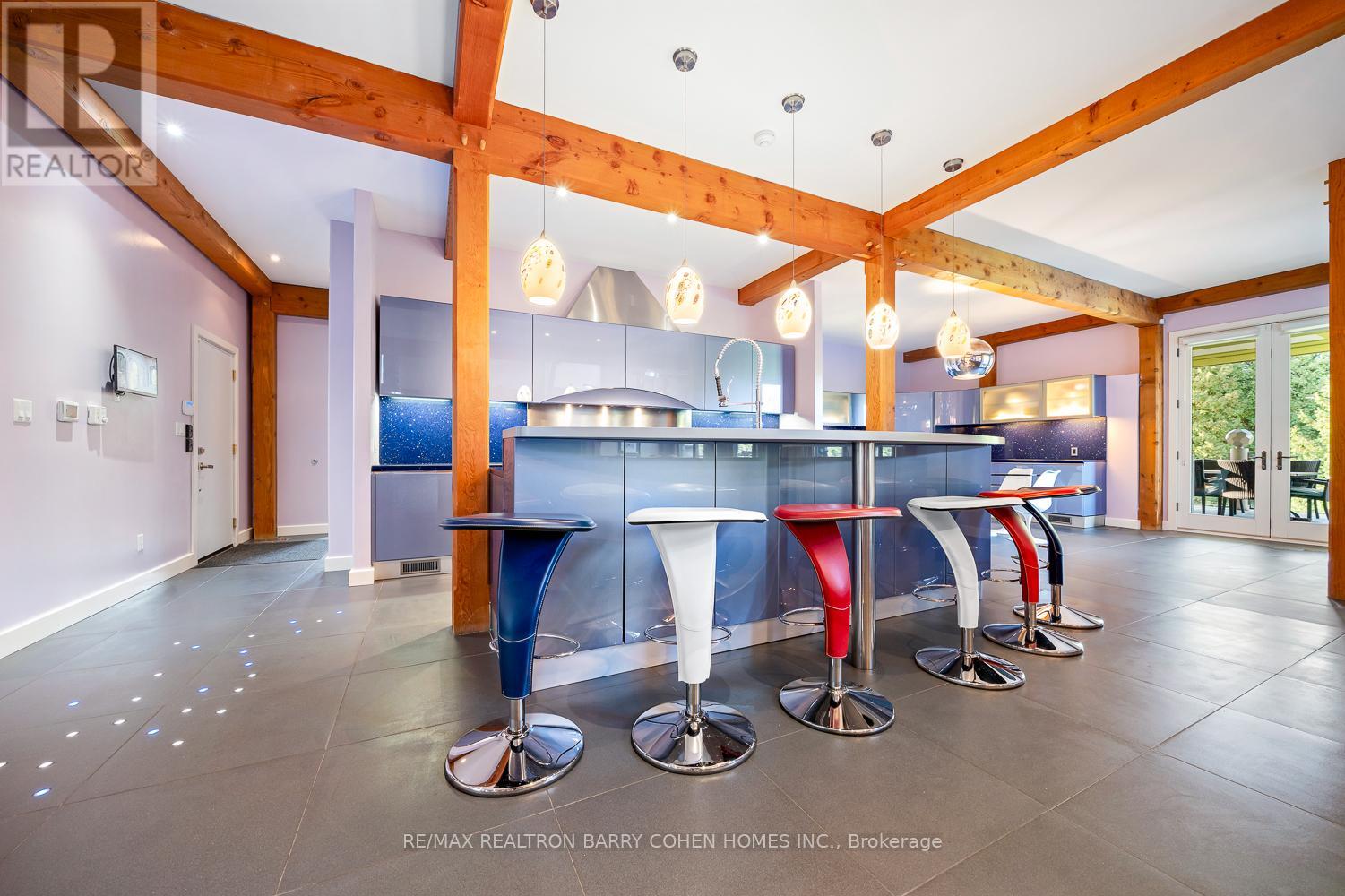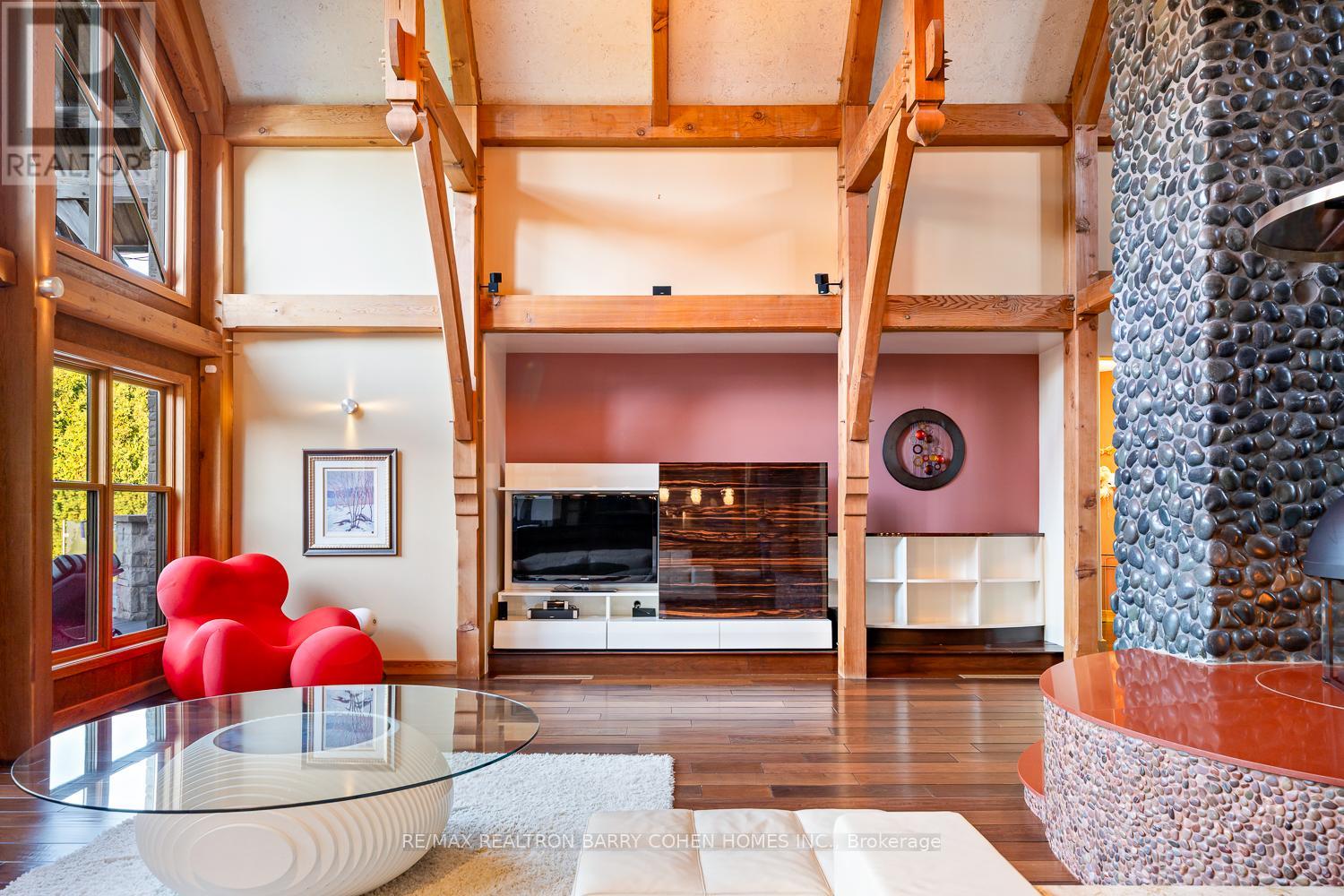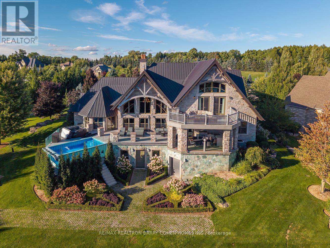 This One-Of-A-Kind Residence Was Custom Built By The Owners To Showcase Their Unique Vision, Blending The Chic Allure Of High-End Chalet Design With The Timeless Strength Of Canadian Timber Frame Craftsmanship. A Striking Copper Roof Crowns The Home, While A Dramatic Great Room With Soaring 35-Foot West-Facing Windows And A Circular Gas Fireplace Sets The Tone For Inspired Living. Overlooking This Impressive Space Is A Designer Snaidero Kitchen With Seating For 10, Walkout To The Wraparound Deck, And An Infinity Pool Bordered By Glass Walls. The Main Floor Is Anchored By A Private Office Or Dining Room, And A Bauhaus-Inspired Powder Room With Tile Detailing. The Primary Suite Serves As A True Sanctuary, Featuring Cathedral-Like Beamed Ceilings, Bespoke Poliform His-And-Hers Walk-In Closets, A Luxurious Spa-Like 5-Piece Ensuite. Upstairs, Two Expansive Bedroom Suites With 25-Foot Ceilings Each Enjoy Private Walk-In Closets And Share A Large 6-Piece Ensuite With Loft Areas. The Walk-Out Lower Level Offers A Family Room, Acoustic Music Studio, Private Hair Salon, And Powder Room, Along With Additional Bedrooms For Family Or Guests. Designed With Both Scale And Intimacy In Mind, This Home Balances Contemporary Elegance With Natural Warmth An Irreplaceable Retreat Surrounded By Unmatched Privacy. (id:64974)