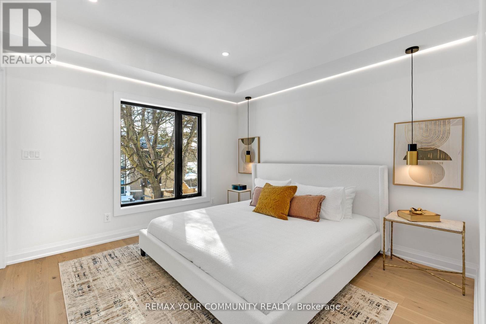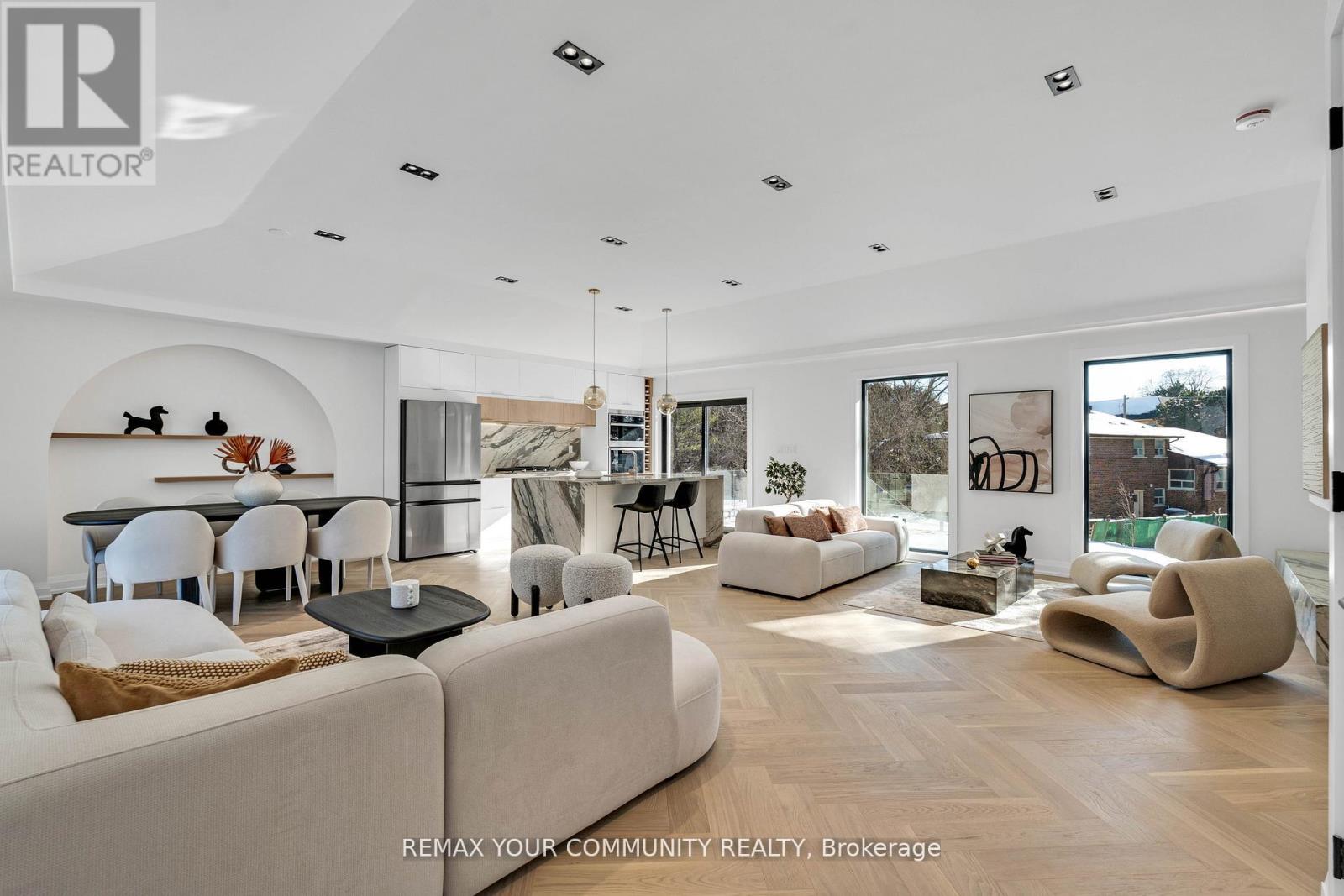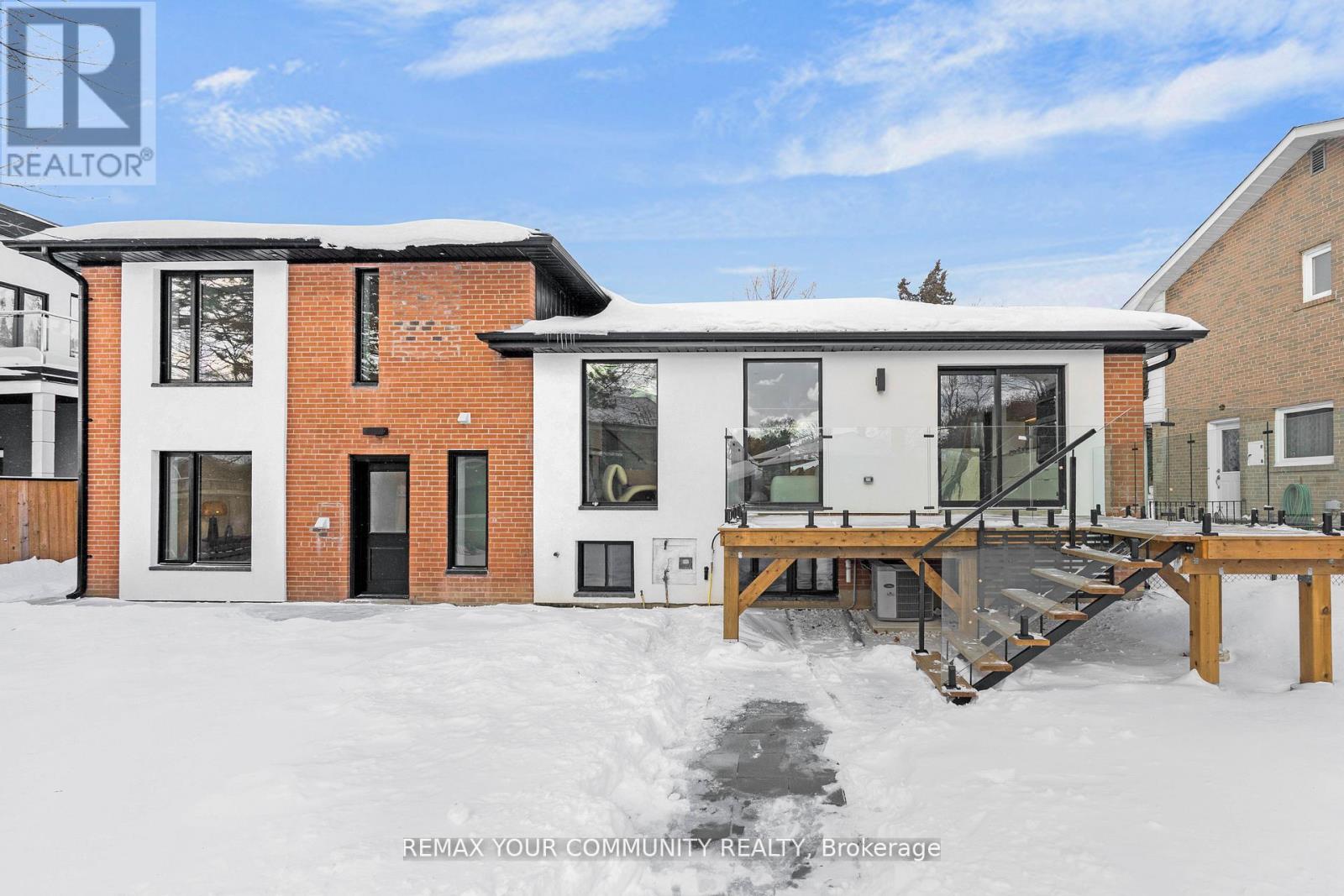 Stunning fully renovated side-split in the heart of Bayview Village. Rebuilt with closed permits, this 4+1 bedroom home offers a bright, open-concept layout designed with architectural plans. Featuring soaring ceilings up to 10 ft on the main floor and custom designer LED lighting throughout. Approx. 2,550 sq. ft. of usable living space (as per owner). The entire home has been spray-foam insulated, including full insulation in all walls and ceilings, with all-new framing, windows, and doors. Major upgrades include a new roof and skylight (2025), a 200-amp electrical panel with new wiring throughout, completely updated plumbing with new underground drainage, a new 50-gallon hot water tank, and a waterproofed foundation with damp proofing, weeping tile, sump pump, and backflow prevention valve. This home offers two kitchens and two laundry areas with a separate entrance, ideal for in-law living or additional income potential. Set on a rare wide lot expanding to approximately 69 ft at the rear, the property also features a new asphalt driveway, a new deck, a fully redesigned backyard with fresh landscaping, and a private outdoor seating area with a gas line for BBQ and fire pit. Easily accessible to major highways, and close to excellent schools, hospitals, libraries, and shopping. with just minutes' walk to ravine trails-offering and Tennis court, the perfect combination of convenience and lifestyle. (id:64974)