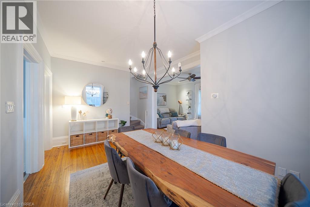 Welcome home to 35 Murray Street in Brantford. This 2-storey home offers 1,716 sqft of living space with 3 bedrooms, 2 bathrooms and a private fully fenced backyard. A well-kept exterior highlights the updated steps with raised flowerbeds and a covered front porch creating a warm first impression. Parking for two vehicles is available. A bright foyer welcomes you inside, featuring classic trim, crown moulding and a closet for everyday organization. The carpet-free main floor includes hardwood flooring that flows from the foyer through the living & dining rooms, accented by high ceilings, crown moulding, pot lights and large windows. The living room includes a ceiling fan, while the dining room offers an elegant setting for gatherings. The crown moulding & trim continue into the updated eat-in kitchen, featuring stone countertops, cabinetry complemented by a subway tile backsplash, and a center island with butcher block surface, storage & seating. This bright, functional space includes a new gas stove (2025) and sliding doors with a walkout to the rear yard. The main floor is complete with a laundry room and a 3-piece bathroom with an updated glass-enclosed shower (2023). The hardwood flooring continues upstairs, where you’ll find three bedrooms, including a primary with walk-in closet. A 4-piece bathroom with a tub/shower combo completes the upper level. The basement offers unfinished space for storage or future development. The fully fenced backyard includes landscaped green space and a new tiered deck (2025) with plenty of room to relax or entertain. A garage/workshop with stained glass doors adds both charm and functionality. Additional updates include an owned water softener (2022), main water line replacement, vinyl windows (2010), and washer/dryer (2020). Located within walking distance of schools, parks, grocery stores, bus routes, and everyday amenities, this home offers convenience and community in one of Brantford’s established neighbourhoods. (id:64974)