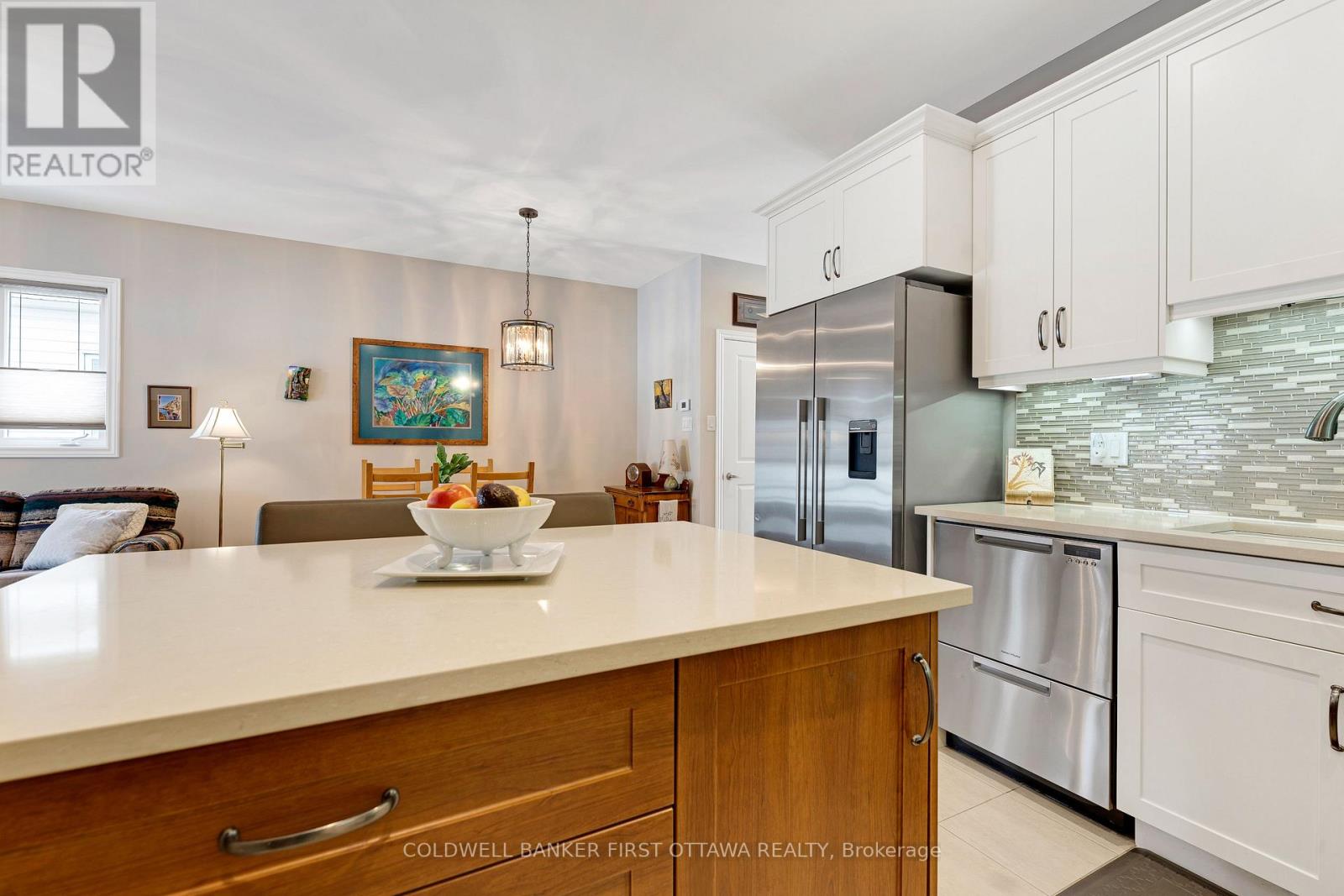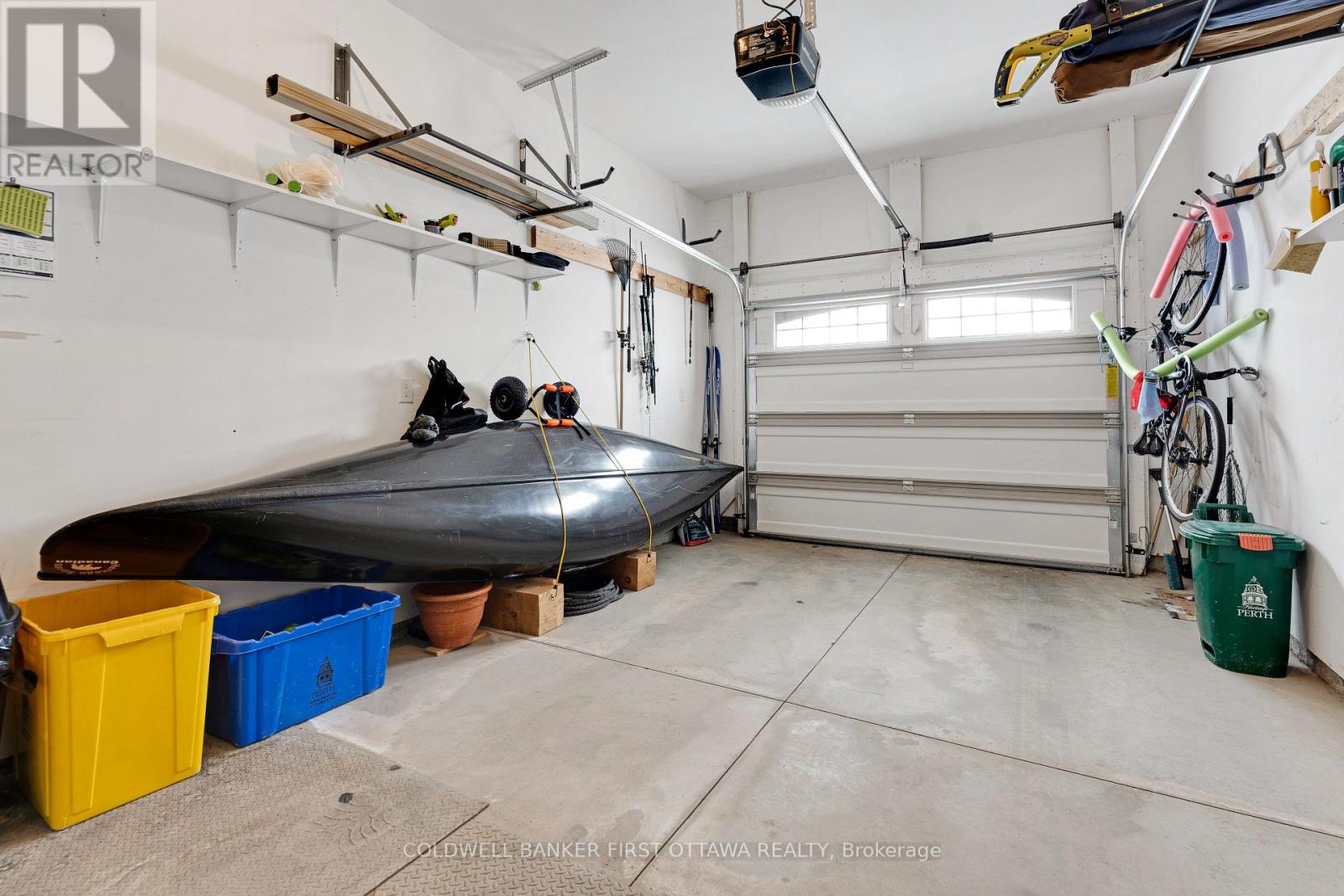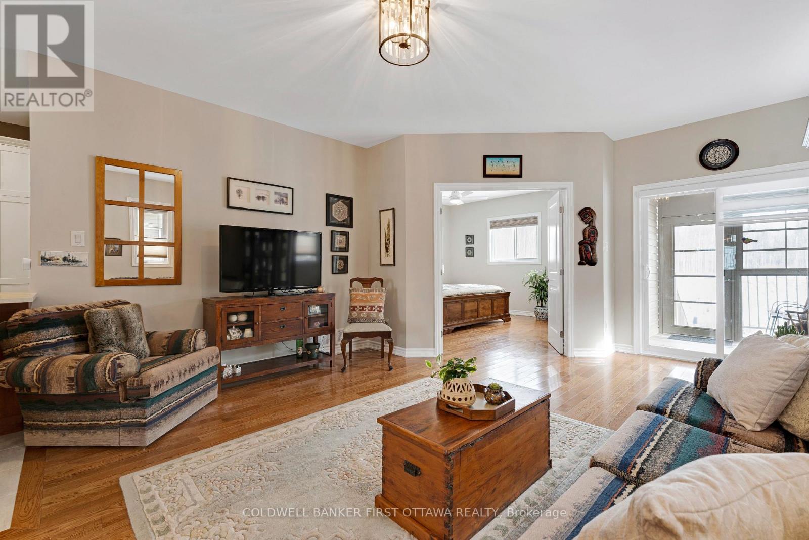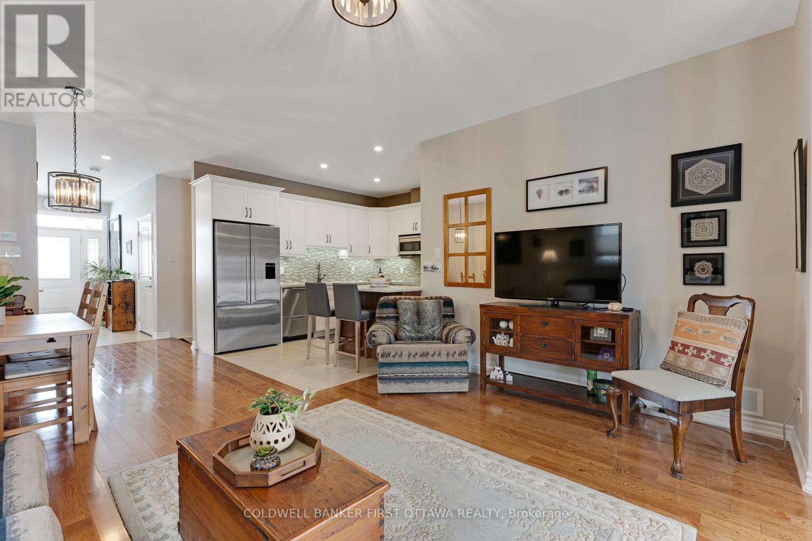 Perth has a way of staying with you. The slower pace, the limestone architecture, the sense that a good life is still lived at a human scale. Perthmore was built with that understanding, and it shows in this lovely 2017 townhome. Inside, the main floor is designed for effortless single-floor living. The primary bedroom and its ensuite are steps from the kitchen, the laundry is on the same level, and the hardwood floors and tile run throughout without a threshold in sight. Large windows with custom blinds pull in natural light across the open floor plan. The kitchen anchors the space with quartz countertops and Fisher & Paykel appliances. The screened Sunspace porch extends your living season without requiring a jacket. Downstairs, a finished lower level adds meaningful flexibility: a second bedroom with walk-in closet and a full bath make it a proper guest suite, a home office with privacy, or a comfortable space for family when they visit. Step out from the lower level onto the sunken patio, where privacy fencing creates a sheltered outdoor room. Beyond it, manicured garden beds carry colour and texture through the seasons, ready to enjoy without demanding your weekend. Past the property line, a nature park and pond is planned that will permanently protect that green horizon. Outside, the brick and vinyl exterior asks little of you, while the attached garage and double-wide driveway handle the practical realities comfortably. Perthmore townhomes surface infrequently - this corner of Perth has earned its reputation quietly, through people who chose it and stayed. Book your showing today to come walk through your new home! (id:64974)