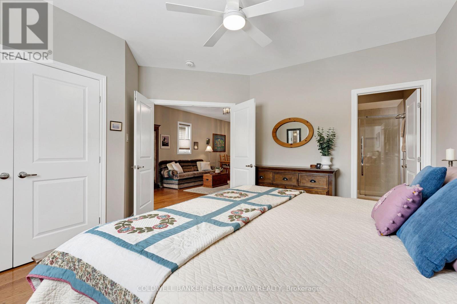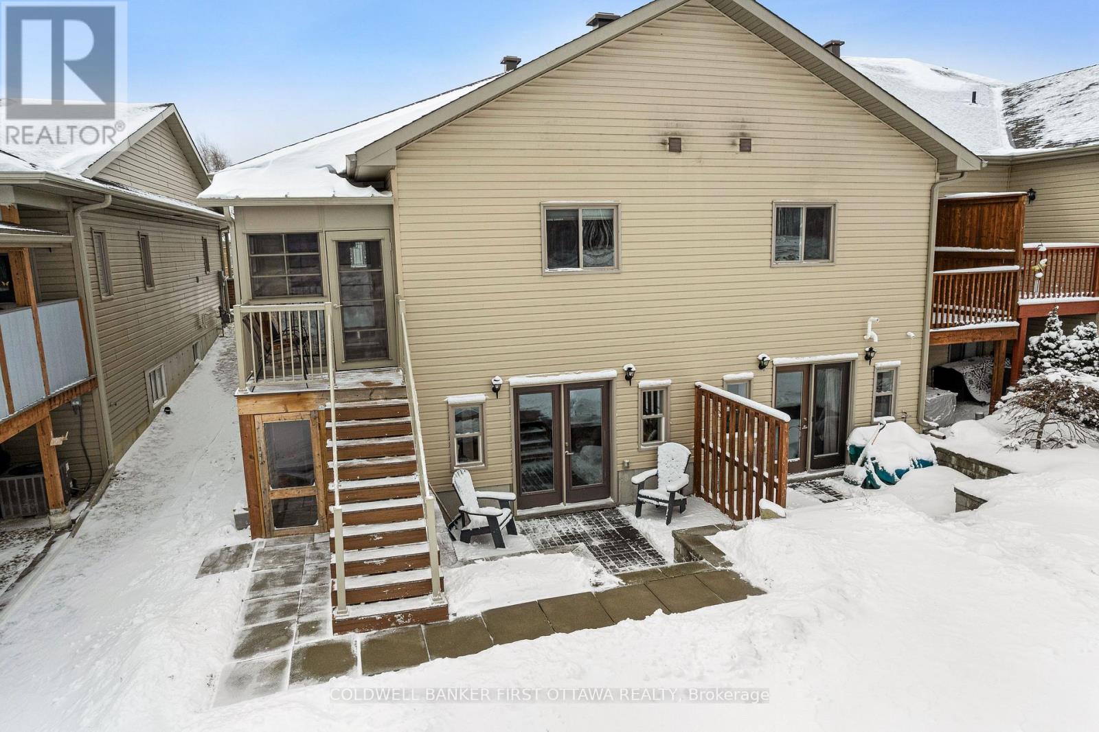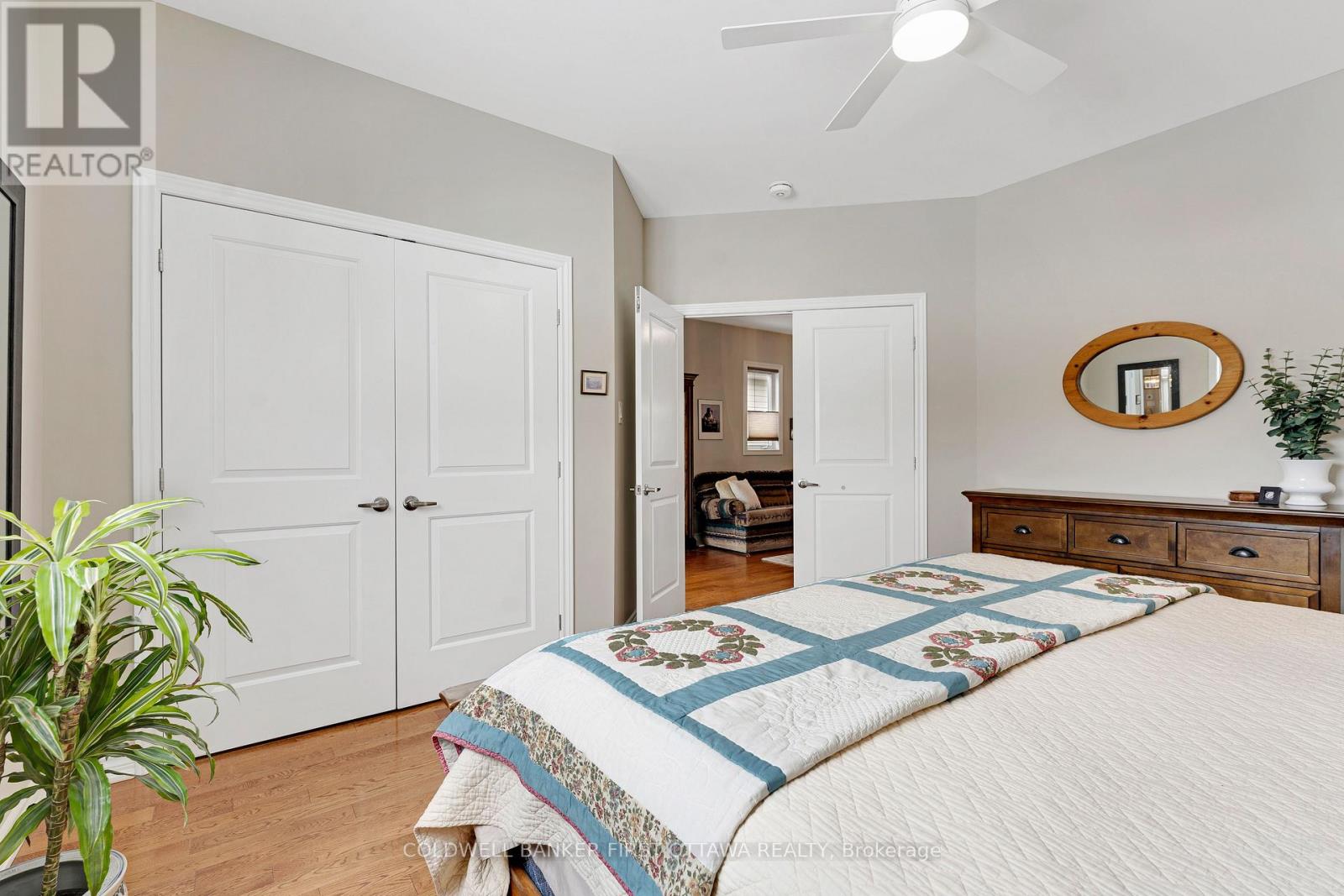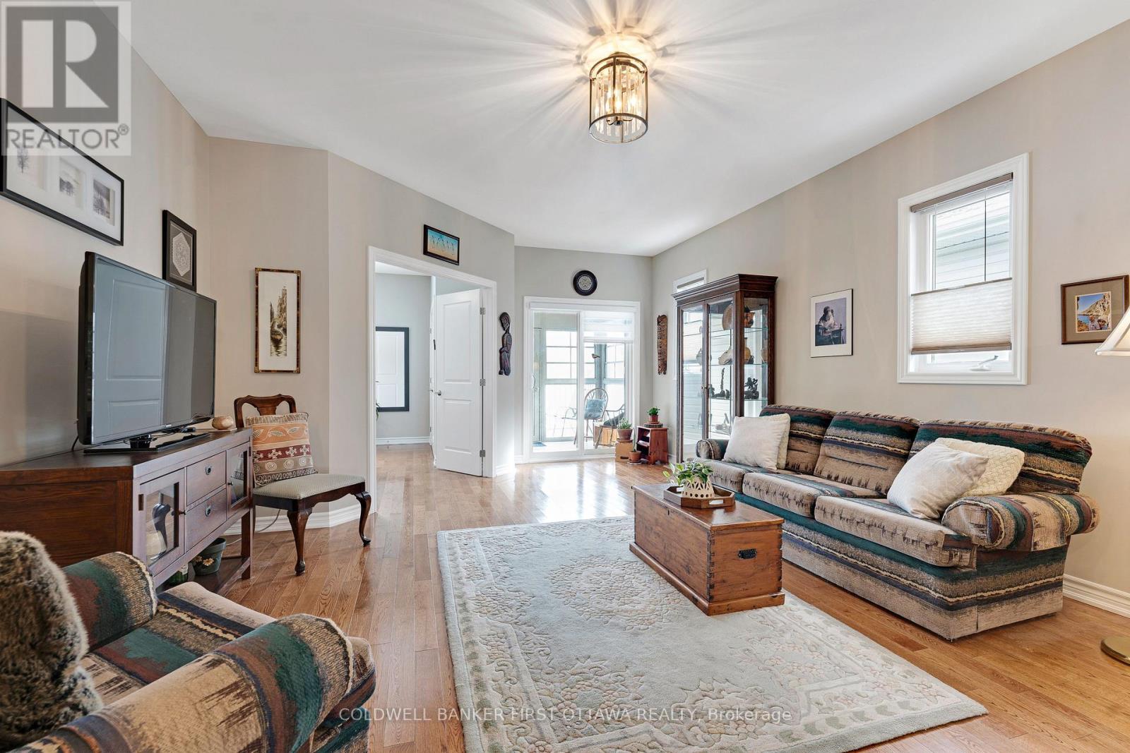 Perth has a way of staying with you. The slower pace, the limestone architecture, the sense that a good life is still lived at a human scale. Perthmore was built with that understanding, and it shows in this lovely 2017 townhome. Inside, the main floor is designed for effortless single-floor living. The primary bedroom and its ensuite are steps from the kitchen, the laundry is on the same level, and the hardwood floors and tile run throughout without a threshold in sight. Large windows with custom blinds pull in natural light across the open floor plan. The kitchen anchors the space with quartz countertops and Fisher & Paykel appliances. The screened Sunspace porch extends your living season without requiring a jacket. Downstairs, a finished lower level adds meaningful flexibility: a second bedroom with walk-in closet and a full bath make it a proper guest suite, a home office with privacy, or a comfortable space for family when they visit. Step out from the lower level onto the sunken patio, where privacy fencing creates a sheltered outdoor room. Beyond it, manicured garden beds carry colour and texture through the seasons, ready to enjoy without demanding your weekend. Past the property line, a nature park and pond is planned that will permanently protect that green horizon. Outside, the brick and vinyl exterior asks little of you, while the attached garage and double-wide driveway handle the practical realities comfortably. Perthmore townhomes surface infrequently - this corner of Perth has earned its reputation quietly, through people who chose it and stayed. Book your showing today to come walk through your new home! (id:64974)