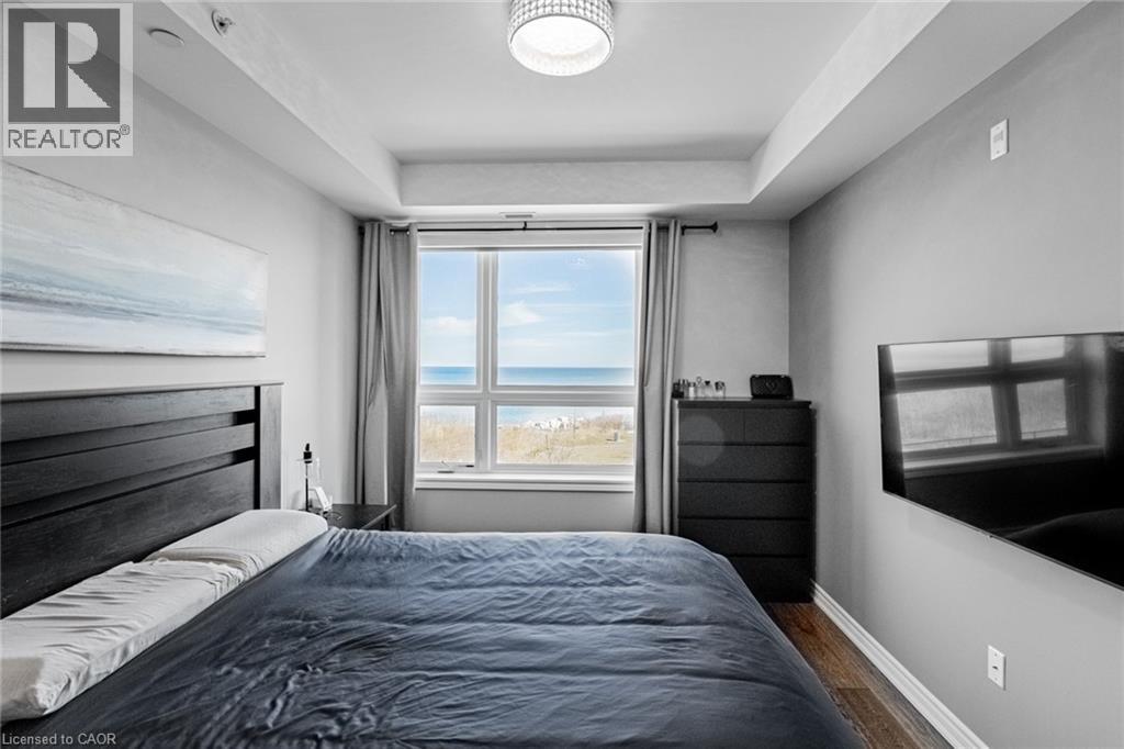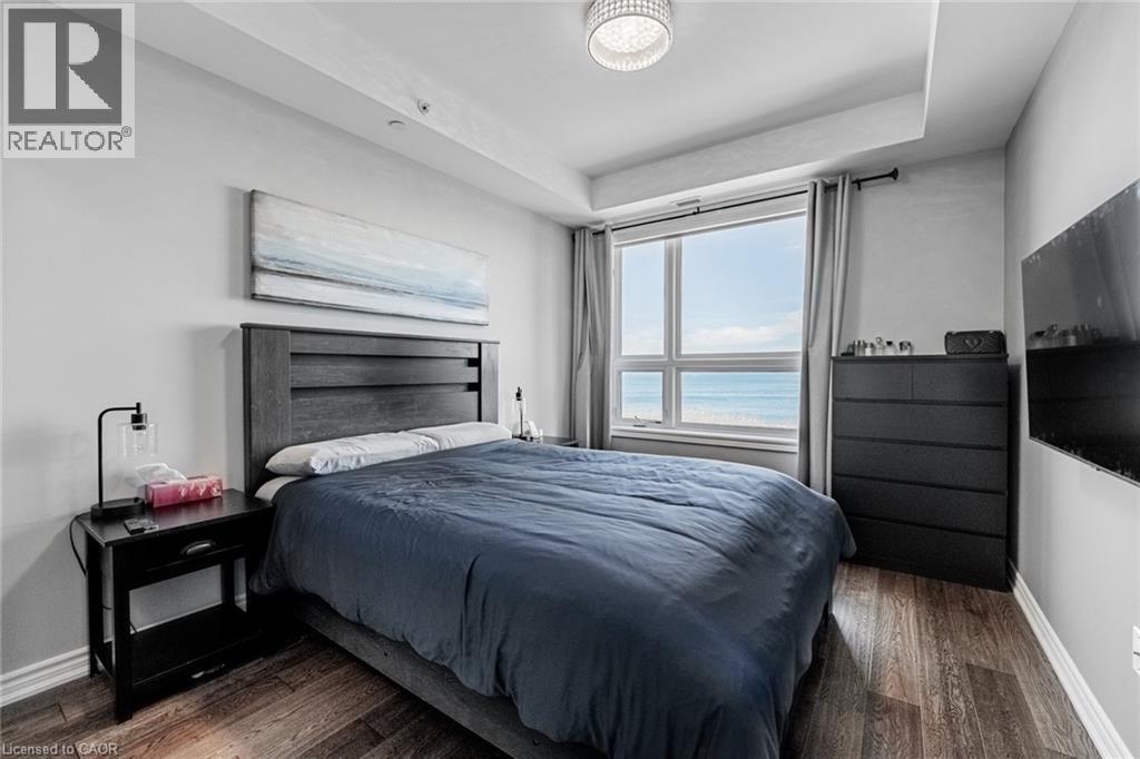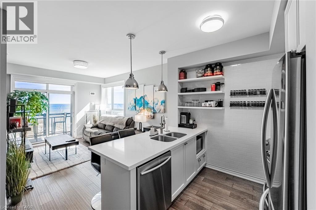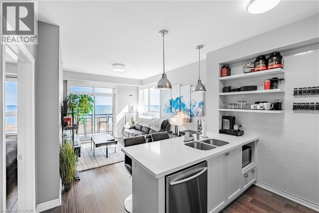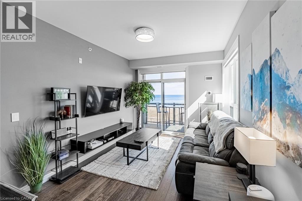 Wake up to breathtaking, unobstructed views of Lake Ontario right from your living room, primary bedroom, and private balcony! Welcome to Waterfront Trails - one of Stoney Creek's most sought-after boutique lakeside communities. This stunning 2-bedroom corner unit is bright, modern, and move-in ready, with natural light pouring in throughout the day. The open-concept layout features beautiful hand-scraped hardwood flooring, a sleek white kitchen with stainless steel appliances, quartz countertops, upgraded pendant lighting, and a breakfast bar island - perfect for morning coffee or entertaining guests. Both bedrooms are generously sized, with the primary bedroom capturing those gorgeous lake and Toronto skyline views. The updated 4-piece bathroom is clean and contemporary. Step outside to your private balcony and let the sound of the water do the rest. This building is heated and cooled by geothermal - while fees are listed as excluding heat, A/C & hydro, there are no gas or traditional energy costs; only minimal hydro for the air handling unit. Building amenities include a spectacular rooftop terrace with panoramic lake and escarpment views, a well-equipped fitness centre, party room, bike storage, and ample visitor parking. Walking trails and beach access are right at your doorstep, with quick and easy access to the QEW and all local amenities. Don't miss this one! (id:64974)