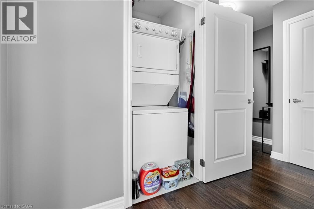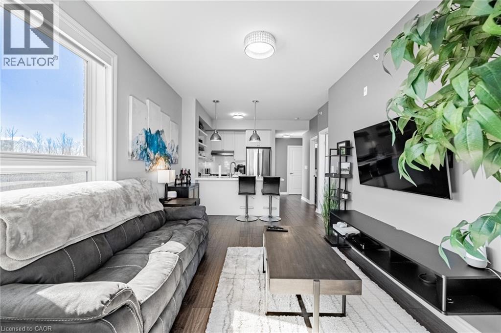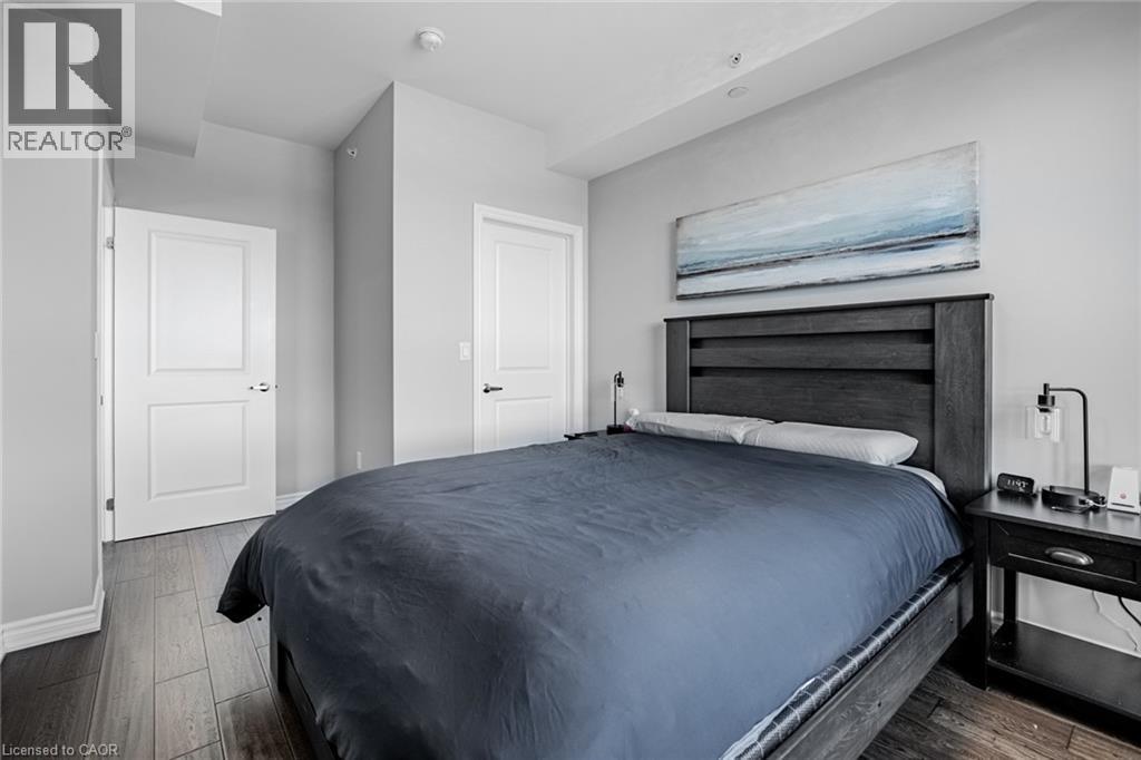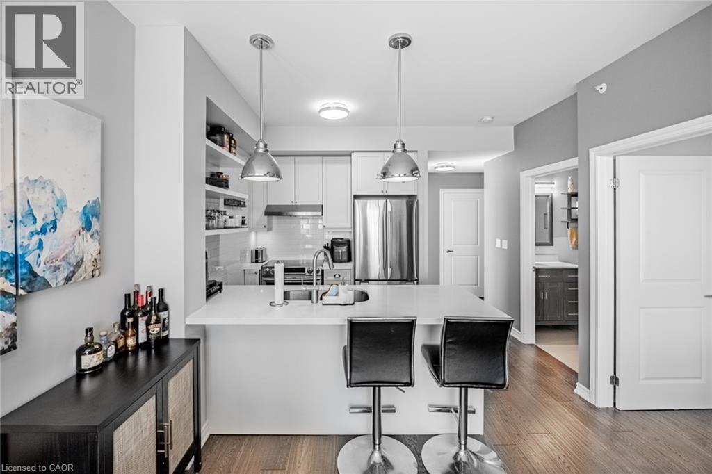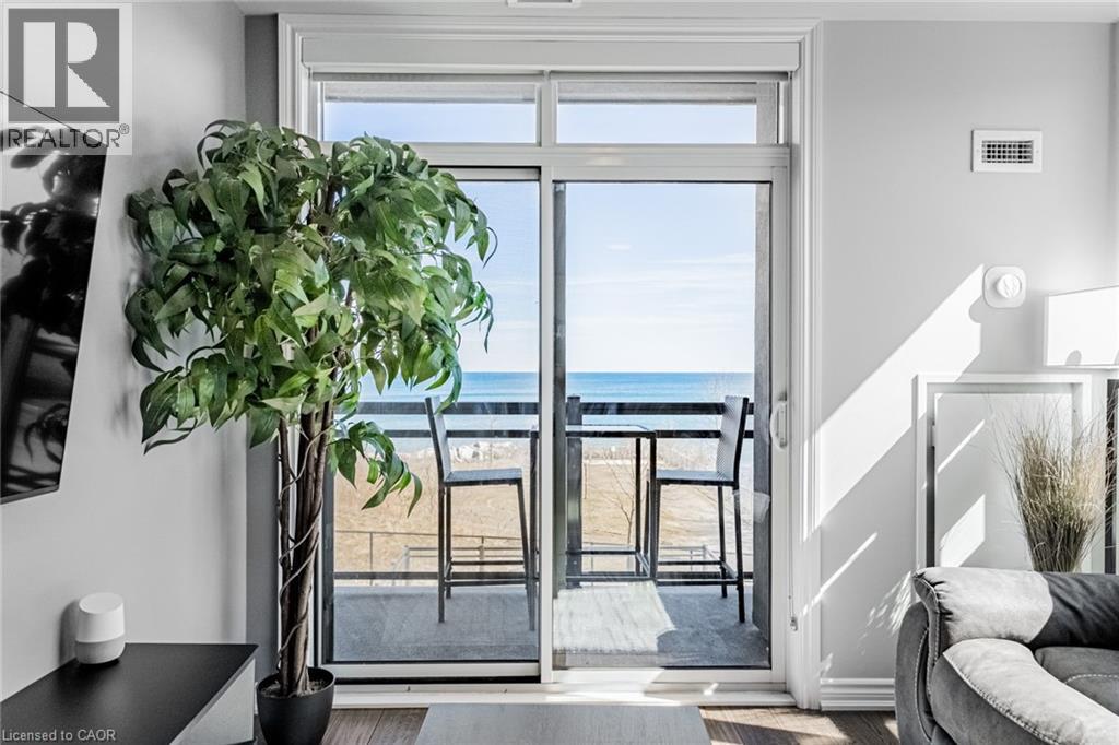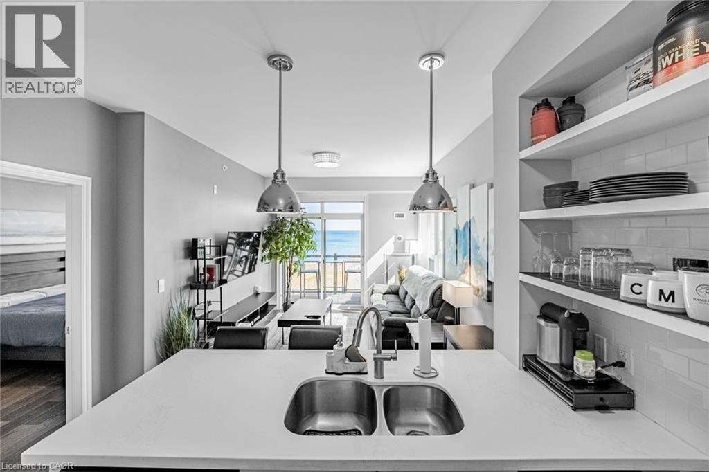 Wake up to breathtaking, unobstructed views of Lake Ontario right from your living room, primary bedroom, and private balcony! Welcome to Waterfront Trails - one of Stoney Creek's most sought-after boutique lakeside communities. This stunning 2-bedroom corner unit is bright, modern, and move-in ready, with natural light pouring in throughout the day. The open-concept layout features beautiful hand-scraped hardwood flooring, a sleek white kitchen with stainless steel appliances, quartz countertops, upgraded pendant lighting, and a breakfast bar island - perfect for morning coffee or entertaining guests. Both bedrooms are generously sized, with the primary bedroom capturing those gorgeous lake and Toronto skyline views. The updated 4-piece bathroom is clean and contemporary. Step outside to your private balcony and let the sound of the water do the rest. This building is heated and cooled by geothermal - while fees are listed as excluding heat, A/C & hydro, there are no gas or traditional energy costs; only minimal hydro for the air handling unit. Building amenities include a spectacular rooftop terrace with panoramic lake and escarpment views, a well-equipped fitness centre, party room, bike storage, and ample visitor parking. Walking trails and beach access are right at your doorstep, with quick and easy access to the QEW and all local amenities. Don't miss this one! (id:64974)