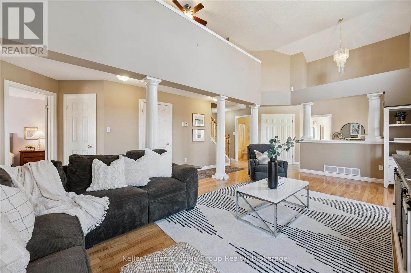 Welcome to 35 Thornton Street - a bright and spacious freehold bungaloft offering exceptional value in one of Guelph's most convenient east-end locations. This special end unit is flooded with natural light and features nearly 1,900 sq ft above grade, a great floorplan and function storage. Designed for flexible, main-floor living, the layout includes soaring cathedral ceilings, an open-concept living/dining space, and a versatile main-floor second bedroom or den - perfect for guests, a home office, or a second living zone. The upper level offers a private retreat with an additional bedroom and full bathroom, ideal for multi-generational living or those wanting separation of space. The attached double car garage, full unfinished basement, and low-maintenance exterior add practicality, while the location delivers everyday convenience: steps to public transit, parks, schools, and community amenities, with quick access to major routes. Well maintained and truly move-in ready, this home is an ideal option for downsizers, professionals, or anyone seeking the ease of main-floor living without sacrificing space. Quick closing available. (id:64974)