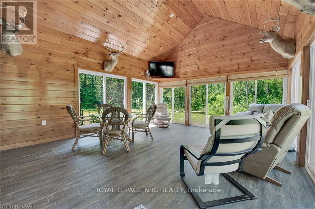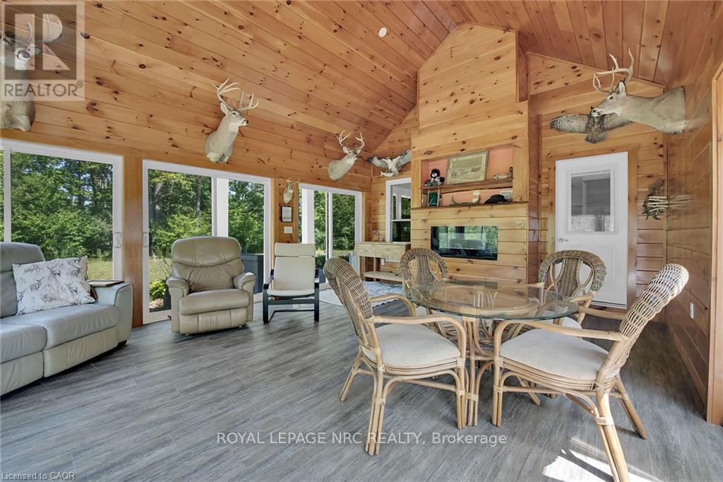 Perfect country package! Rare opportunity to own a secluded 52-acre multi-purpose property, frequented by deer, wild turkeys, rabbits, and various bird species. The land comprises mature forest and wetlands, including maple, ash, and oak trees, with nature trails and road frontages on three sides for privacy. The property features a 1,436 sq ft bungalow, custom built in 2020, with two main floor bedrooms, two and a half bathrooms, and an unfinished basement suitable for additional living space and more bedrooms. Additional structures include a 50'x30'x18' workshop equipped with a car hoist, suited for hobbyists or contractors. The main floor has an open concept with a cathedral ceiling finished in tongue-and-groove pine, an eat-in kitchen with custom maple cabinetry, quartz countertops, a bay window, and stainless-steel appliances. The living room includes a wood fireplace, scraped hardwood floors, and patio doors to a rear deck overlooking the aerated pond and wooded area. The great room provides panoramic outdoor views through wall-to-wall sliding patio doors, a cathedral pine ceiling, and an electric fireplace. Both main floor bedrooms are spacious; the principal bedroom has an ensuite, walk-in closet, and deck access. The basement contains laundry facilities, a utility room, storage, and roughed-in plumbing for bathrm with sewage ejector. Notable amenities include a hi-eff propane furnace, central air, a 2,500-gal water cistern, indoor and outdoor sump pumps, a modern septic system, and 100-amp electrical service. The property is situated on a year-round paved road in a tranquil setting surrounded by a serene forest, with landscaped grounds, vibrant perennial gardens, and a large driveway that can accommodate multiple vehicles and a boat or RV. Located near Dunnville's amenities, it is within a 30-60 minute drive to Hamilton and Niagara. This property offers a cottage-like ambiance for those interested in outdoor recreation and nature! (id:64974)