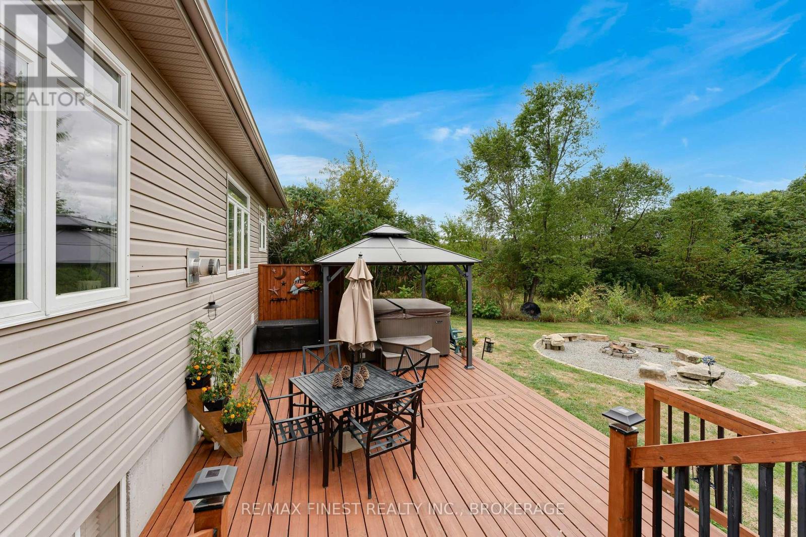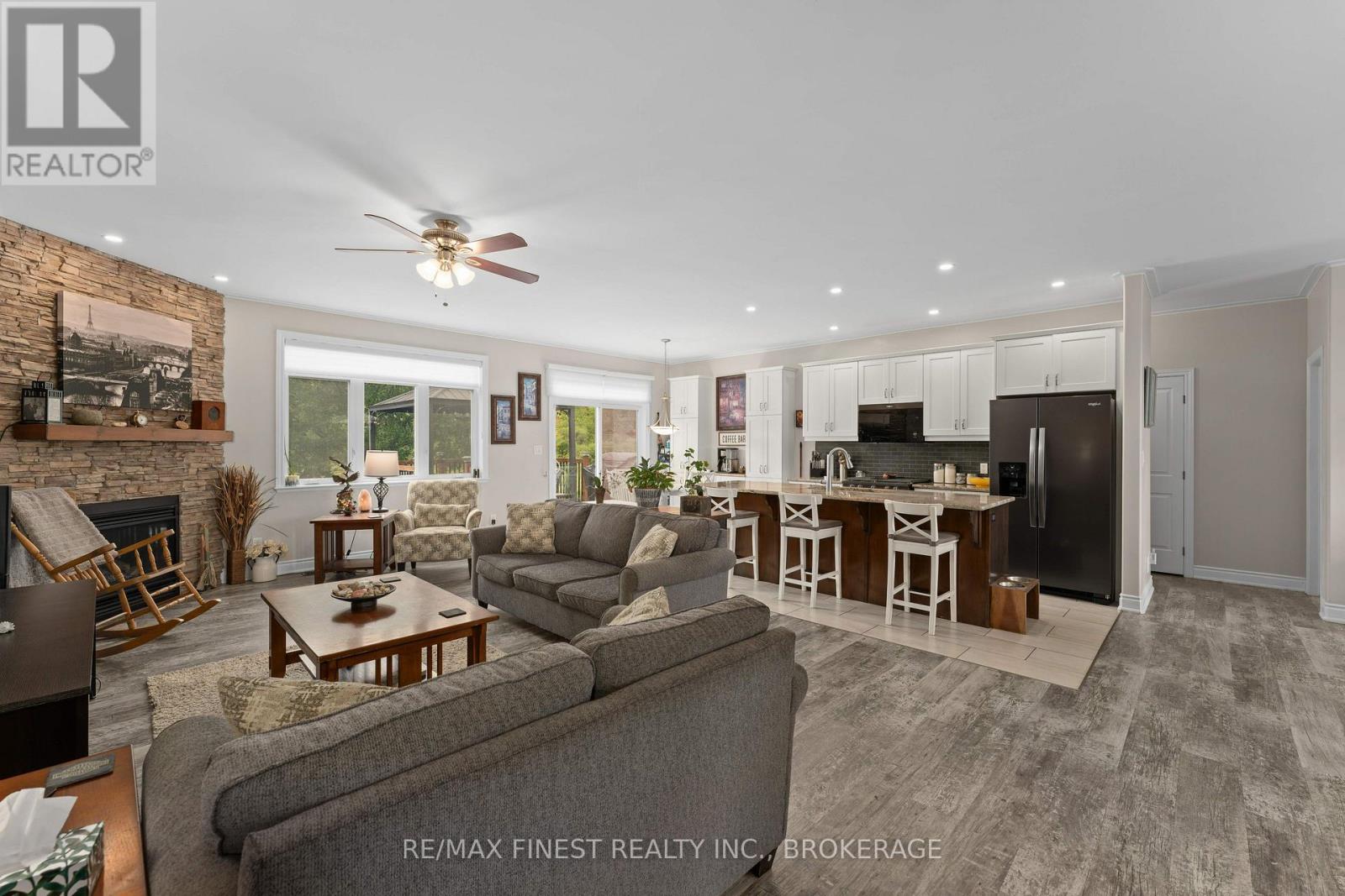 WOW!!! This absolutely loaded 4 Bed 3 Bath 2 Kitchen custom built bungalow with apx 3000 SQ' of finished living space on 3acres with walking/ ATV trails, gardens and a pond, just 10 minutes from the 401, features a gorgeous open concept design on the main floor with a large and bright custom kitchen with granite countertops and brand new high end stainless steel appliances flowing to the living room with gas fireplace and back deck with gazebo overlooking the pool and quiet green space, 3 spacious bedrooms including a huge primary bedroom with luxury ensuite and walk in closet. The lower level offers an incredible fully loaded IN-LAW SUITE with full height ceilings, a second large custom kitchen, pot lights, a ground level walkout to a private covered patio and side yard. Not to mention a loft in the fully insulated and heated garage, a Cummins generator, 2 firepits, 2gazeb (id:64974)