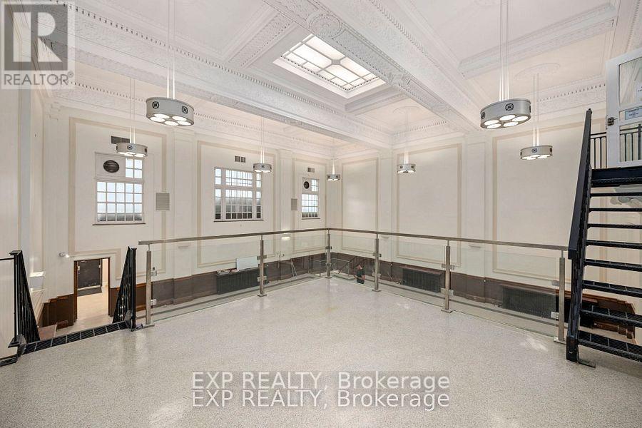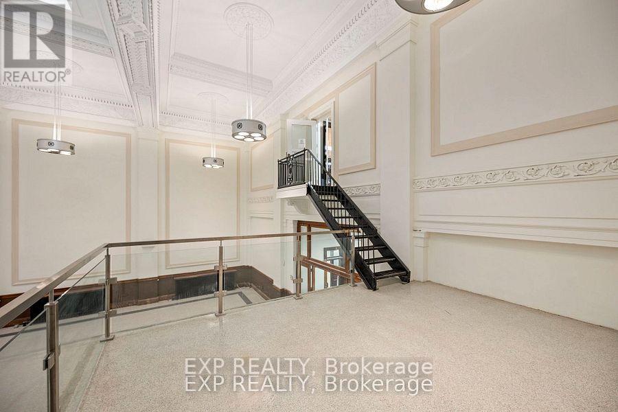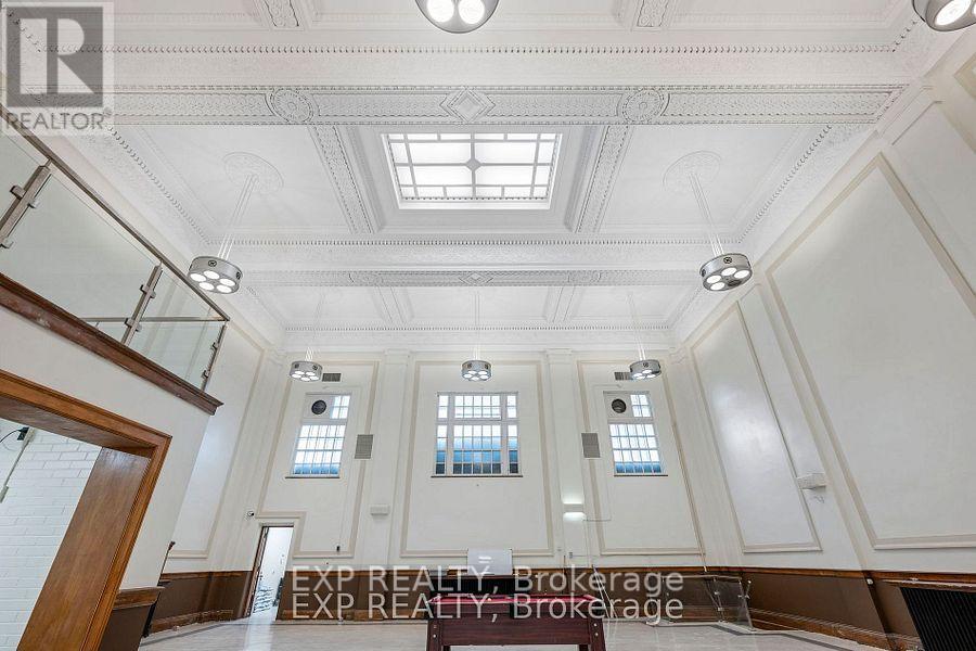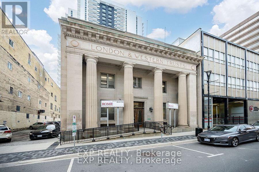 Prime opportunity to launch your business in a piece of Londons history! This beautifully restored circa-1920 heritage bank building offers 6,182 SF above grade. Ideally situated in the heart of downtown London just steps from Budweiser Gardens and Covent Garden Market, the property enjoys exceptional pedestrian and event traffic. Interior highlights include elegant plaster vaulted ceilings, all-new LED lighting throughout the main and upper levels, and a 14 ft x 14 ft open mezzanine landing that overlooks the grand main area. The layout features a fully refurbished 50' x 12' kitchen at the rear, two spacious front offices, two main floor washrooms, and three large offices on the upper floor, including a grand presidential office. The building also includes three operational vaults and dual entrances from both King and Richmond Streets. Private rear parking for up to eight vehicles is included. Zoned DA1, the property allows for a wide range of uses including assembly halls, art galleries, commercial recreation, financial institutions, museums, studios, restaurants, and more. Offered at $13/SF net plus $6/SF additional rent, totalling $9,788/month plus HST and utilities. An additional 4,300 SF lower level is also available for lease if desired, with rates to be negotiated. (id:64974)