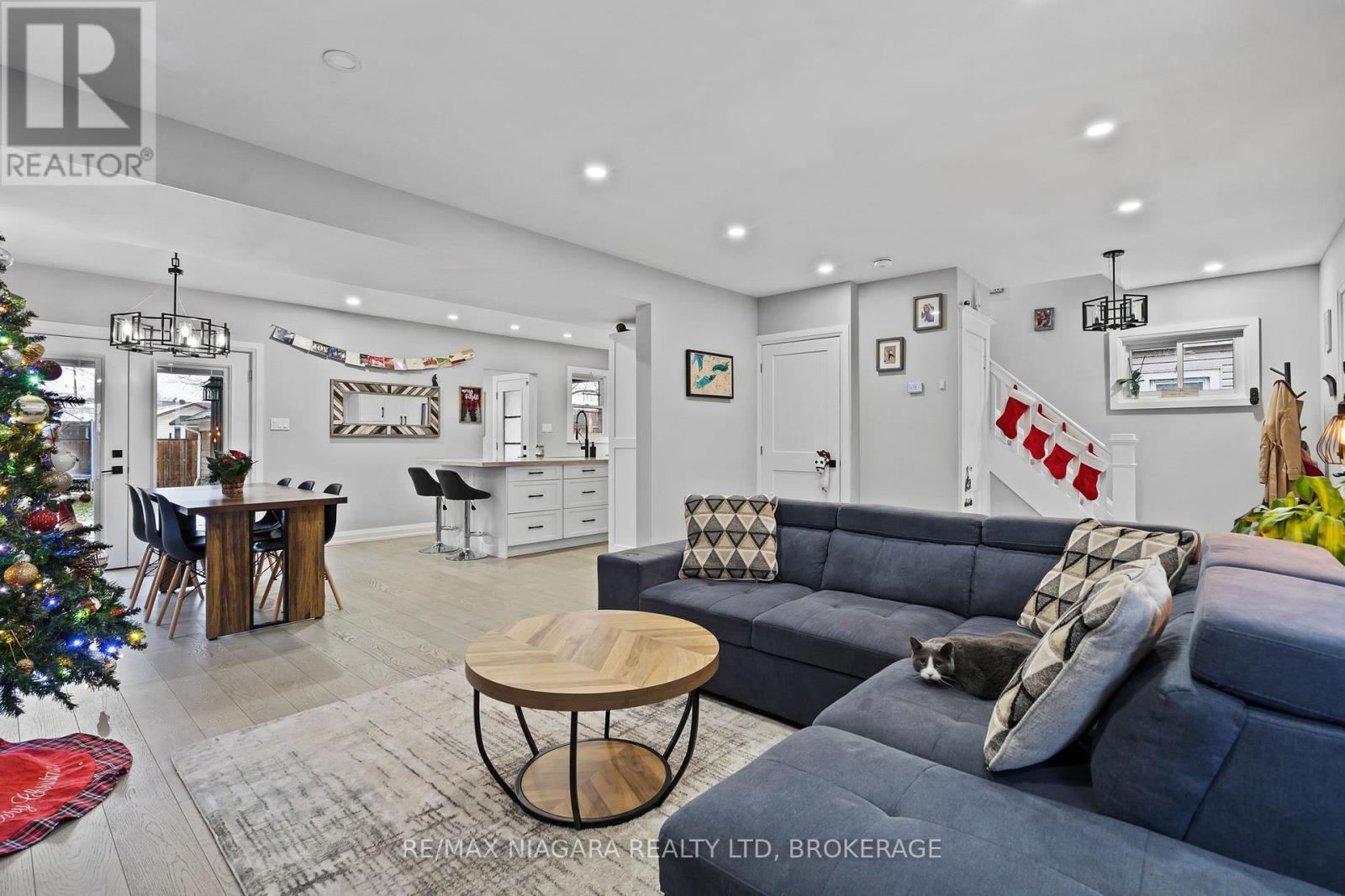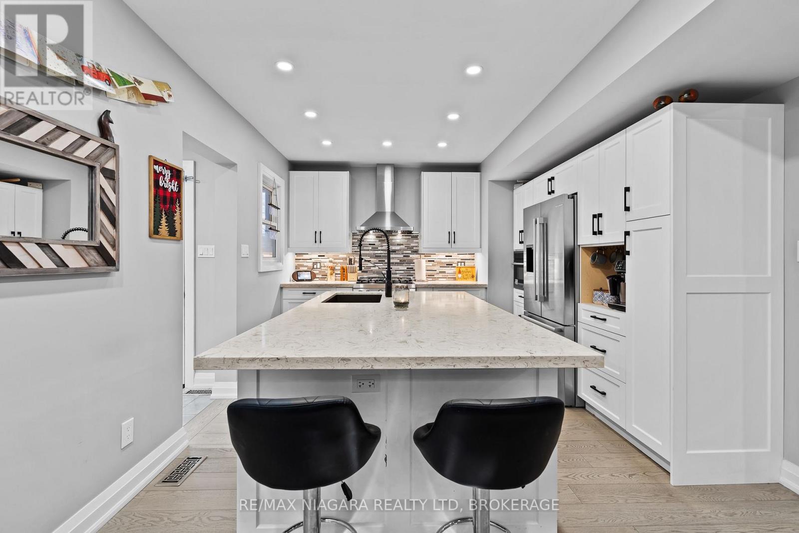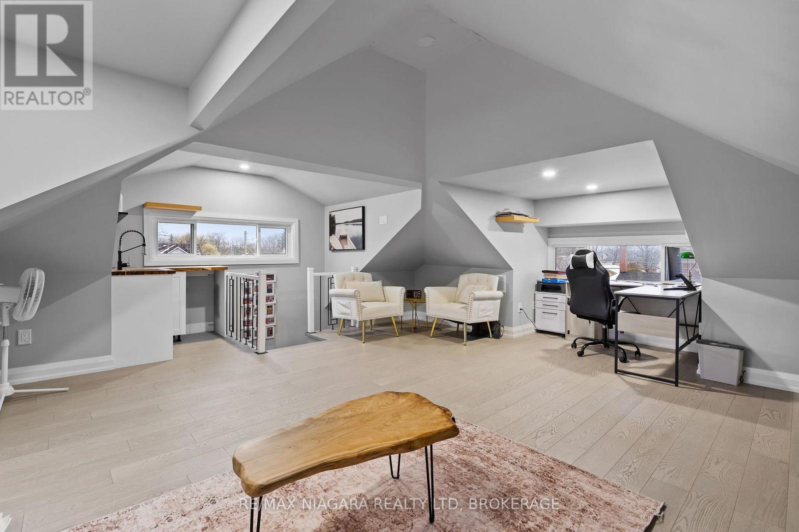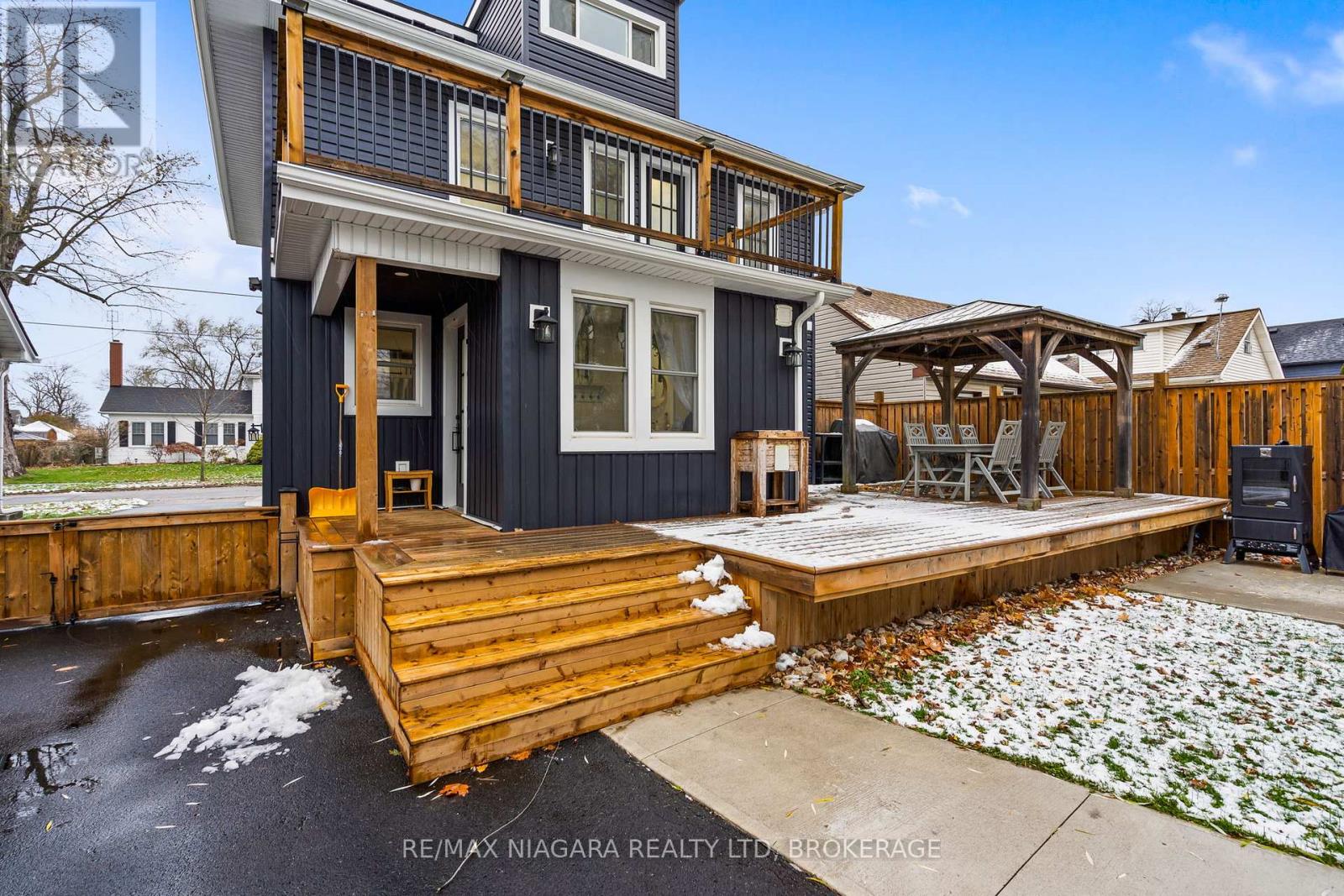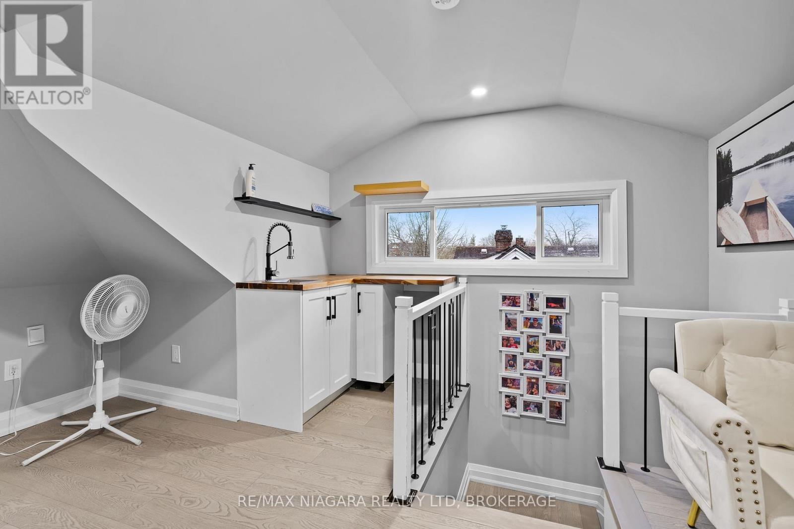 Beautifully renovated top to bottom, this gorgeous 2.5-storey character home in the heart of Chippawa showcases true pride of ownership throughout. The home welcomes you with an asphalt driveway and a stunning new wood front porch, leading inside to a porcelain tile entryway and engineered hardwood flowing through the living and dining areas. The custom kitchen features quartz countertops, a massive quartz island with sink, stainless steel appliances, and pot lights throughout on smart switches, offering an ideal layout for everyday living and entertaining. A convenient mudroom with side entry and a 2-piece bath completes the main floor, while the dining room opens to a backyard deck with gazebo. The second level offers an updated 4-piece bathroom with tub/shower and rain head, two additional bedrooms, and a primary suite with walk-out deck, large walk-in closet with custom cabinetry, and a beautiful 3-piece ensuite with glass shower and rain head. A staircase in the second bedroom leads to a fully finished loft ideal as an additional bedroom, office, playroom, or studio, complete with its own sink/kitchenette area. The basement has been thoughtfully cleaned out and refreshed, with previous insulation and vapour barrier professionally removed, walls treated as a preventative measure, and all walls, floors, and stairs freshly painted, offering a clean and functional storage or utility space. The fully fenced backyard includes a double garage with 60-amp service, water, and sewer-perfect for a workshop or hobby space. A truly exceptional home in an incredible community! (id:64974)