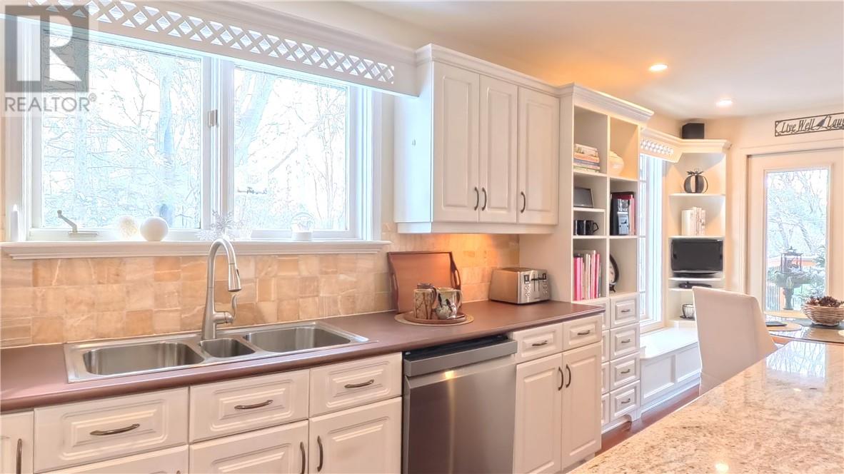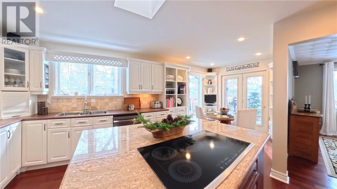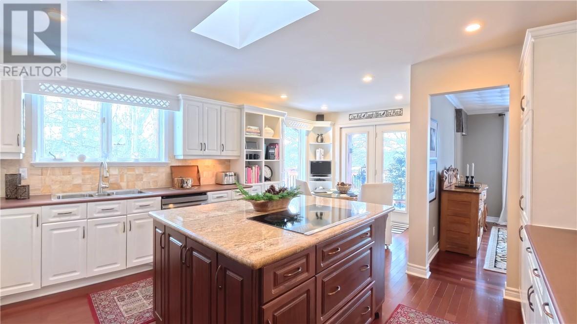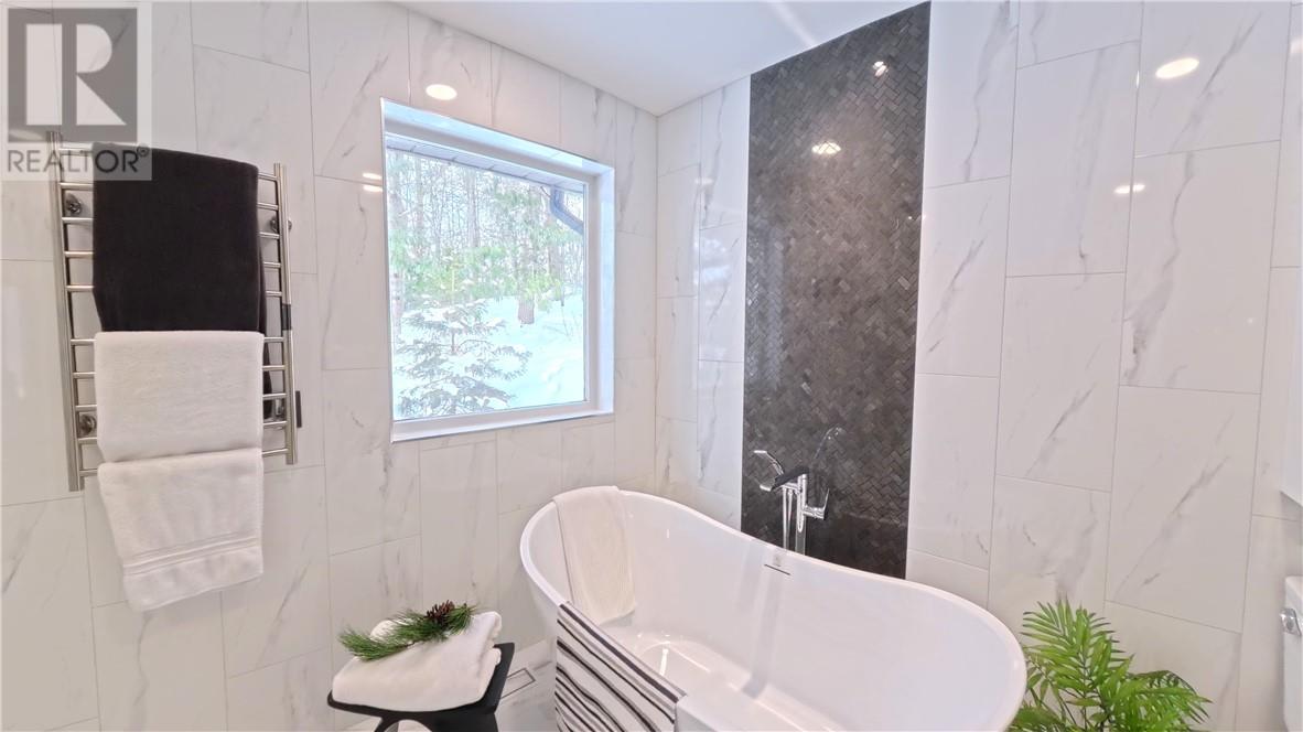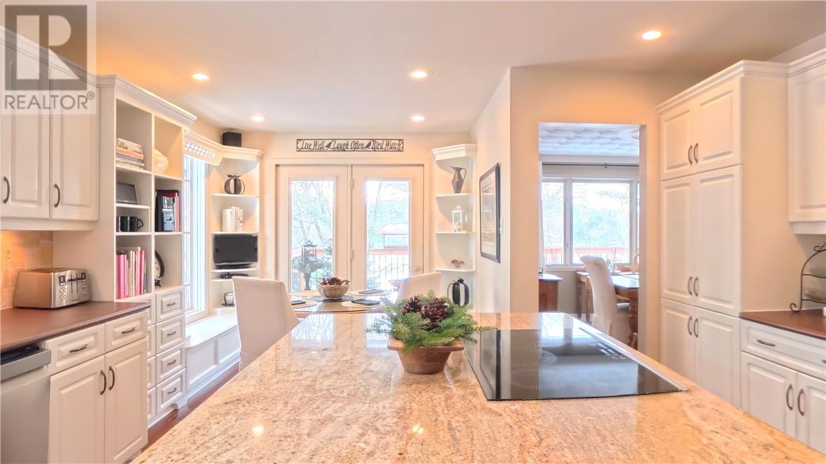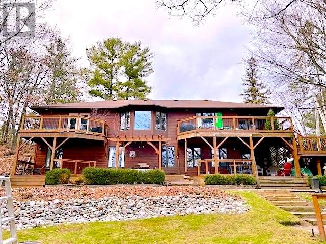 Welcome to 357 Clear Lake Drive, Espanola. Set on the shores of Clear Lake, this custom-built waterfront bungalow offers 3 bedrooms and 2.5 bathrooms in a private, extremely well landscaped setting with mature tree cover and terraced garden areas. The appeal starts with a curved driveway bordered by a stone retaining walls leading to an interlocking stone courtyard and stone steps to large front entry. The main level includes a bright eat-in kitchen with huge quartz island and quality appliances (refrigerator, stove, wall oven, induction cooktop, microwave, built-in dishwasher), a dining area and a large living room with lake views and built in propane fireplace. The primary bedroom overlooks the water and features built-in closets, private deck access and a renovated en suite with soaker tub, walk-in shower and in-floor heating. Main floor laundry with full-size LG stainless steel washer and dryer and a powder room add to overall convenience. The fully finished lower level offers a family room with lake-facing windows and propane fired stone fireplace, two additional bedrooms, 4-piece bath, office/den, wet bar with bar fridge, workshop, storage, and walk-out access to a full-width deck. Outdoor features include multiple decks, interlocking pathways, terraced lawns, and stairs leading to the water. A floating dock provides direct lake access for swimming and boating. Constructed with 2x6 framing and 2x12 floor joists, the home also includes attached double garage. Meticulously maintained waterfront home offering functional space, south facing lake front, and year-round enjoyment. A truly special offering at a great price! (id:64974)