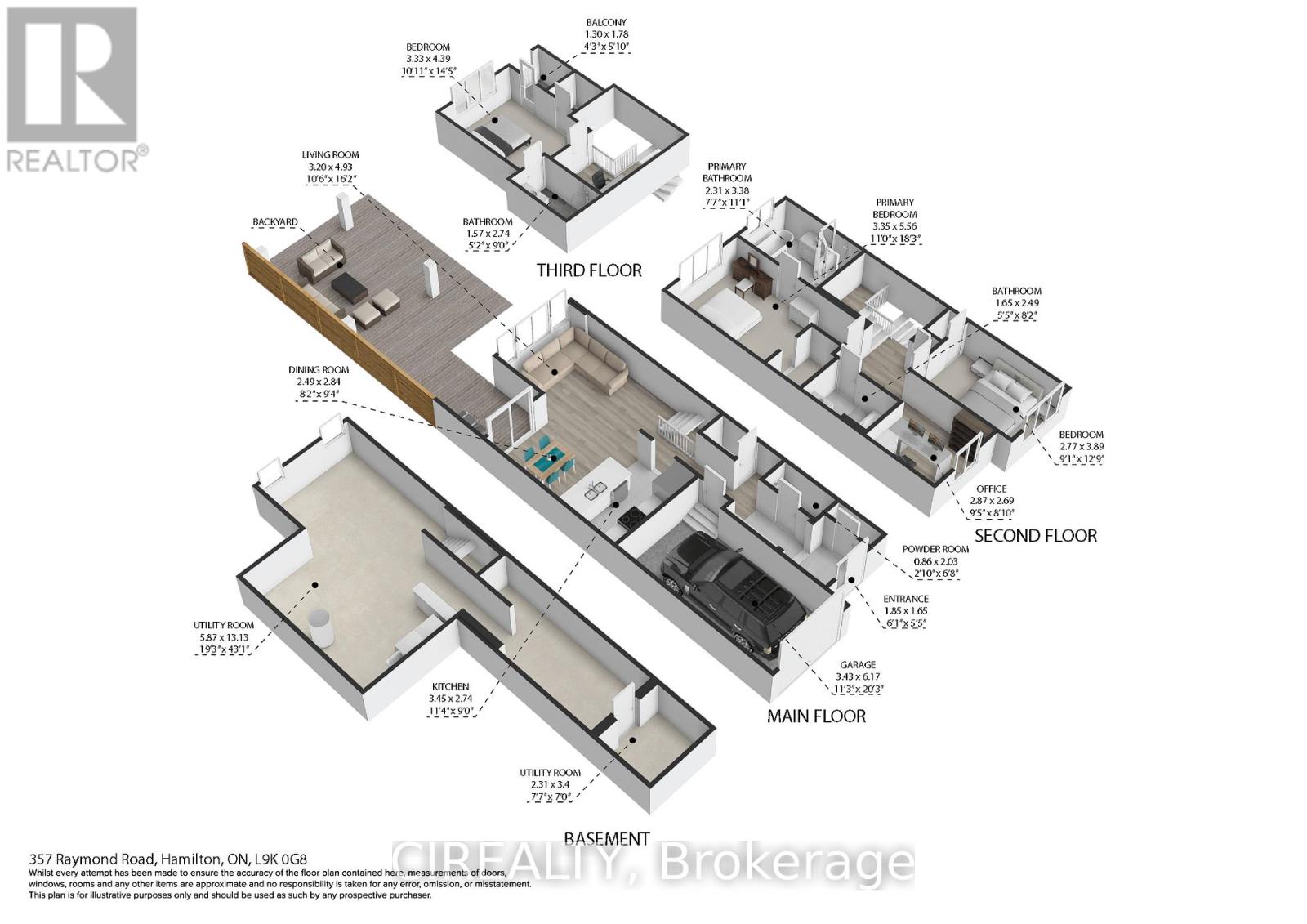Welcome to this stunning, recently built executive townhome in the heart of Ancaster with a single-car garage. The main floor offers bright, open-concept living with a chef's kitchen featuring stainless steel appliances, quartz countertops, a peninsula with seating, and modern dark cabinetry. Enjoy the professionally upgraded deck, perfect for relaxing or entertaining, plus a convenient 2-piece bath and garage access. Upstairs, the primary retreat boasts a walk-in closet and spa-like ensuite, accompanied by a second large bedroom, full 4-piece bath, and dedicated office space. The third floor adds a versatile bonus suite with its own bedroom, ensuite, walk-in closet, and private balcony-ideal for guests or an alternative primary. An unfinished basement provides endless possibilities to customize. Just minutes from shopping, dining, schools, and amenities, this home combines style, comfort, and convenience-ready for you to move in and enjoy! (id:64974)