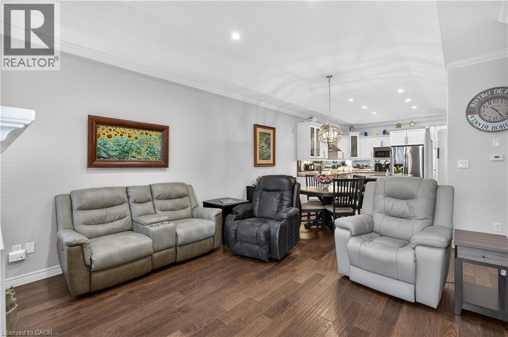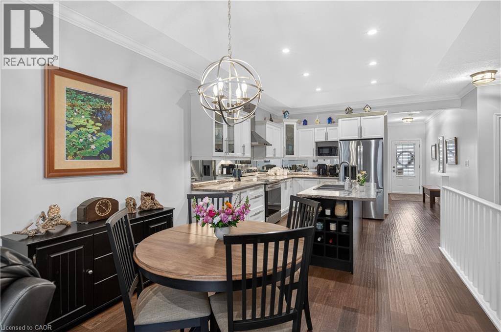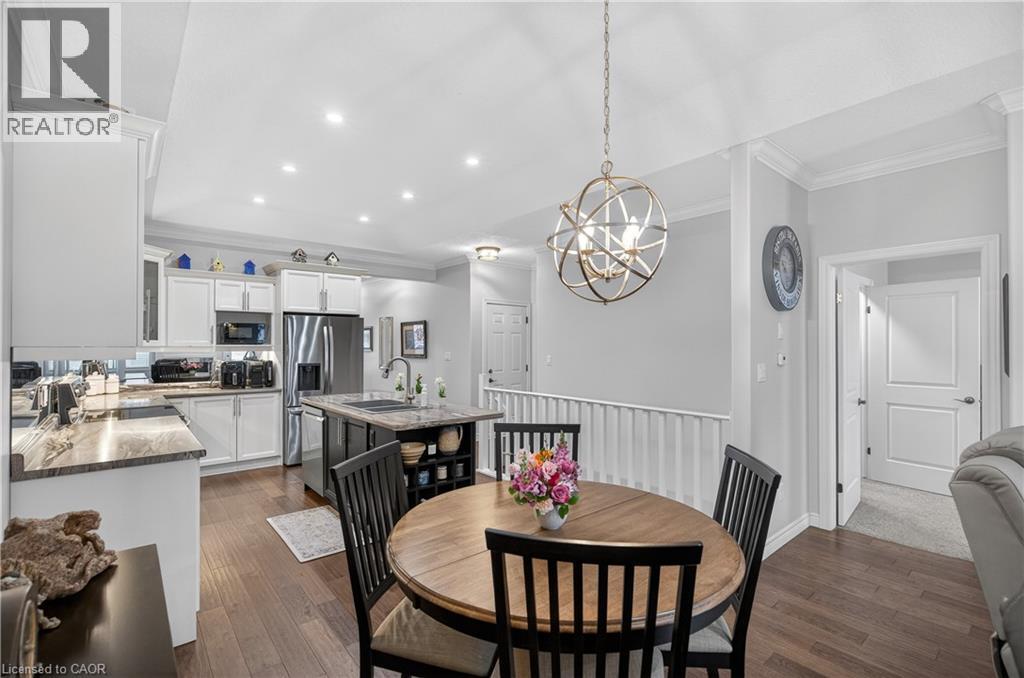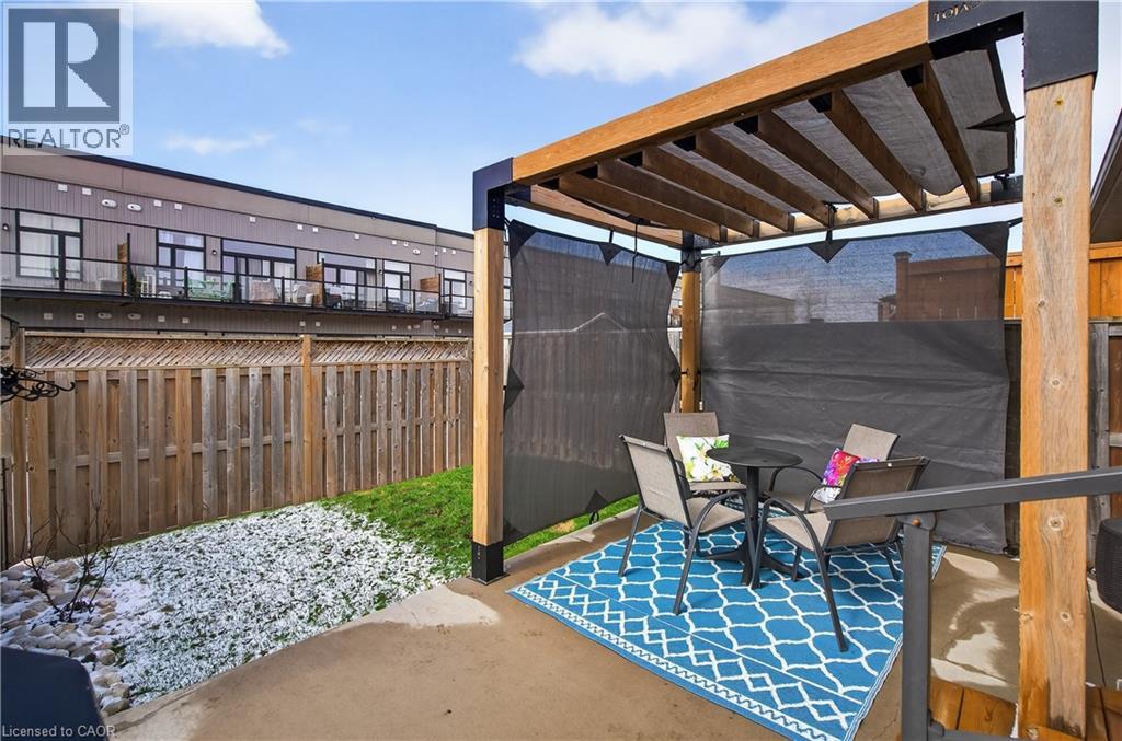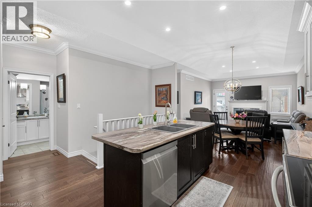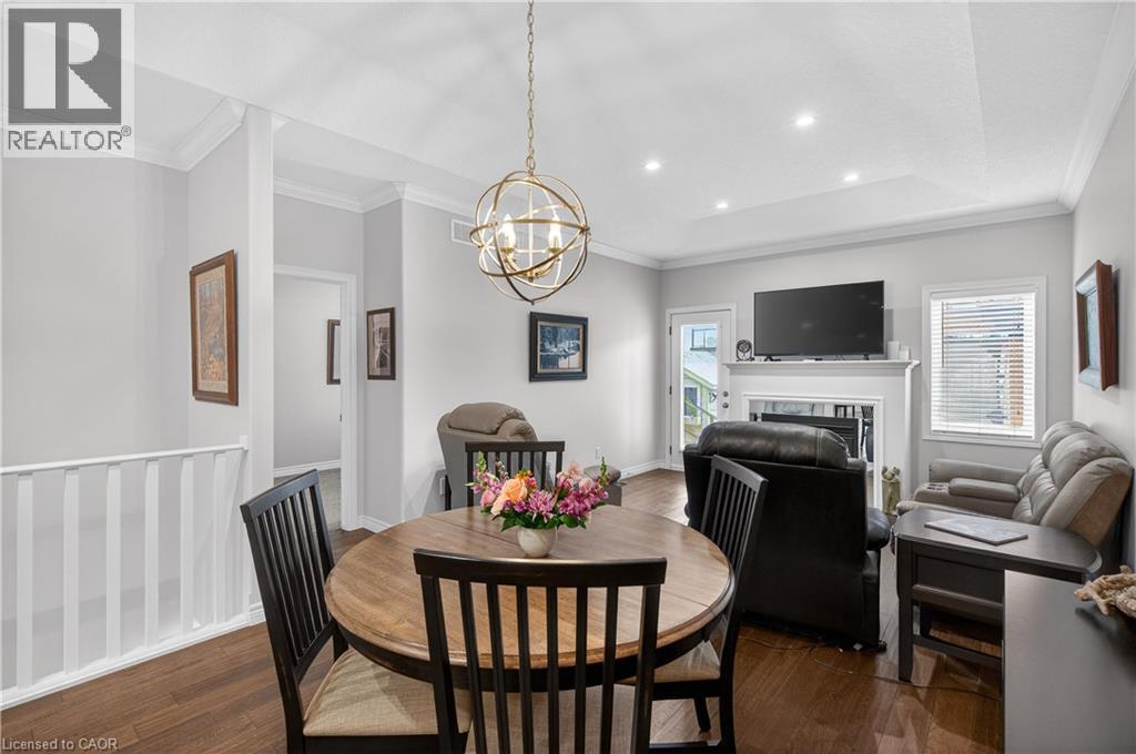 Premium end-unit freehold townhome in the vibrant City of Brantford. Beautifully appointed and meticulously maintained, this 2+1 bdrm, 2 bath residence offers an exceptional blend of style, comfort, & convenience. From the moment you arrive, the home’s striking facade featuring stone, stucco, and brick creates a lasting first impression, complemented by tasteful landscaping and a covered front porch. A spacious foyer welcomes you inside, complete with an oversized storage closet and a versatile front bdrm currently used as a home office. The heart of the home showcases an open-concept design, anchored by a spacious kitchen w/ upgraded white cabinetry, mirrored backsplash, S/S appliances including a new LG fridge & dishwasher ('24), undermount lighting, & a centre island w/ breakfast bar seating. A separate formal dining area flows seamlessly into the large liv rm, highlighted by a cozy gas FP & walkout to the private rear yard. The main lvl primary retreat offers ensuite privileges to a beautifully finished 4-pc bath, along w/ the convenience of main flr laundry. The f-fin lower lvl expands your living space w/ a generous rec rm feat an electric FP, a 3rd bdrm, & a 3-pc bath w/ an oversized glass walk-in shower. Step outside to enjoy a thoughtfully designed backyard complete with a pergola, privacy screens, sunshade, concrete patio, gas line for BBQ, storage shed, and grassy area. Noteworthy upgrades include updated lighting fixtures, LED pot lighting throughout the kitchen, dining, and living areas, garage door, laundry room cabinetry, and fresh paint on the main level. Crown moulding & hardwood flooring add a refined finish throughout. Located in a sought-after neighbourhood, this home offers easy access to parks, scenic trails, schools, shopping, and everyday amenities. Commuters will appreciate proximity to Hwy 403, while families benefit from a welcoming community atmosphere and nearby recreational facilities. A perfect balance of lifestyle and location. (id:64974)