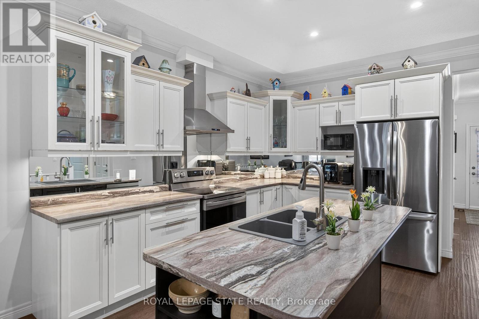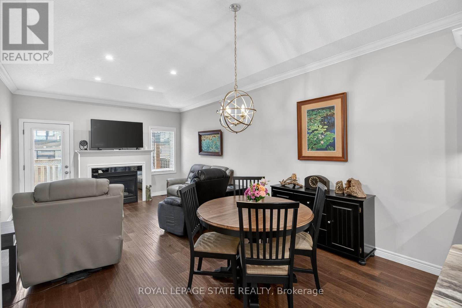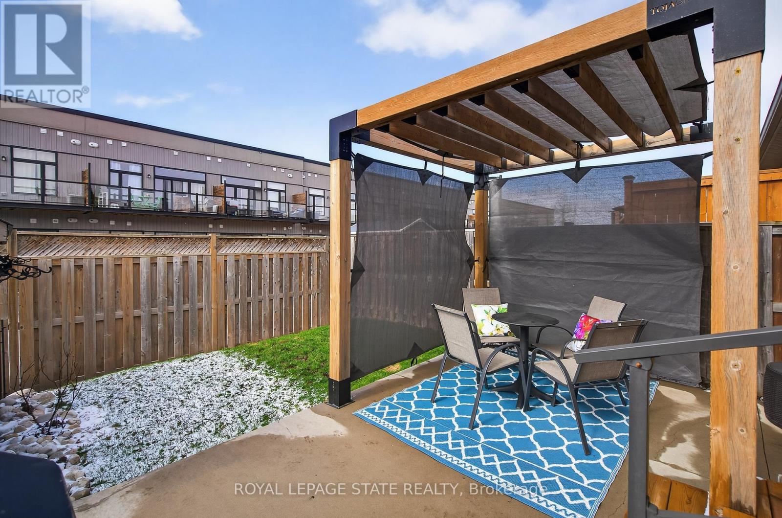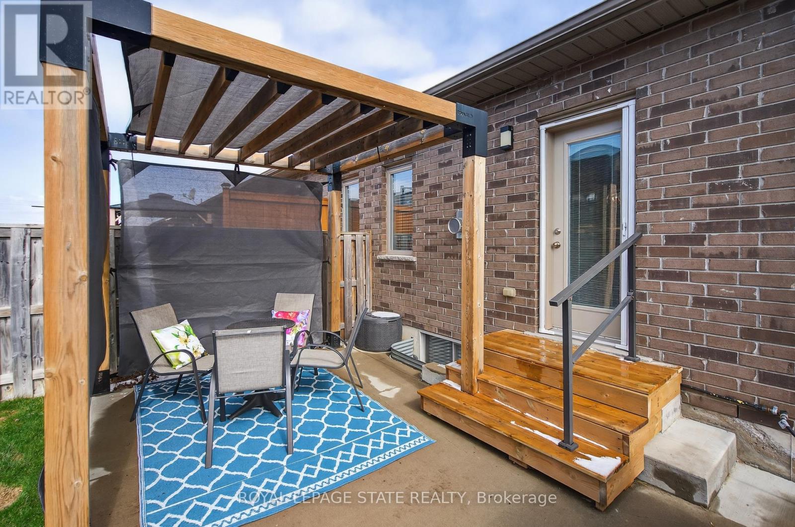 Premium end-unit freehold townhome in the vibrant City of Brantford. Beautifully appointed and meticulously maintained, this 2+1 bdrm, 2 bath residence offers an exceptional blend of style, comfort, & convenience. From the moment you arrive, the home's striking facade featuring stone, stucco, and brick creates a lasting first impression, complemented by tasteful landscaping and a covered front porch. A spacious foyer welcomes you inside, complete with an oversized storage closet and a versatile front bdrm currently used as a home office. The heart of the home showcases an open-concept design, anchored by a spacious kitchen w/ upgraded white cabinetry, mirrored backsplash, S/S appliances including a new LG fridge & dishwasher ('24), undermount lighting, & a centre island w/ breakfast bar seating. A separate formal dining area flows seamlessly into the large liv rm, highlighted by a cozy gas FP & walkout to the private rear yard. The main lvl primary retreat offers ensuite privileges to a beautifully finished 4-pc bath, along w/ the convenience of main flr laundry. The f-fin lower lvl expands your living space w/ a generous rec rm feat an electric FP, a 3rd bdrm, & a 3-pc bath w/ an oversized glass walk-in shower. Step outside to enjoy a thoughtfully designed backyard complete with a pergola, privacy screens, sunshade, concrete patio, gas line for BBQ, storage shed, and grassy area. Noteworthy upgrades include updated lighting fixtures, LED pot lighting throughout the kitchen, dining, and living areas, garage door, laundry room cabinetry, and fresh paint on the main level. Crown moulding & hardwood flooring add a refined finish throughout. Located in a sought-after neighbourhood, this home offers easy access to parks, scenic trails, schools, shopping, and everyday amenities. Commuters will appreciate proximity to Hwy 403, while families benefit from a welcoming community atmosphere and nearby recreational facilities. A perfect balance of lifestyle and location. (id:64974)