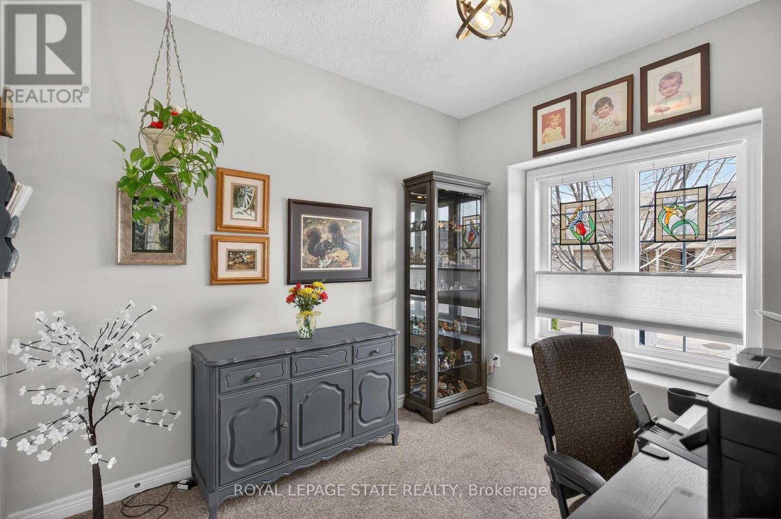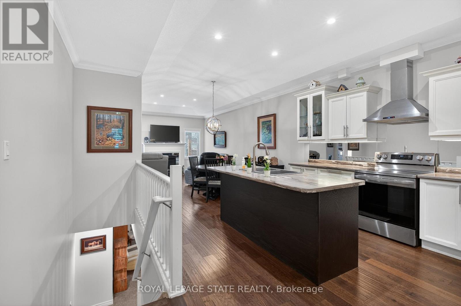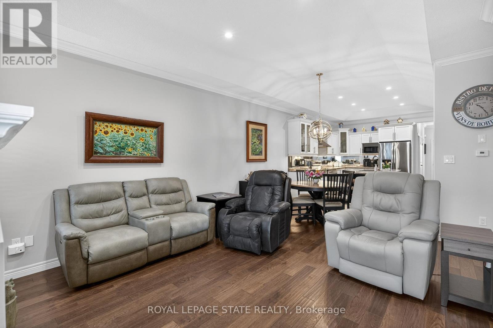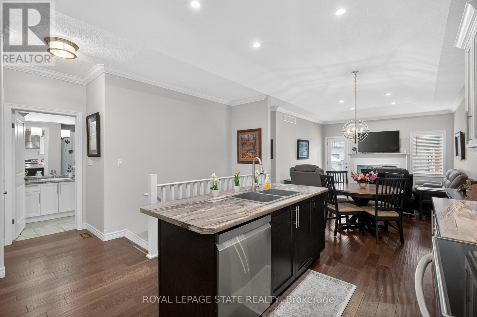 Premium end-unit freehold townhome in the vibrant City of Brantford. Beautifully appointed and meticulously maintained, this 2+1 bdrm, 2 bath residence offers an exceptional blend of style, comfort, & convenience. From the moment you arrive, the home's striking facade featuring stone, stucco, and brick creates a lasting first impression, complemented by tasteful landscaping and a covered front porch. A spacious foyer welcomes you inside, complete with an oversized storage closet and a versatile front bdrm currently used as a home office. The heart of the home showcases an open-concept design, anchored by a spacious kitchen w/ upgraded white cabinetry, mirrored backsplash, S/S appliances including a new LG fridge & dishwasher ('24), undermount lighting, & a centre island w/ breakfast bar seating. A separate formal dining area flows seamlessly into the large liv rm, highlighted by a cozy gas FP & walkout to the private rear yard. The main lvl primary retreat offers ensuite privileges to a beautifully finished 4-pc bath, along w/ the convenience of main flr laundry. The f-fin lower lvl expands your living space w/ a generous rec rm feat an electric FP, a 3rd bdrm, & a 3-pc bath w/ an oversized glass walk-in shower. Step outside to enjoy a thoughtfully designed backyard complete with a pergola, privacy screens, sunshade, concrete patio, gas line for BBQ, storage shed, and grassy area. Noteworthy upgrades include updated lighting fixtures, LED pot lighting throughout the kitchen, dining, and living areas, garage door, laundry room cabinetry, and fresh paint on the main level. Crown moulding & hardwood flooring add a refined finish throughout. Located in a sought-after neighbourhood, this home offers easy access to parks, scenic trails, schools, shopping, and everyday amenities. Commuters will appreciate proximity to Hwy 403, while families benefit from a welcoming community atmosphere and nearby recreational facilities. A perfect balance of lifestyle and location. (id:64974)