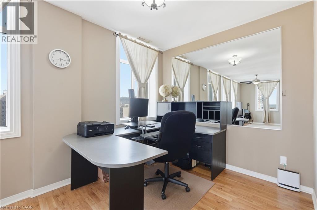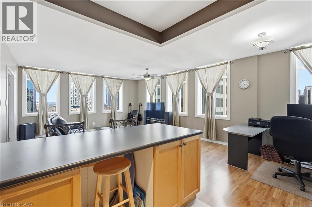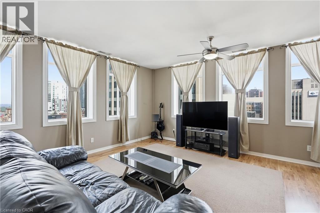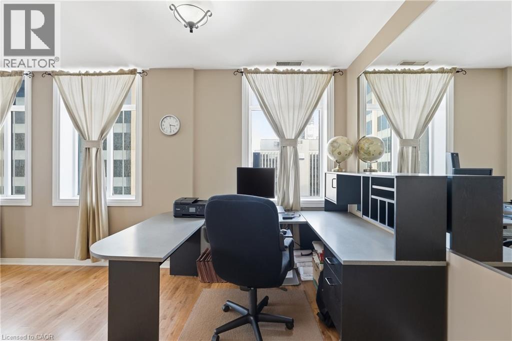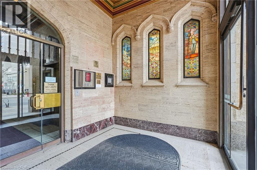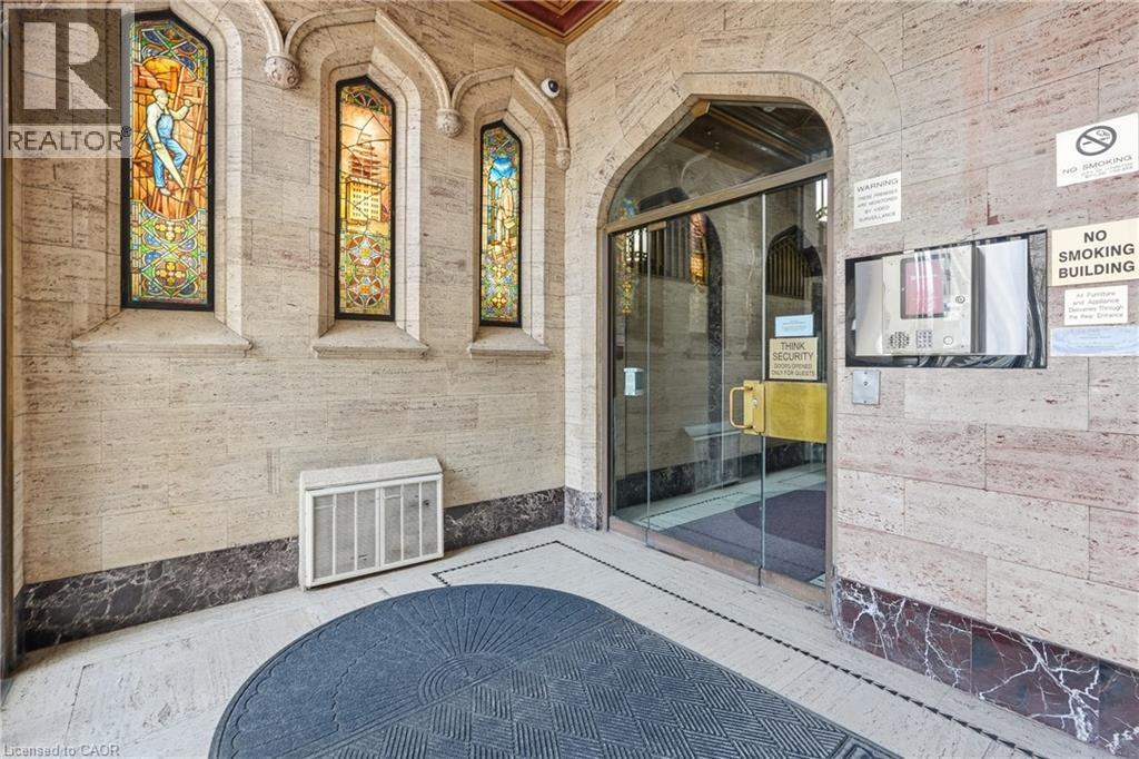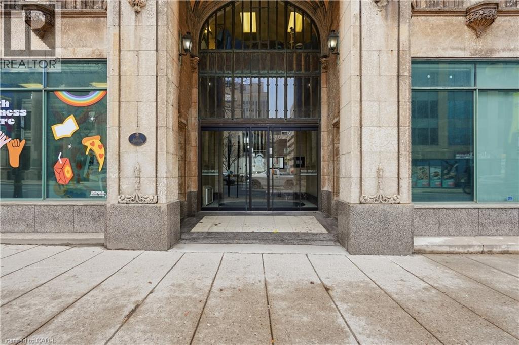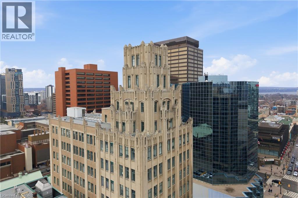 Own a piece of Hamilton’s history in the iconic Pigott building, the city’s first skyscraper, built in 1929 and celebrated for its art deco, gothic revival architecture and heritage designation. Converted to condominiums in 1996, this landmark seamlessly blends historic charm with modern urban living, offering amenities such as a fitness centre, billiards room, and party/meeting space. This rare corner suite features 9.5 ft ceilings, oversized windows, and breathtaking panoramic views of Hamilton bay, the city skyline, and the escarpment. The spacious layout is filled with natural light, creating a bright and airy atmosphere throughout. The primary bedroom offers a generous layout with a large walk-in closet, while the second bedroom, complete with French doors, is ideal as a home office, guest room, or gym. The open-concept living and dining area is perfect for entertaining while taking in the stunning views. Located in the heart of downtown Hamilton, this prime setting offers a fully walkable lifestyle just steps to top restaurants, entertainment, and cultural attractions. Additional features include full-size in-suite laundry and one parking space, with convenient access to HSR and GO Transit, the public library, Jackson Square, the Farmers’ Market, parks, McMaster University, and local hospitals all nearby. (id:64974)