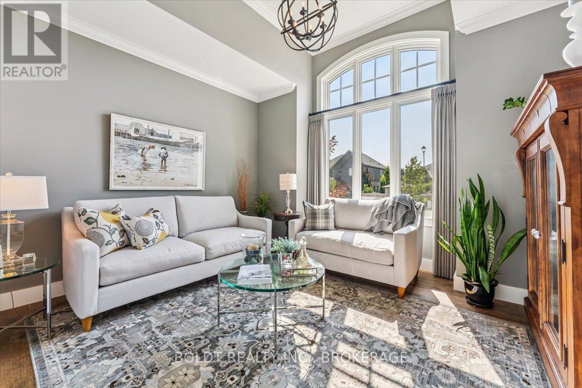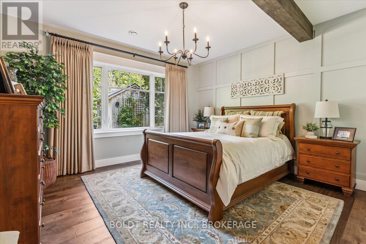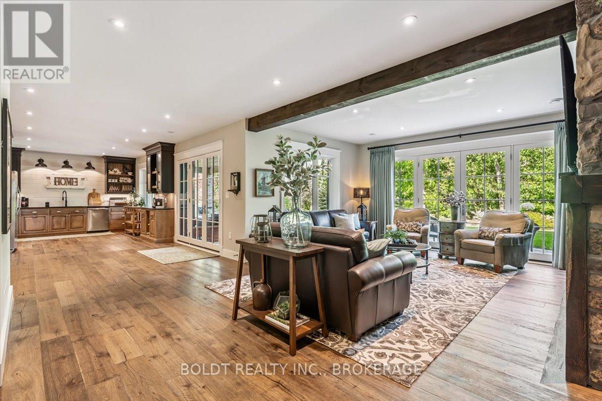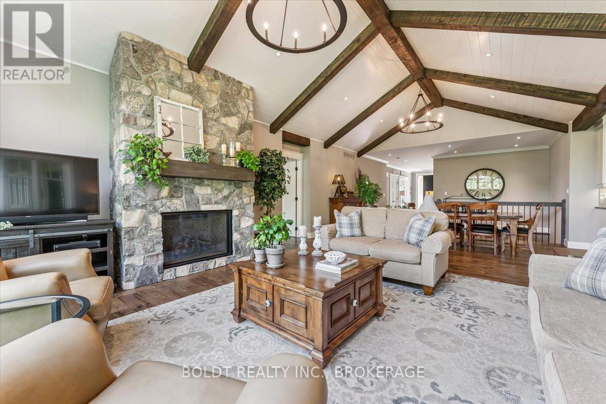 Custom Bungalow in Prestigious Lookout Point.This exceptional home is nestled in one of Fonthill's most desirable neighbourhoods, is truly a masterpiece of thoughtful design and timeless elegance featured in Our Homes Magazine. Lovingly created by the owners and brought to life by Nauta Home Designs, every detail has been carefully curated for luxury, comfort, and functionality. Step into the great room and be immediately captivated by the vaulted shiplap and beamed ceiling, stunning stone gas fireplace, and a wall of windows framing breathtaking views of mature coniferous and deciduous trees changing beautifully with every season.The gourmet kitchen is the heart of the home, featuring a grand island, spacious dining area, and seamless access to a covered porch perfect for entertaining. A walk-in pantry and generous cabinetry provide ample storage while maintaining a clean, upscale look. The primary suite is a peaceful sanctuary with a fireplace, walk-in and double closets, and a spa- like ensuite complete with a large glass shower and luxurious soaker tub, overlooking serene backyard views. The front room, currently used as a parlour, easily converts to a main-floor bedroom with its double closet, and full bathroom just steps away. The spacious main-floor laundry adds everyday ease. As you descend to the fully finished lower level, you're greeted by soaring 9' ceilings and another beautifully appointed great room with stone fireplace and ceiling beams that mirror the upper levels elegance. This level also boasts a full second custom kitchen crafted by the same cabinetmaker, along with a charming dining area framed by a custom brick and stone accent wall evoking the feel of a rustic Italian villa. Garden doors open to a covered porch and large patio area, complete with a gas BBQ line an entertainers dream. Two generous bedrooms and a stylish full bathroom with a double vanity and spacious glass shower complete this level, making it ideal for extended family, guests. (id:64974)