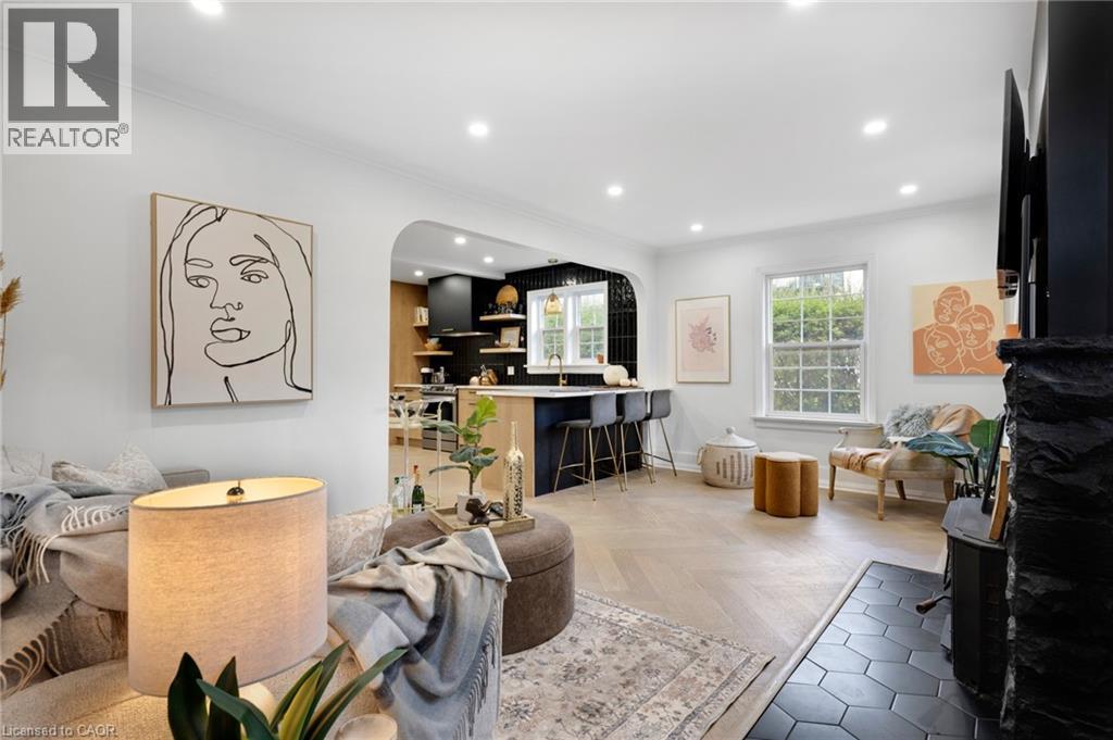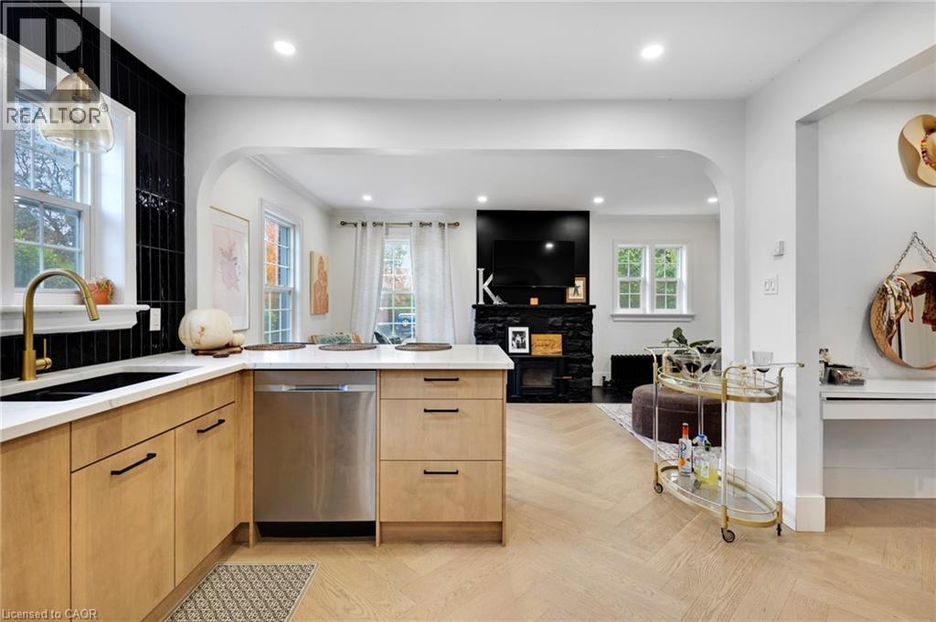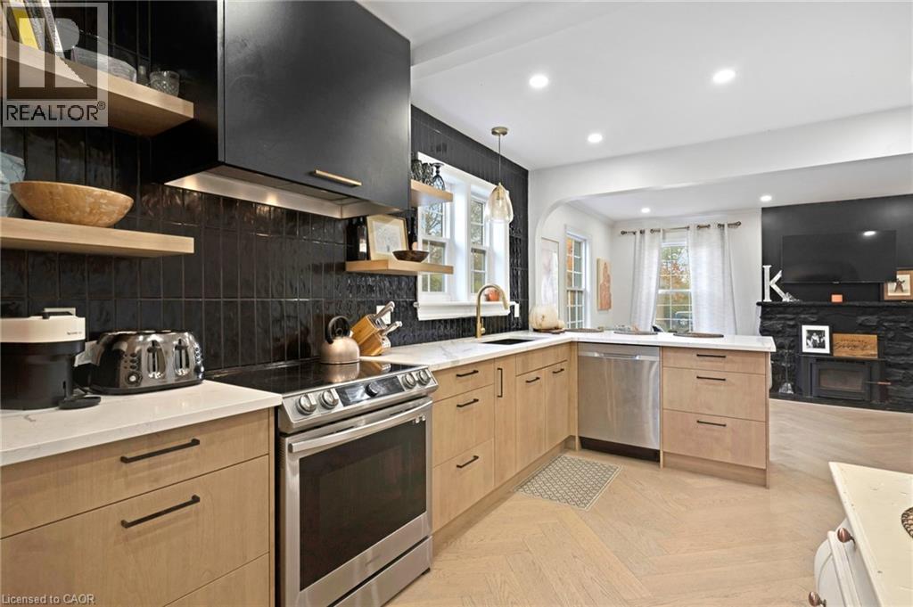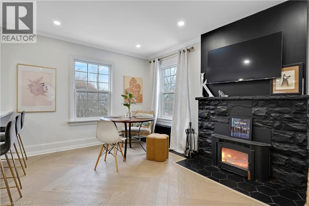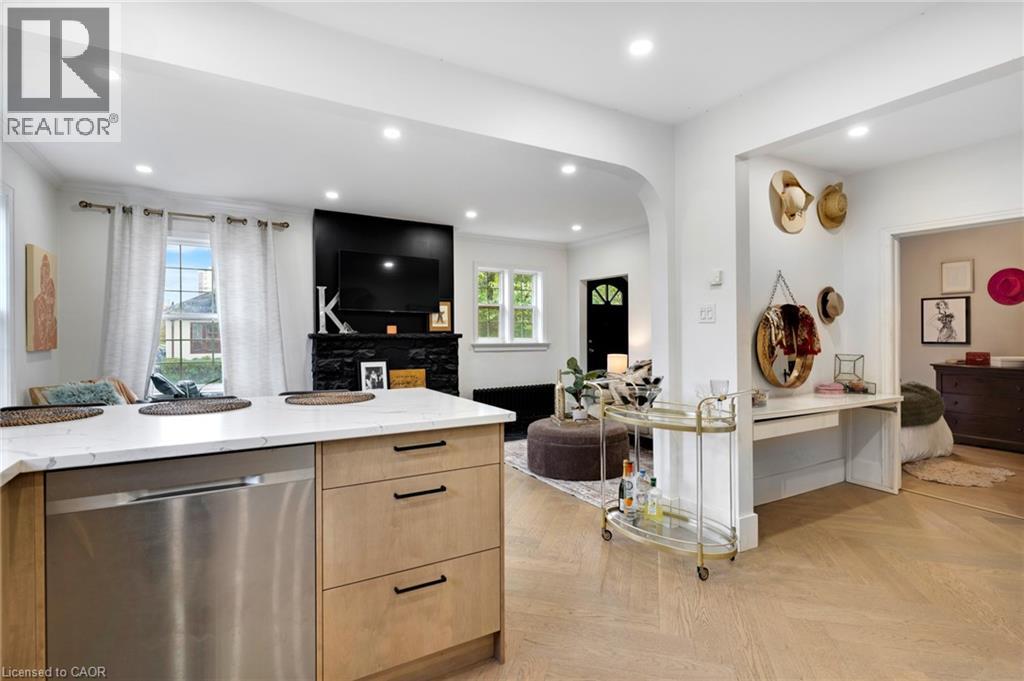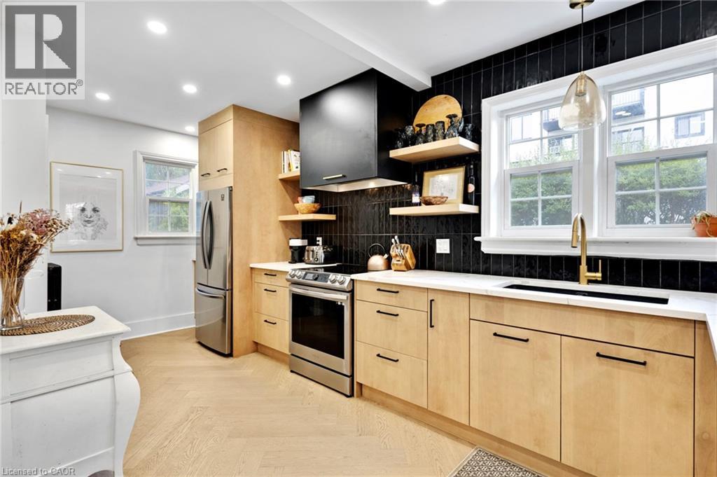 Welcome to 360 Luella, an enchanting 3 bedroom East Ward home set on a mature, tree lined street close to the heart of Downtown Kitchener. A flagstone porch leading to the all brick exterior, gorgeous cherry blossom tree and 4 car driveway with detached garage add to the whimsical curb appeal. The original character has been maintained inside and out, with mechanical upgrades and aesthetic updates to give a compelling mix of charm and elegance. Step inside to the open concept main floor, which has been structurally reinforced, where you will love the many large windows letting in natural light and the contrast of modern black octagon tile, black stone wood burning fireplace and the classic herringbone hardwood floors. The chic kitchen blends style and class with gorgeous light wood cabinetry, black backsplash and hardware, stainless steel appliances and exquisite Calcutta marble countertop and breakfast bar. The main floor also features 2 spacious bedrooms, and 4 pce bath. Upstairs is your expansive primary suite with a sitting/dressing area, pine floors and huge walk in closet. This space would be ideal to build an ensuite to give you your own private bathroom. Back downstairs, to the back of the kitchen is a separate entrance taking you to the large, full sized basement with an easily-to-be finished rec room with gas stove fireplace, laundry and plenty of storage. Take the backdoor to your private fully fenced yard and enjoy the outdoors and serene greenery on the quaint patio. Situated just minutes to the expressway, short walk to the Ion, Downtown, Farmers Market, Centre in the Square, Library, parks, schools as well as bistros pubs and restaurants, perfect for those who love the Urban lifestyle with the perks of owning freehold and having private outdoor space! (id:64974)