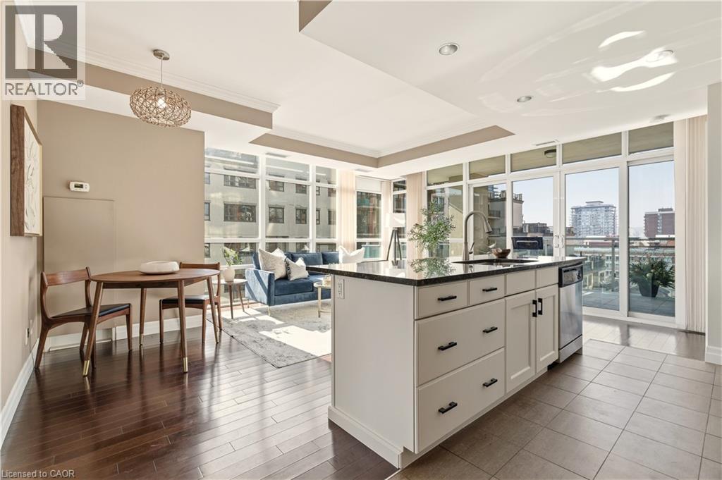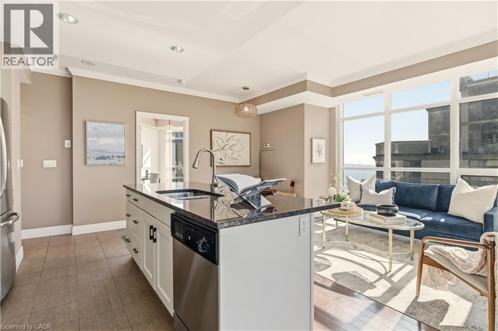 Welcome to the highly sought-after 360 Pearl—a premier building in the heart of downtown Burlington with gorgeous lake and escarpment views in every direction. This beautifully updated 2-bed, 2-bath suite offers an open-concept layout, floor-to-ceiling windows, and 9 ft ceilings, creating a bright and sophisticated living space. The kitchen impresses with custom cabinetry, pot drawers and slide-out shelving, stainless steel appliances which include a gas stove, a generous island for entertaining, and granite countertops. The Great Room is wrapped in windows, showcasing lake views and providing a seamless walkout to your expansive wrap-around balcony. The primary suite offers its own balcony access, a spacious walk-in closet with built-in organizers, and a spa-inspired ensuite with a large glass shower and extended vanity. The second bedroom features stunning lake views and a custom Murphy bed—perfect for easily transitioning between a home office and guest space. A stylish 4-piece bathroom with granite finishes and convenient in-suite laundry complete the interior. This unit truly shines for those who love to entertain. The building offers exceptional amenities including a rooftop terrace with BBQs, state-of-the-art gym with a steam room, party room, games room, movie theatre, and 24-hour concierge/security. Walk to Burlington’s best restaurants, boutique shops, Spencer Smith Park, and waterfront events. Includes 1 parking space (Level B #4) and 1 locker (Level B #57) (id:64974)
