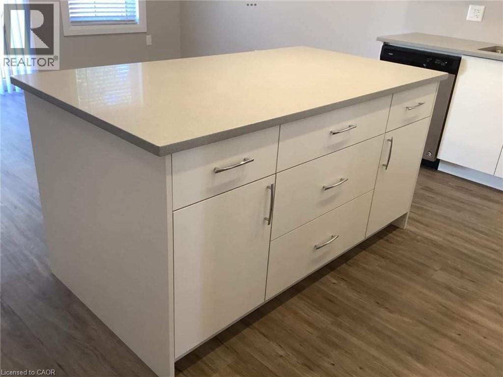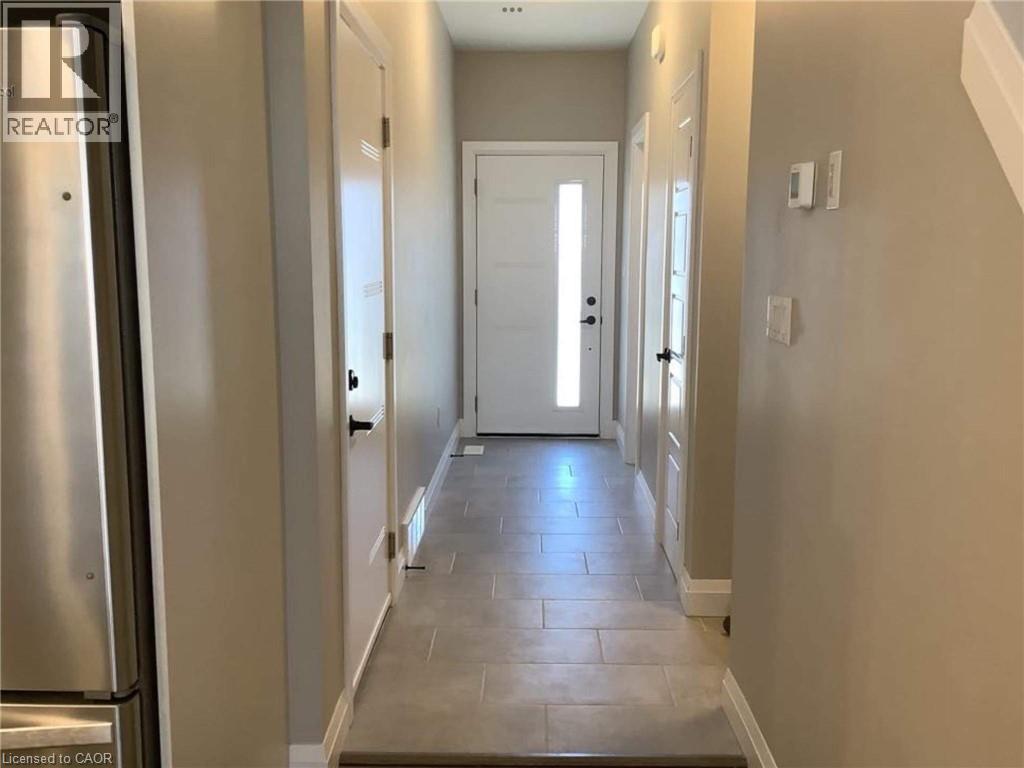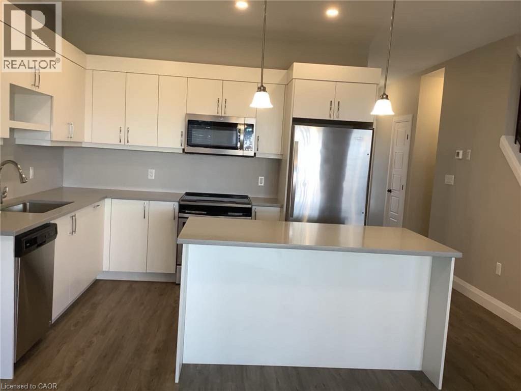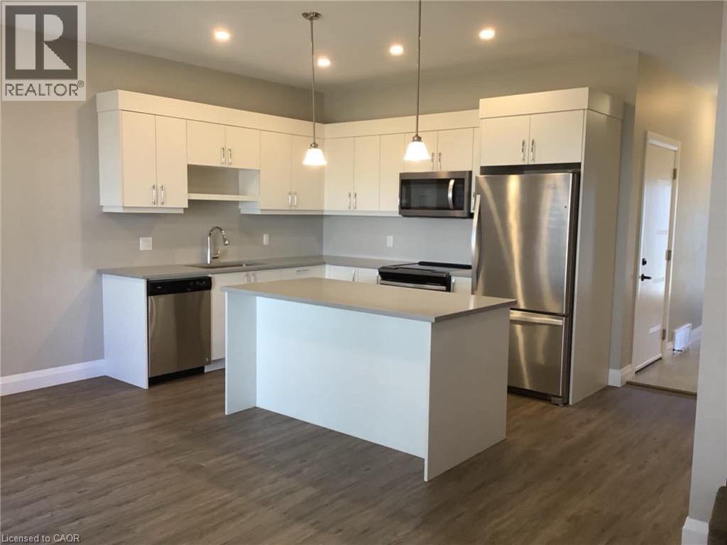 Welcome to this stunning townhouse built in 2020 with low condo fees! finished from top to bottom with a modern design. The open-concept main floor features laminate and ceramic flooring, a kitchen with ample cupboards, an island with a breakfast bar, quartz countertops, stainless steel appliances, a powder room, and access to a single attached garage. The second floor boasts a master bedroom with an ensuite bathroom, two other spacious bedrooms, a main bathroom, a linen closet, and a laundry room. The finished basement offers a great space for a family room. November 2024 New Water Softener and December 2024 Duct Cleaning. Enjoy your private patio from the main floor living room, complete with natural gas for a BBQ. The complex includes visitor parking and a playground. Located in a great area close to schools, a hospital, banks, groceries, and restaurants. 2 minutes to highway 19 and 15 minutes to 401. (id:64974)