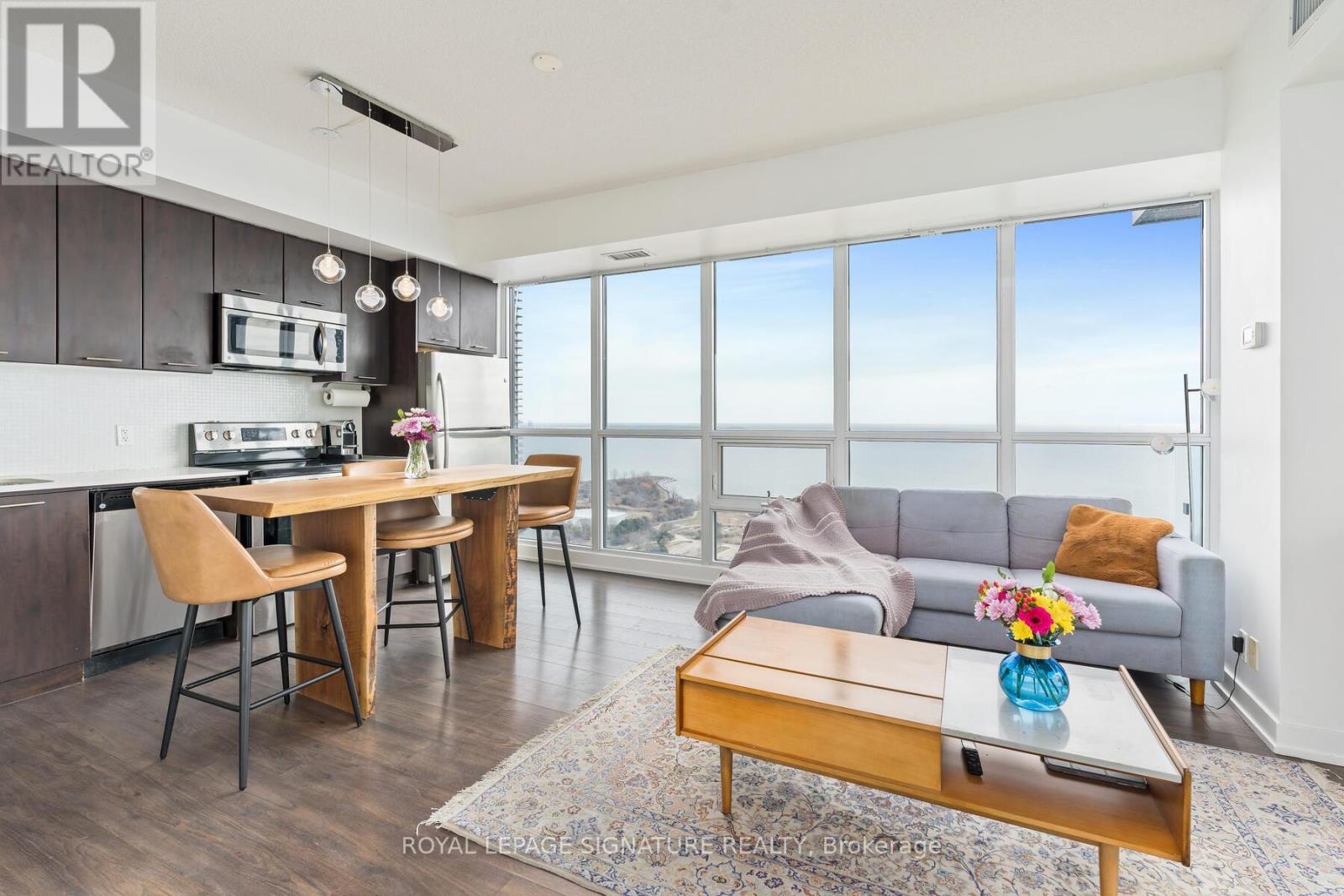 A True and rare unobstructed view of the south - where the views don't just impress, theystop you in your tracks, showcasing Lake Ontario, the Humber river, and all the green spacearound you. A 2 bedroom corner unit with so many highlights to write here, like a thoughtfulzero-wasted space, split bedrooms layout, floor-to-ceiling windows in all of the living space,hardwood flooring throughout, and 2 full bathrooms. This is a gem you want to call home;Whether you're sipping your morning coffee/tea on the balcony, taking in sunset views, orstepping out for a lakeside walk - this home delivers a Lifestyle, not just a space with Prideof ownership. (id:64974)