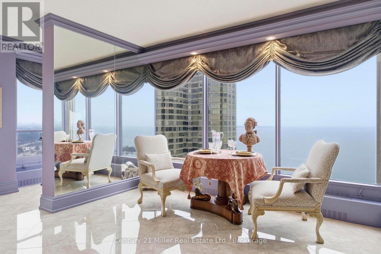 Spacious 3,247 sq. ft residence on the 36th floor of the Luxurious Resort-Style Palace Pier showcasing breathtaking lake and city skyline views. Elegant wainscoting enhances the lobby and corridors, complemented by marble and porcelain flooring throughout. The open-concept kitchen features a marble peninsula, statement marble wall, and backsplash overlooking the breakfast area and family room with built-in wall unit. The great room offers a dining area, built-in bar, solarium with julitette balcony, custom electric fireplace, and automated blinds on the floor to ceiling windows. Lots of natural light and beautiful view of Lake Ontario! The primary suite includes two large walk-in closets, solarium with juilette balcony, luxurious 5-piece bath, and pop-up TV. A truly exceptional home with refined custom finishes.Two bedrooms were converted to a custom office/library with built-ins and fireplace which can be easily converted back to two bedrooms. Amenities include: Fitness and aerobics center, Restaurant, Club on 47th floor, media room ,ar, event kitchen stage for events, terraces, tennis court, putting green, squash courts, golf simulator Table tennis room billiards room Party Room, convenience store, spa, arts and crafts room, childrens playroom , 24 hour concierge, 18 hour valet service, hourly bus service to downtown 6 days a week, 7 guest suites, large indoor swimming pool with whirlpool and sauna, pets allowed with restrictions (id:64974)