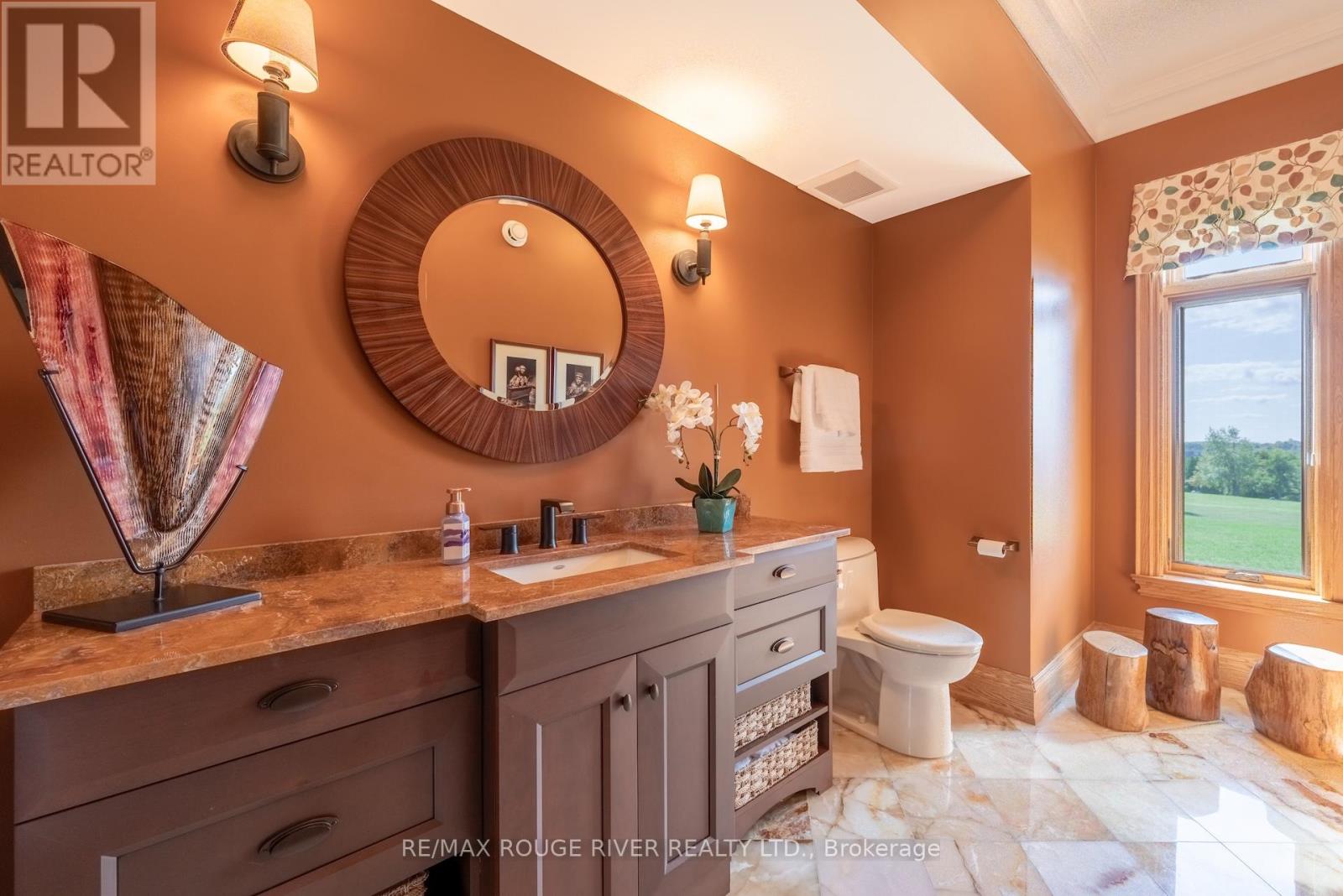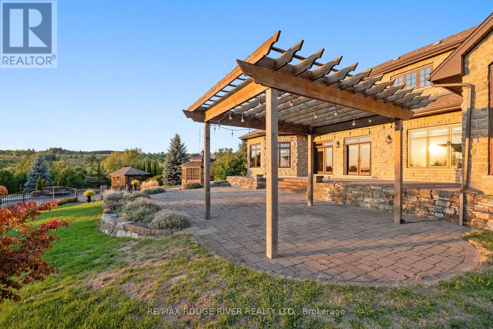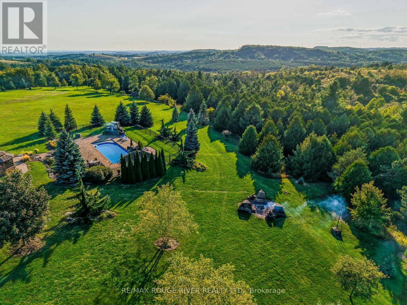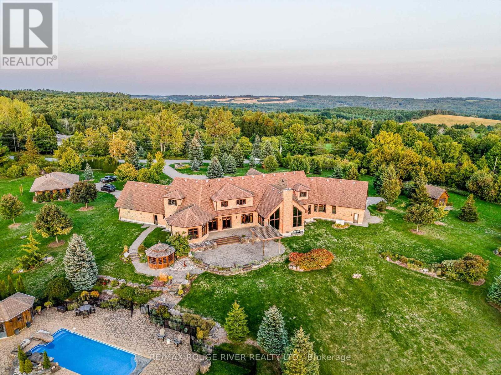 An Exceptional Country Estate in Northumberland County. Set on 24 acres of rolling countryside with uninterrupted 360-degree views, this distinguished estate offers a rare balance of architectural refinement and natural beauty, just minutes north of Cobourg and within comfortable reach of Toronto. Thoughtfully designed and built to exacting standards, the 11,000 sq. ft. residence (7,500 sq. ft. above grade) blends timeless proportions with modern comfort. The arrival unfolds across manicured grounds featuring orchards, curated stonework, and landscape installations by renowned artisan John Shaw-Rimmington, creating a setting that feels both composed and serene. Expansive stone terraces surround a resort-style pool, ideal for entertaining or quiet retreat. A private trail network winds through the property, leading to a hilltop vantage point with sweeping views toward Lake Ontario. Inside, the home is defined by volume and balance. A dramatic great room with 16-foot ceilings, marble columns, and a statement fireplace anchors the principal living spaces, complemented by more intimate rooms for everyday living. A Downsview-designed chef's kitchen, butler's pantry, and adj0oining family room offer a seamless blend of form and function. Seven bedrooms and six baths include a private two-bedroom suite with its own garage-ideal for guests or extended family. The primary suite features a dressing room, spa-inspired ensuite with heated floors. Geothermal heating and cooling, a heated three-car attached garage, a separate two-car garage/workshop, and curated designer finishes complete this quietly exceptional estate-well suited as a refined full-time residence or an elegant country retreat for local, GTA and international buyers seeking privacy, space, and distinction. (id:64974)