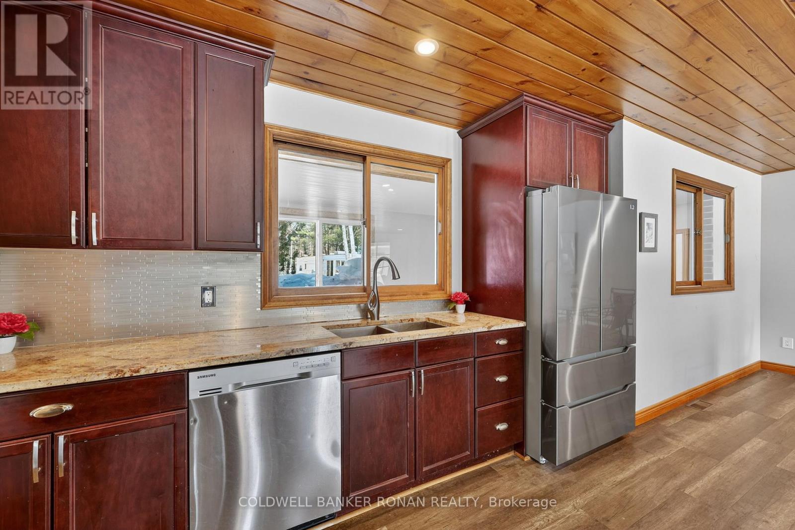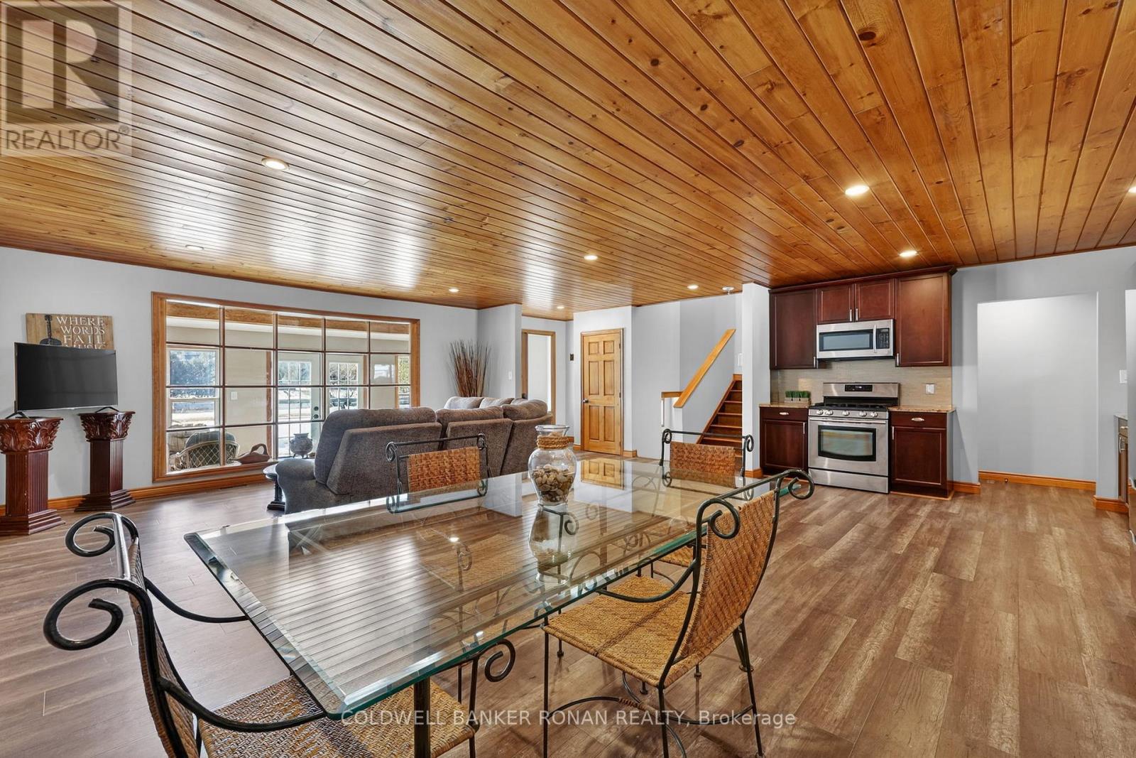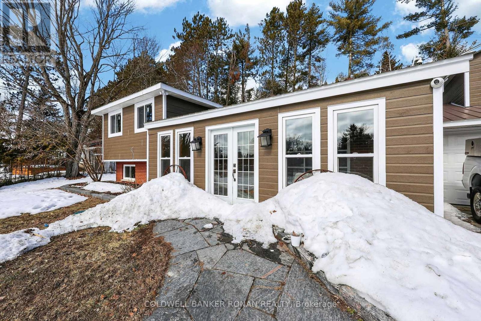 This charming spacious home boasts open concept living room, dining room & kitchen, 3 good sized bedrooms and lovely family room with woodstove. The sun filled sunroom offers serene view of the river. You will find the perfect guest room above the garage with french doors and view of the river. The insulated 2 car garage has access into the home. Recent renovations 2025 incl. new windows, flooring on main & lower level, painted throughout, ceramic floors in sun room & back foyer & fridge, new furnace, A/C and garage insulted w/epoxy floor & garage heated by electric heater.Renovations six years ago incl. new pine tongue & groove ceilings throughout, wiring, insulation, drywall, kitchen & guest room above garage.You will find a good sized dock at waterfront across Santas Village Rd. giving access to the 3 big lakes, Muskoka, Joseph & Rosseau. Min to downtown Bracebridge with all amenities incl. hospital. This property is perfect for entertaining with that lovely peaceful feeling and plenty of outdoor space. Lots of parking.Book your appointment now and make this"Home Sweet Home" (id:64974)