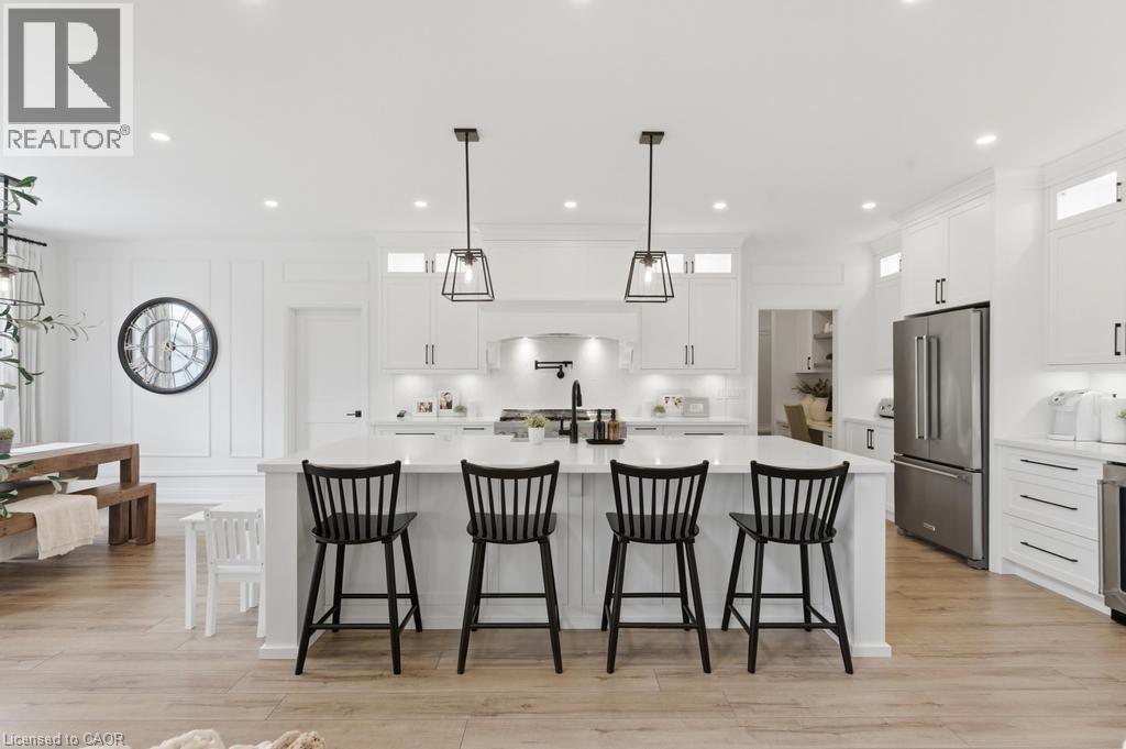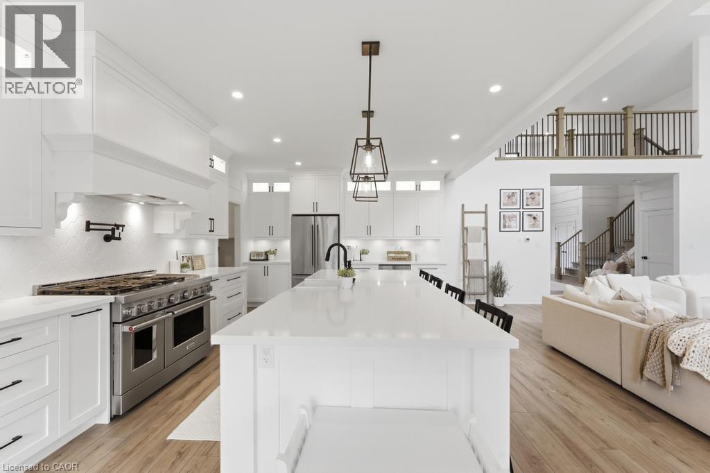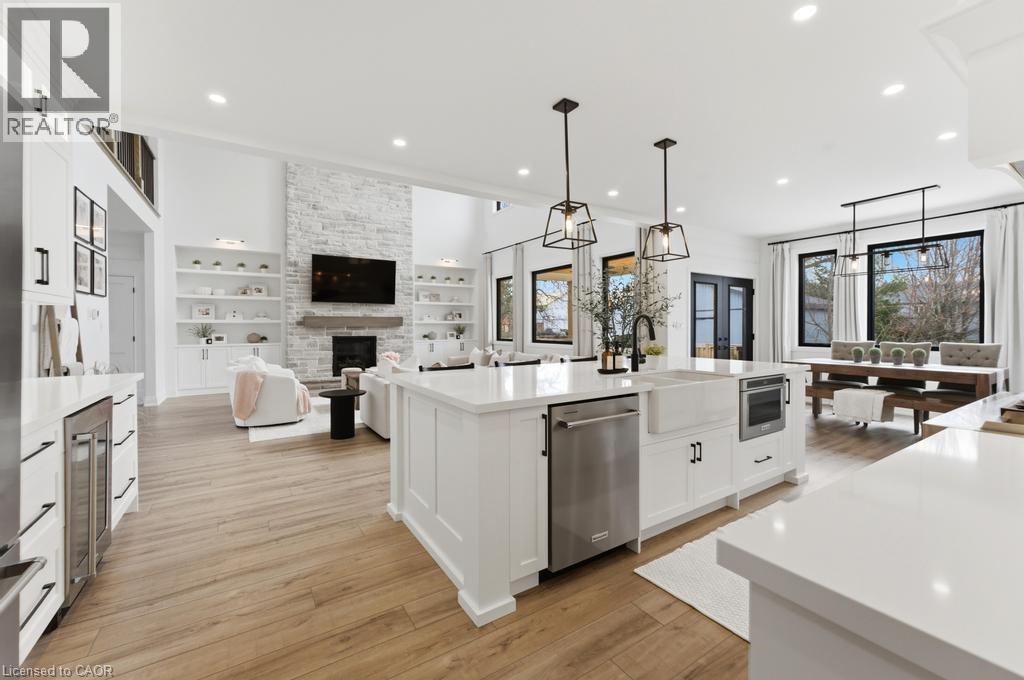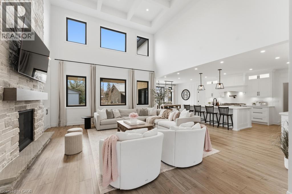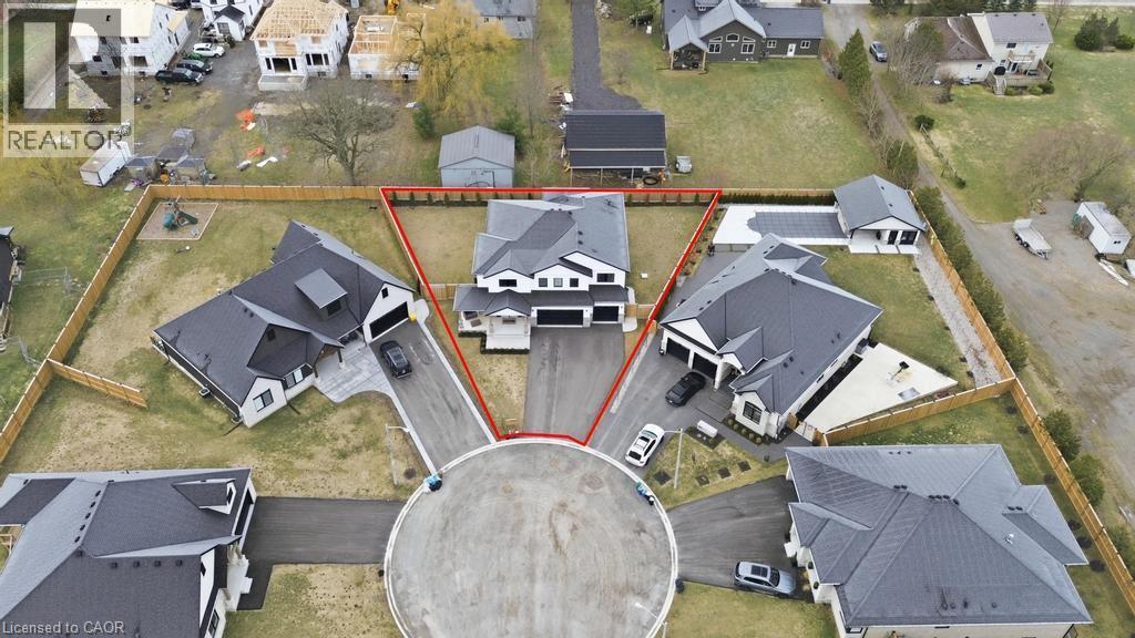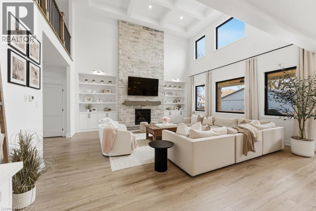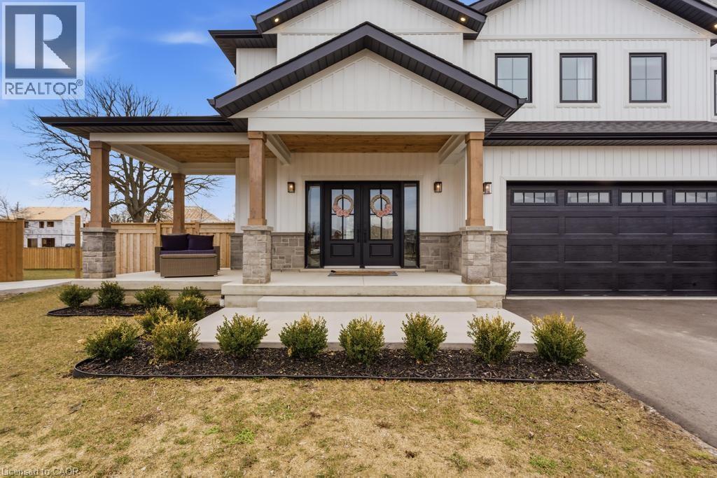 Welcome to this exceptional modern farmhouse masterpiece nestled on a quiet cul-de-sac in one of Campden Estates’ most desirable communities. Thoughtfully designed with luxury finishes and timeless architectural details, this stunning home offers the perfect blend of elegance, comfort, and everyday functionality. Step inside to an impressive open-concept layout where natural light pours through expansive windows, highlighting coffered ceilings, custom millwork, and a soaring stone fireplace that anchors the main living space. The designer kitchen is truly the heart of the home, featuring a large centre island, sleek appliances, walk-in pantry, and abundant cabinetry—ideal for both entertaining and busy family living. The seamless flow into the dining area creates the perfect setting for gatherings, with direct access to the outdoor patio for effortless indoor-outdoor living. Upstairs, a striking catwalk overlooks the main level and leads to spacious bedrooms, each complete with built-in closets. The primary retreat feels like a private escape, featuring French door entry, a spa-inspired ensuite, and generous walk-in closet space designed for comfort and relaxation. Convenient upper-level laundry with additional storage and utility sink adds everyday practicality. Outside, the beautifully landscaped yard offers multiple spaces to relax or entertain—from lively gatherings on the finished patio to peaceful evenings in a private setting. A triple garage and ample parking complete this impressive property. Offering over 3,000 sq ft of thoughtfully crafted living space with luxury finishes throughout, this home delivers refined living in a family-friendly neighbourhood just minutes from local amenities, wineries, and scenic Niagara countryside. Experience the perfect balance of modern design and timeless charm welcome home. (id:64974)