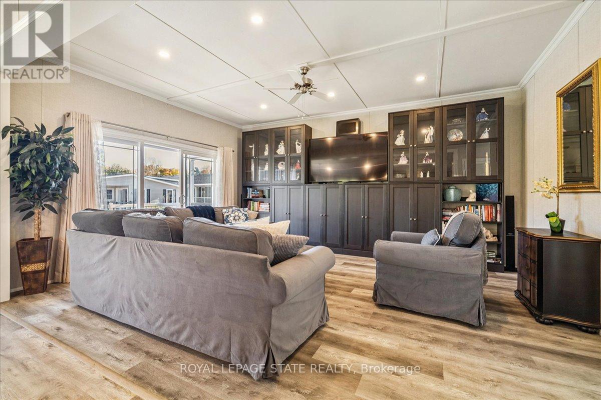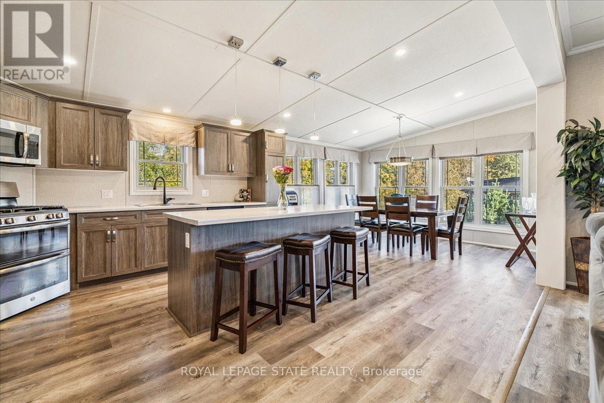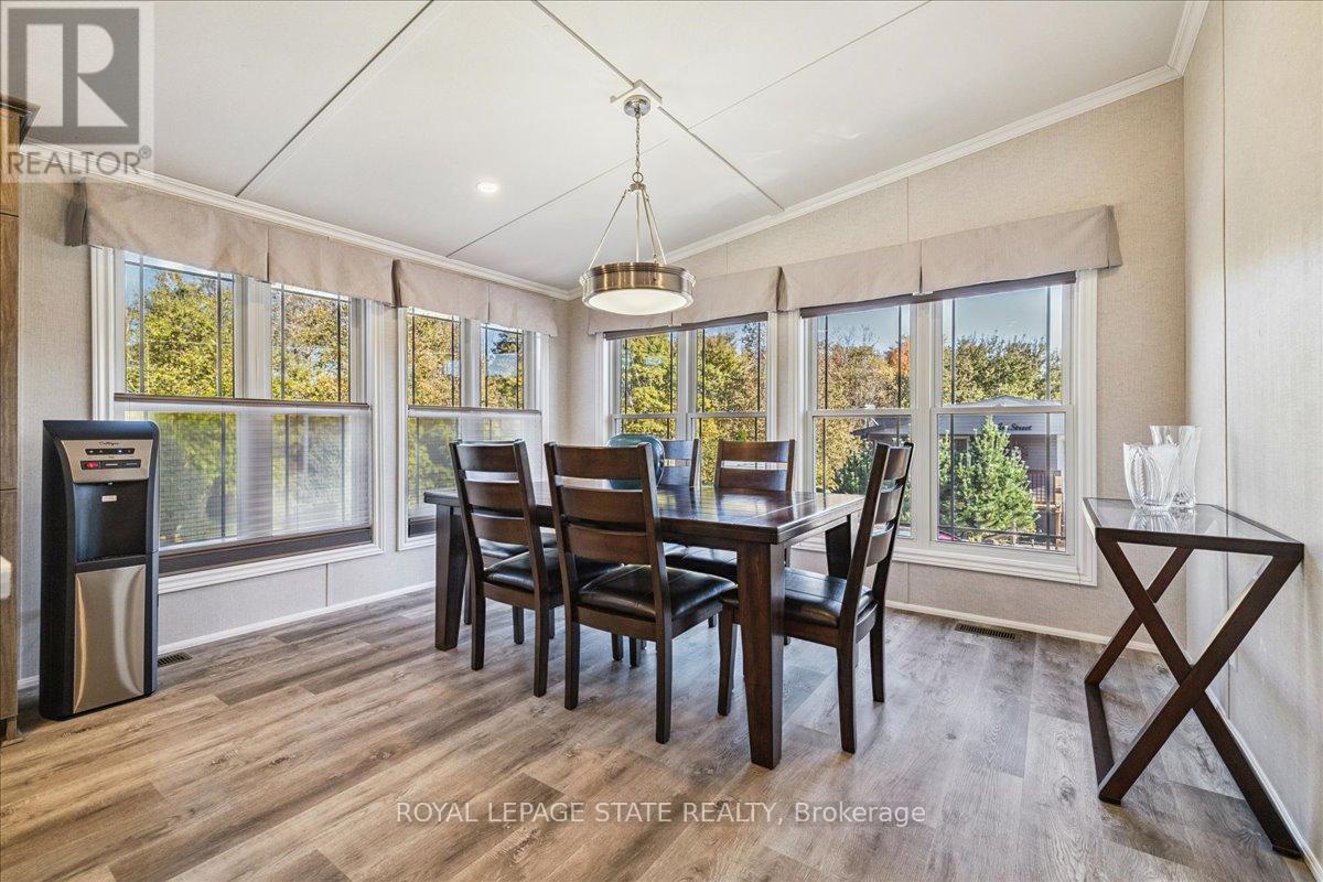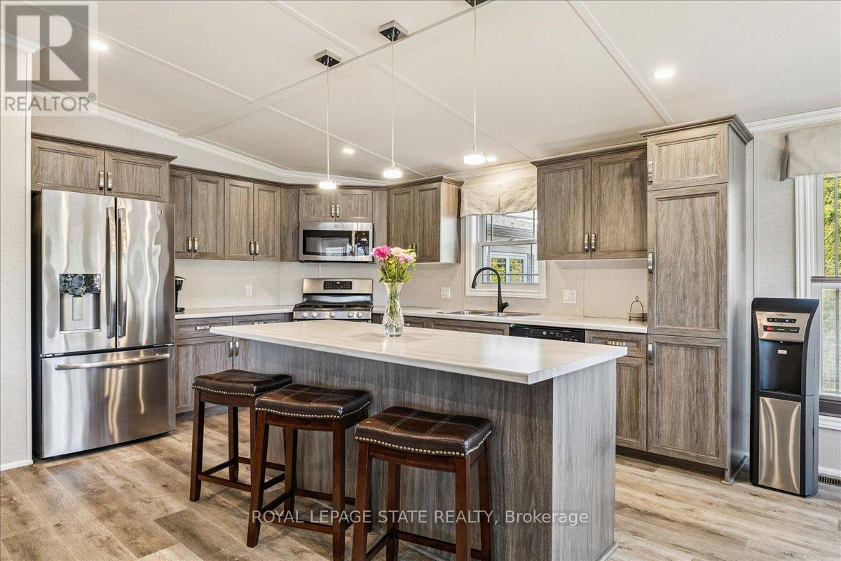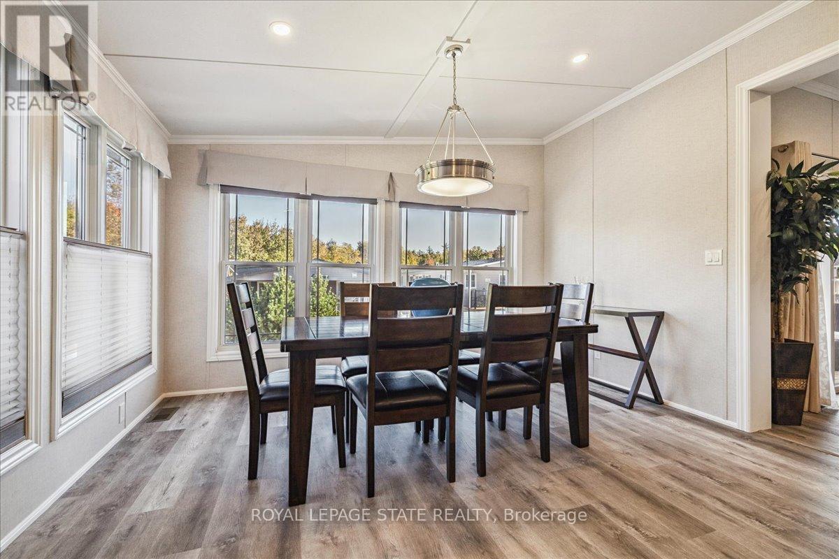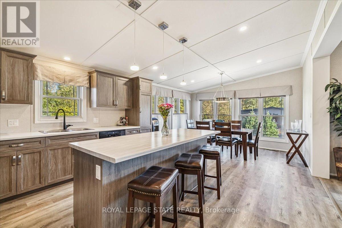 Welcome to this exceptional modular home, perfectly situated on leased land within the exclusive gated community of Lost Forest in north Burlington. Offering year-round comfort and a resort-like lifestyle, residents enjoy interior luxury and fantastic site amenities, including a seasonal pool. Step into the charming foyer and into an open-concept, single-level design, featuring soaring ceilings, and offering one of the largest spaces at 1315 Sq ft. The great room is bright and spacious with triple doors leading out to a cozy covered porch. The sunshine dinette features corner windows with eight large panels of glass. Some many things to appreciate including an upgraded kitchen with crown molding and large island, luxury vinyl floors front back, built-in wall cabinets in the great room, and bedrooms, offering tons of storage, in suite laundry and parking for three cars on the concrete driveway. Come and enjoy everything this worry-free, unique lifestyle has to offer! (id:64974)