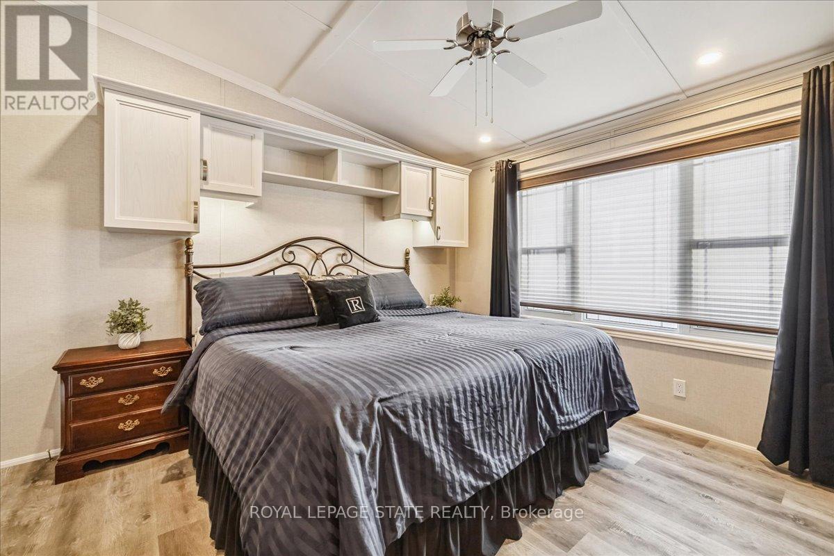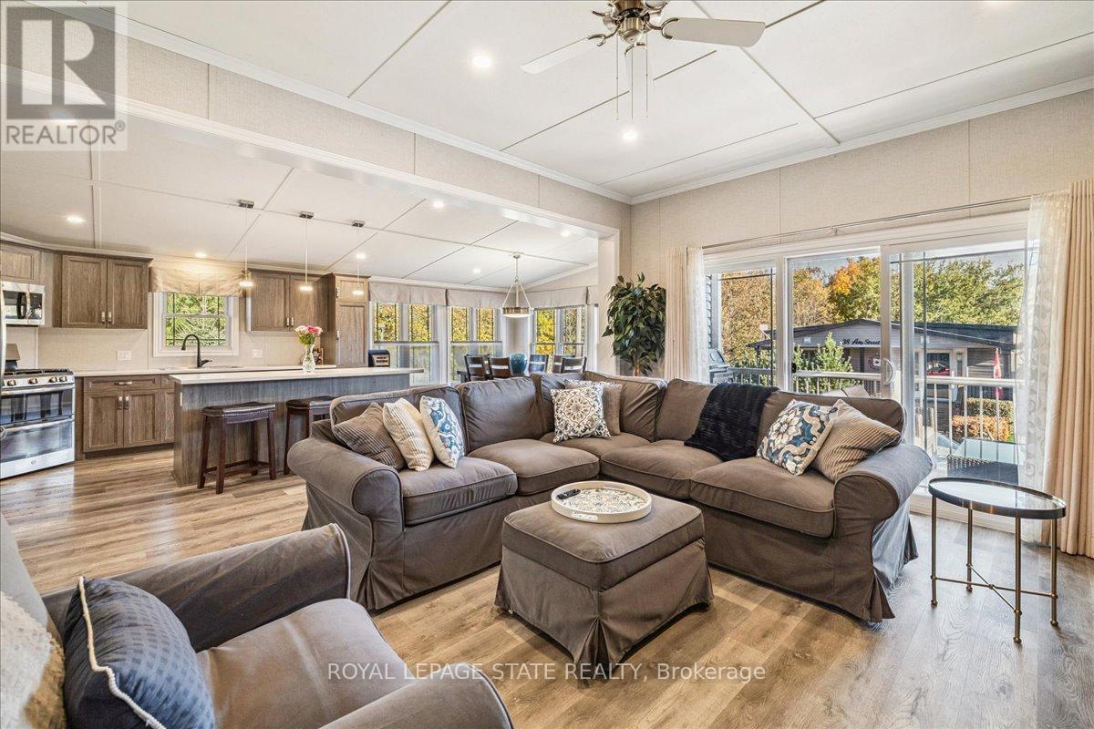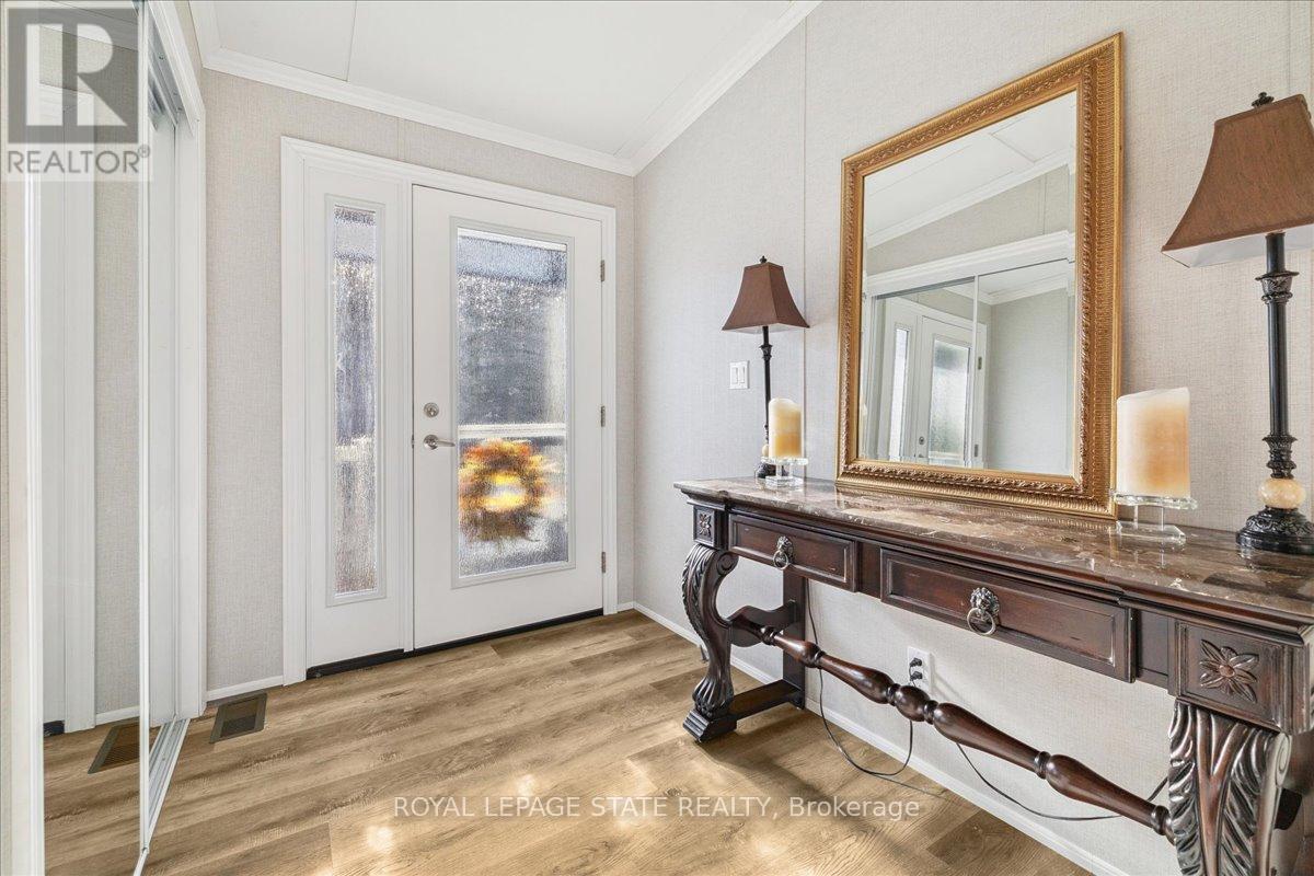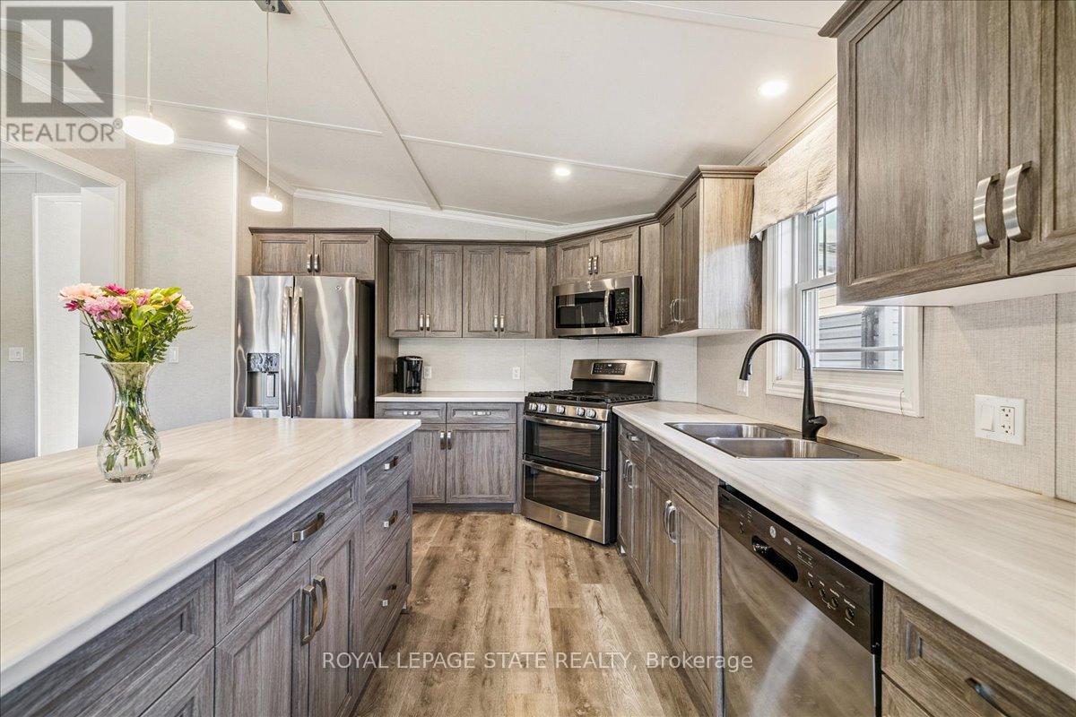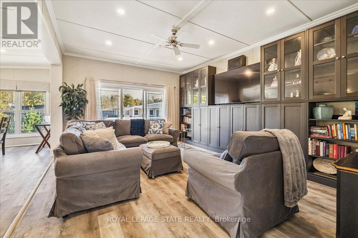 Welcome to this exceptional modular home, perfectly situated on leased land within the exclusive gated community of Lost Forest in north Burlington. Offering year-round comfort and a resort-like lifestyle, residents enjoy interior luxury and fantastic site amenities, including a seasonal pool. Step into the charming foyer and into an open-concept, single-level design, featuring soaring ceilings, and offering one of the largest spaces at 1315 Sq ft. The great room is bright and spacious with triple doors leading out to a cozy covered porch. The sunshine dinette features corner windows with eight large panels of glass. Some many things to appreciate including an upgraded kitchen with crown molding and large island, luxury vinyl floors front back, built-in wall cabinets in the great room, and bedrooms, offering tons of storage, in suite laundry and parking for three cars on the concrete driveway. Come and enjoy everything this worry-free, unique lifestyle has to offer! (id:64974)