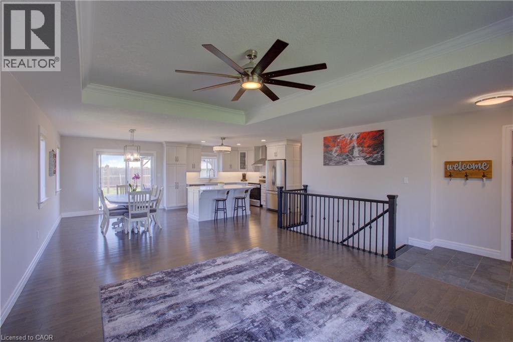 Welcome to 37 Lorne Street West – A Custom-Built Bungalow with In-Law Suite! Discover exceptional value and thoughtful design in this 2020 custom-built bungalow, ideally located in the welcoming community of Harriston. With over 2,600 sq. ft. of finished living space, this home is perfect for families, multigenerational living, or those seeking flexible space. The main level features 3 spacious bedrooms, 2 full bathrooms, a bright open-concept layout, and high-end finishes throughout. From upgraded flooring and trim to custom cabinetry and fixtures, every detail has been considered. The kitchen stands out with its oversized, handcrafted island—ideal for cooking, gathering, and entertaining. Natural light pours in through large windows, creating a warm and inviting atmosphere. The primary suite includes a walk-in closet and an ensuite with a generously sized walk-in shower. Convenient main floor laundry and direct access to the double garage make daily living easy. Downstairs, enjoy a fully finished lower level offering a rec room, two additional bedrooms, and a living room —perfect for extended family, or guests,. Situated on a deep 132-foot lot, this home offers a spacious fully fenced yard and curb appeal to match. Harriston delivers all the essentials with a charming small-town feel and a lively downtown. You’ll also love the commute—Orangeville, Kitchener-Waterloo, and Guelph are all within reach. Travel just 30 minutes south and you'll be paying significantly more for a home like this. Don’t miss out! (id:64974)