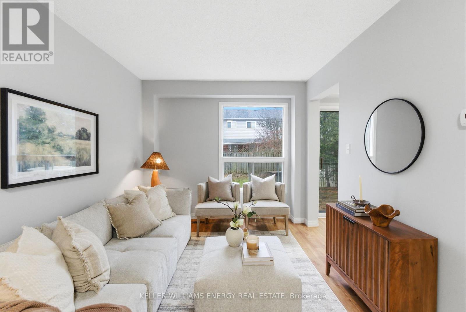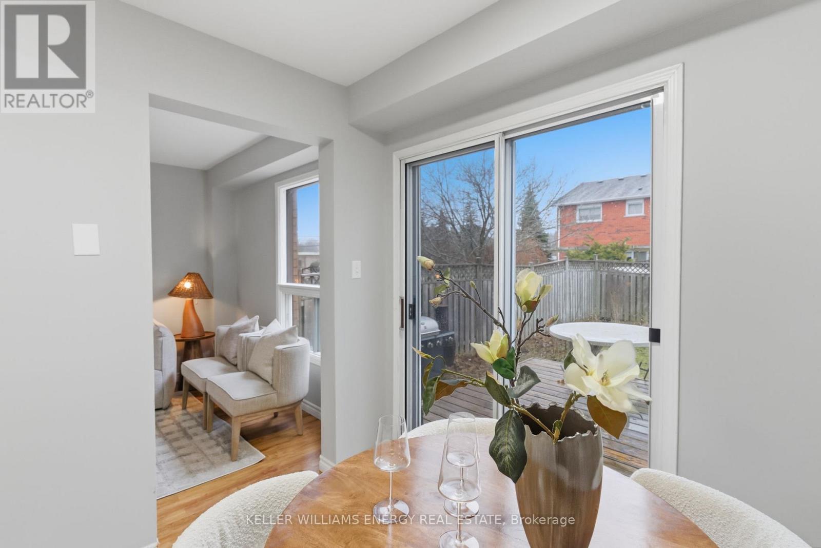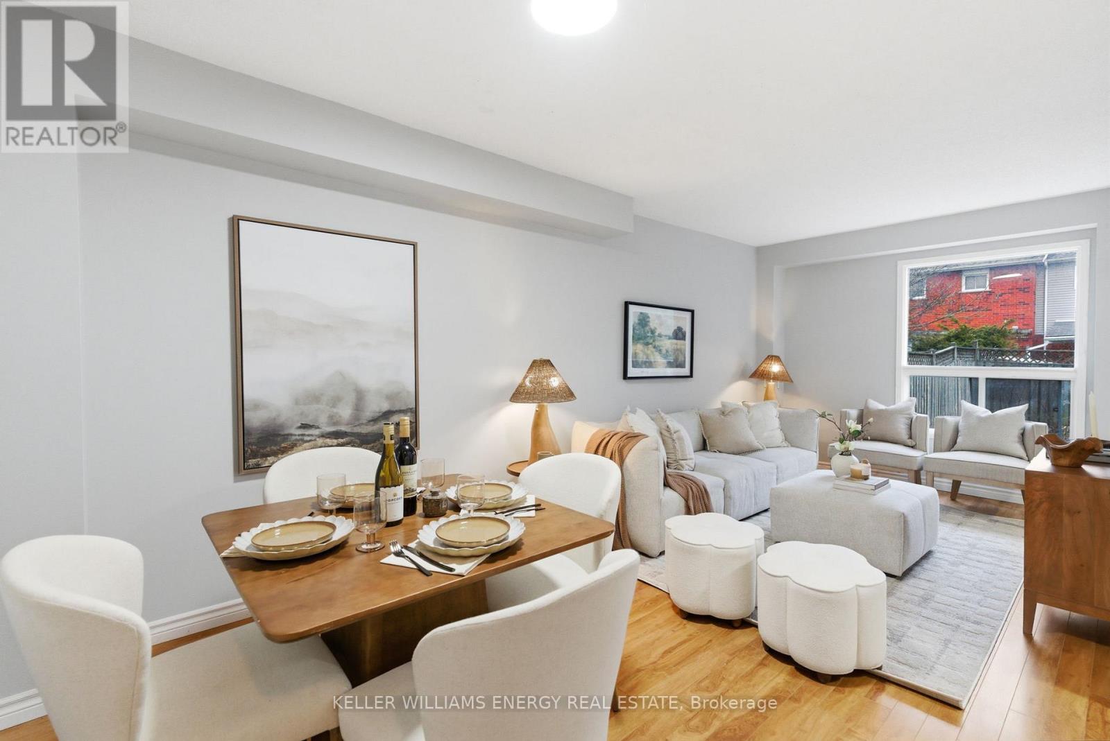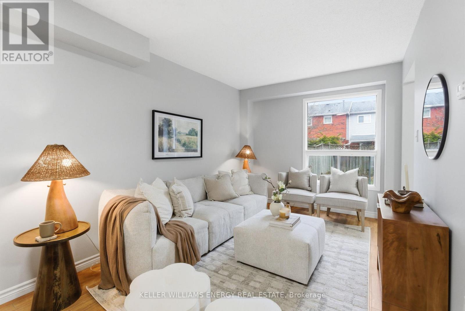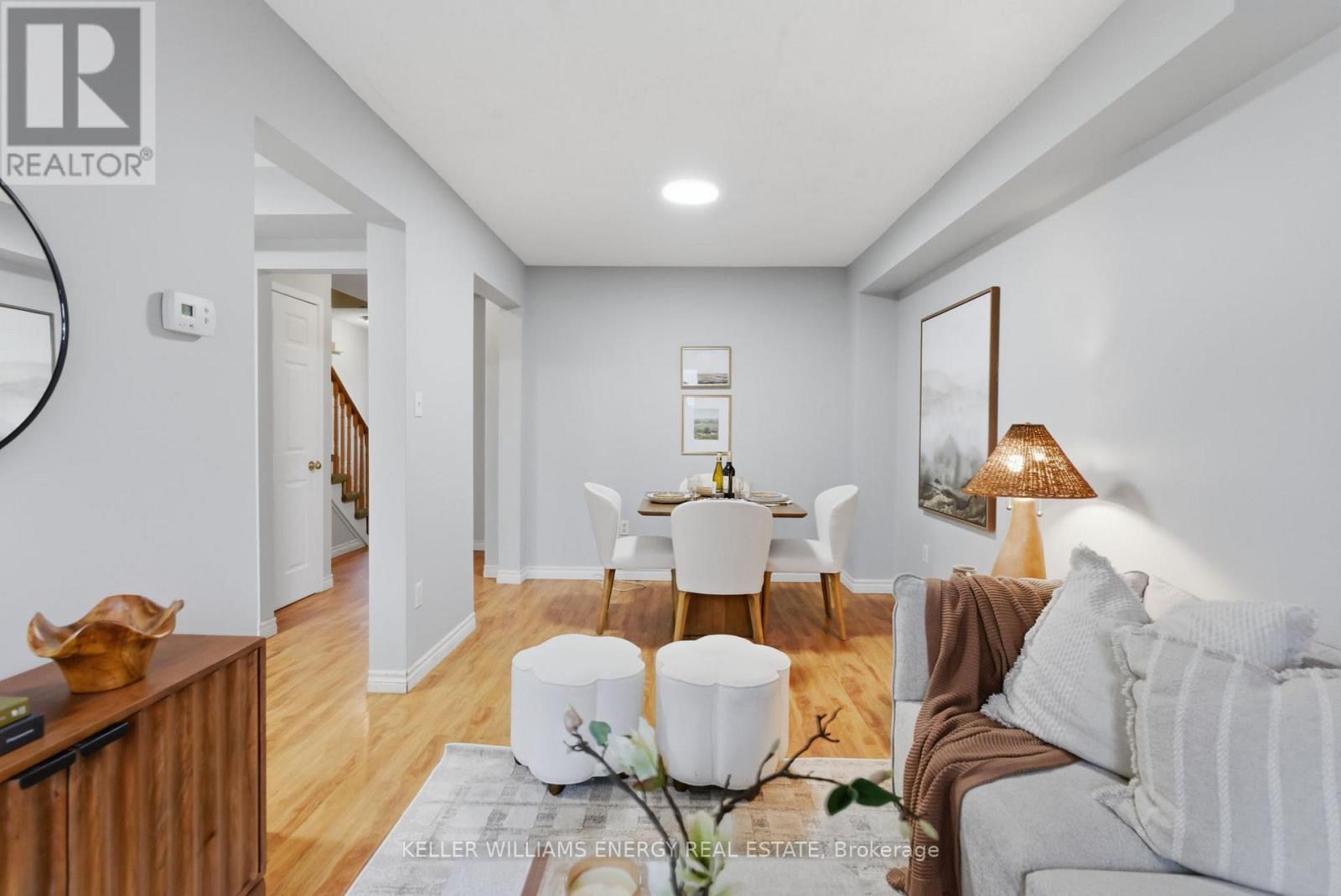 Perfectly situated at the end of a quiet court in one of Courtice's most sought-after neighbourhoods, this freehold townhome offers effortless, move-in-ready living. The bright, open-concept main floor features a combined living and dining area with a convenient powder room, newer laminate flooring, and fresh paint throughout. Large windows fill the home with natural light, creating a warm and inviting atmosphere. The sun-filled kitchen is ideal for family meals and everyday living, with walkout access to a spacious deck and a private backyard oasis, perfect for entertaining. Upstairs, you'll find three well-designed bedrooms, including a generous primary retreat with laminate flooring, a double closet, and a semi-ensuite bath. The second level also features laminate flooring in the additional two bedrooms. The partially finished basement offers added living potential along with ample storage space. Located in a prime Courtice location overlooking beautiful pond views, you're just minutes to top-rated schools, parks, the community centre, shopping, and all essential amenities. Commuters will appreciate quick access to Hwy 418, 407, 401 and nearby public transit. Updated for style and comfort, this turnkey home is a rare opportunity in a family-friendly community-perfect for first-time buyers or anyone looking for a low-maintenance lifestyle in a desirable neighbourhood. (id:64974)