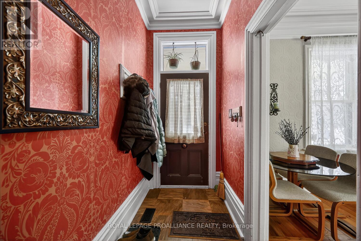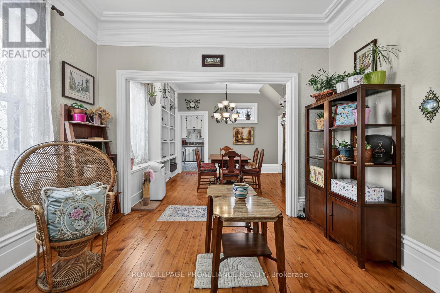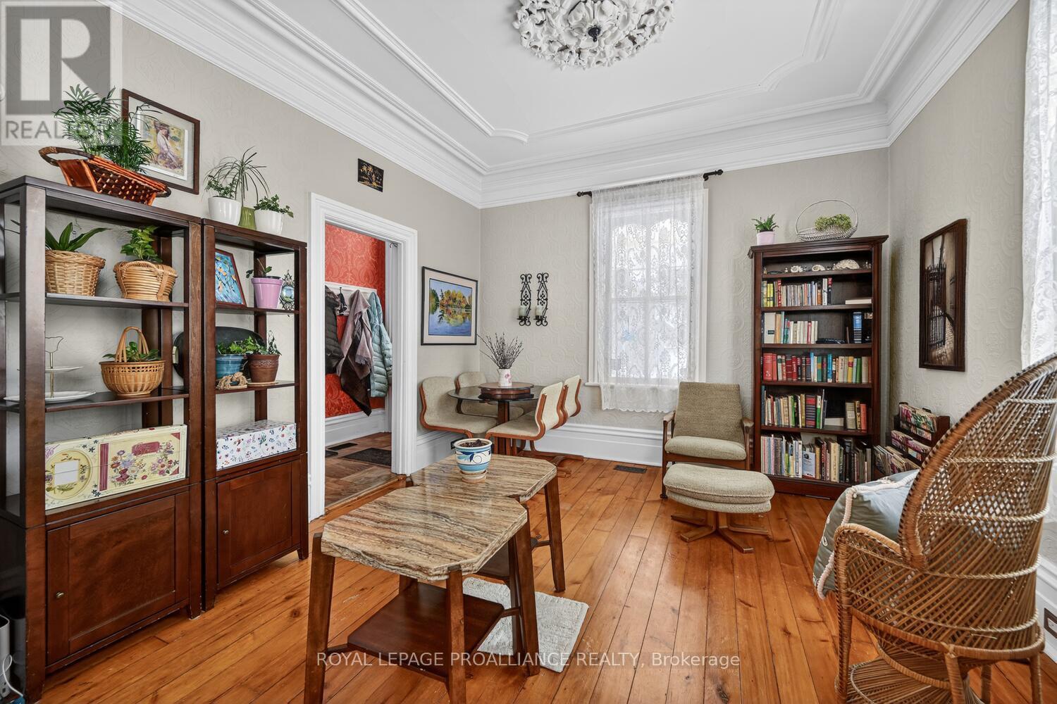 As soon as you enter, you will quickly see that this is a great home! With quality carpentry and extra details from bygone days, this home boasts built-in cabinets and shelving, exquisite crown moulding, and ceiling medallions. The open Living Room and Dining Room are bright, with lots of room, and original wood floors. The functional Kitchen is also bright and airy, with the benefit of the morning sun, and a side door leading to a deck - perfect to enjoy your morning coffee overlooking your private yard and garden. Upstairs you'll find a large open space, ideal for your office or den, two front bedrooms, and a third smaller bedroom and ante room, leading to 4-piece bathroom. Add an oversized single-car garage and energy-efficient gas furnace and hot water heater, and you have a great family room mere steps from downtown and the Mighty St. Lawrence River! (id:64974)