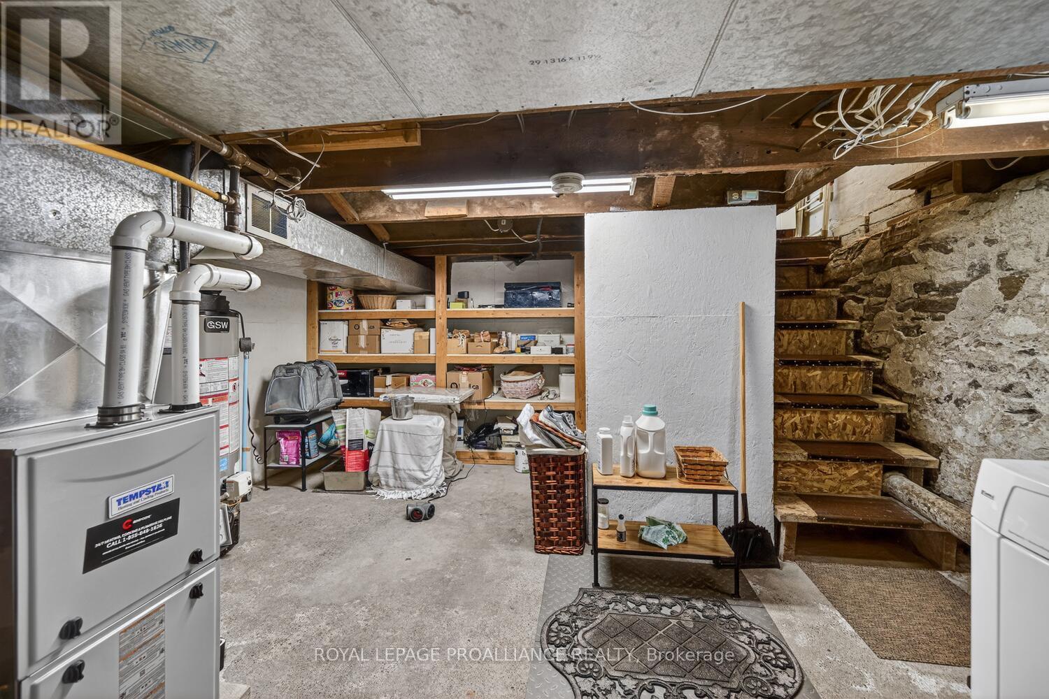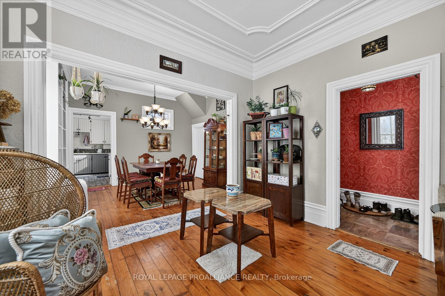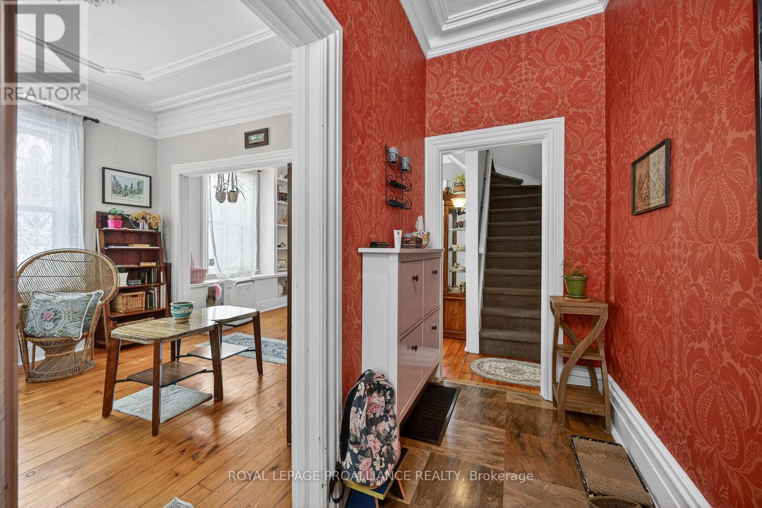 As soon as you enter, you will quickly see that this is a great home! With quality carpentry and extra details from bygone days, this home boasts built-in cabinets and shelving, exquisite crown moulding, and ceiling medallions. The open Living Room and Dining Room are bright, with lots of room, and original wood floors. The functional Kitchen is also bright and airy, with the benefit of the morning sun, and a side door leading to a deck - perfect to enjoy your morning coffee overlooking your private yard and garden. Upstairs you'll find a large open space, ideal for your office or den, two front bedrooms, and a third smaller bedroom and ante room, leading to 4-piece bathroom. Add an oversized single-car garage and energy-efficient gas furnace and hot water heater, and you have a great family room mere steps from downtown and the Mighty St. Lawrence River! (id:64974)