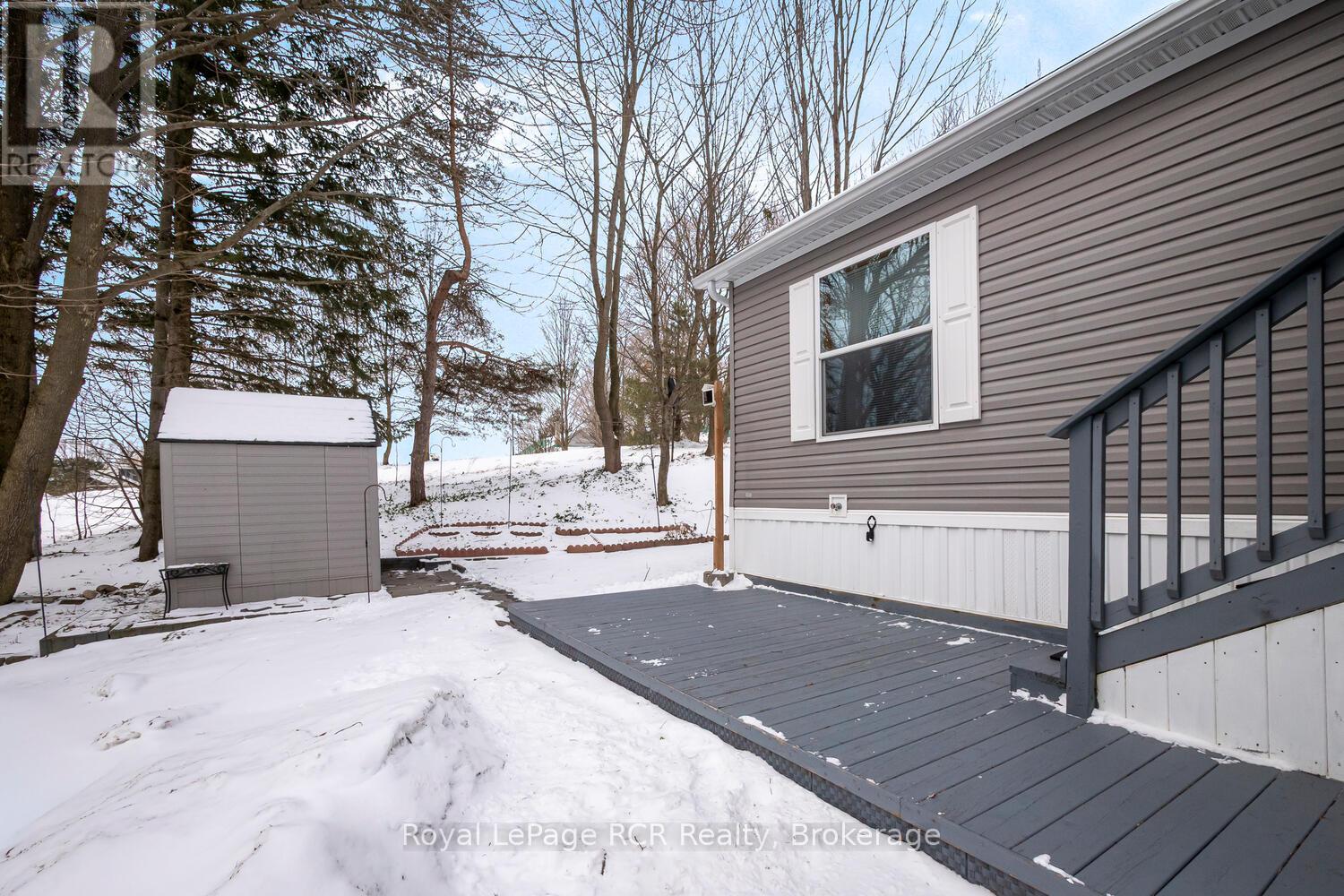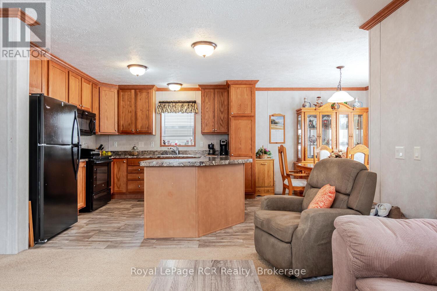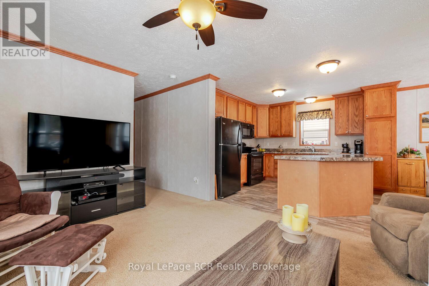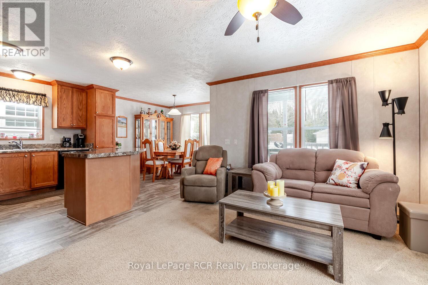 Peaceful Country Living Just Minutes from Owen Sound! Enjoy the tranquility of this well-maintained modular home located just 10 minutes south of Owen Sound in a quiet and friendly community setting. The bright living areas create a warm and welcoming atmosphere and open plan kitchen/living/diningroom make entertaining easy. This comfortable home features a spacious primary bedroom with ensuite bathroom and plenty of closet space. The guest bedroom/office/den offers a practical layout ideal for downsizers, retirees, or those seeking a peaceful retreat. Step outside to relax on the cozy front porch, perfect for enjoying morning coffee. The enclosed side porch provides easy access into the home from the private paved driveway . A mudroom/laundry room is conveniently situated by the side entrance. Surrounded by nature yet close to town amenities, this property offers the perfect balance of country charm and convenience. Lease fee $700.00 monthly, plus $45 water and $133.92 property tax. (id:64974)