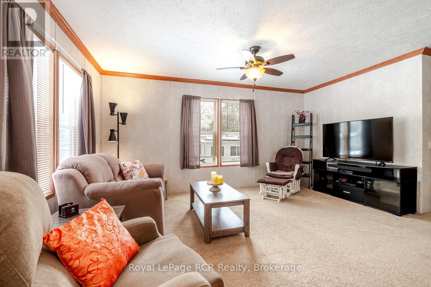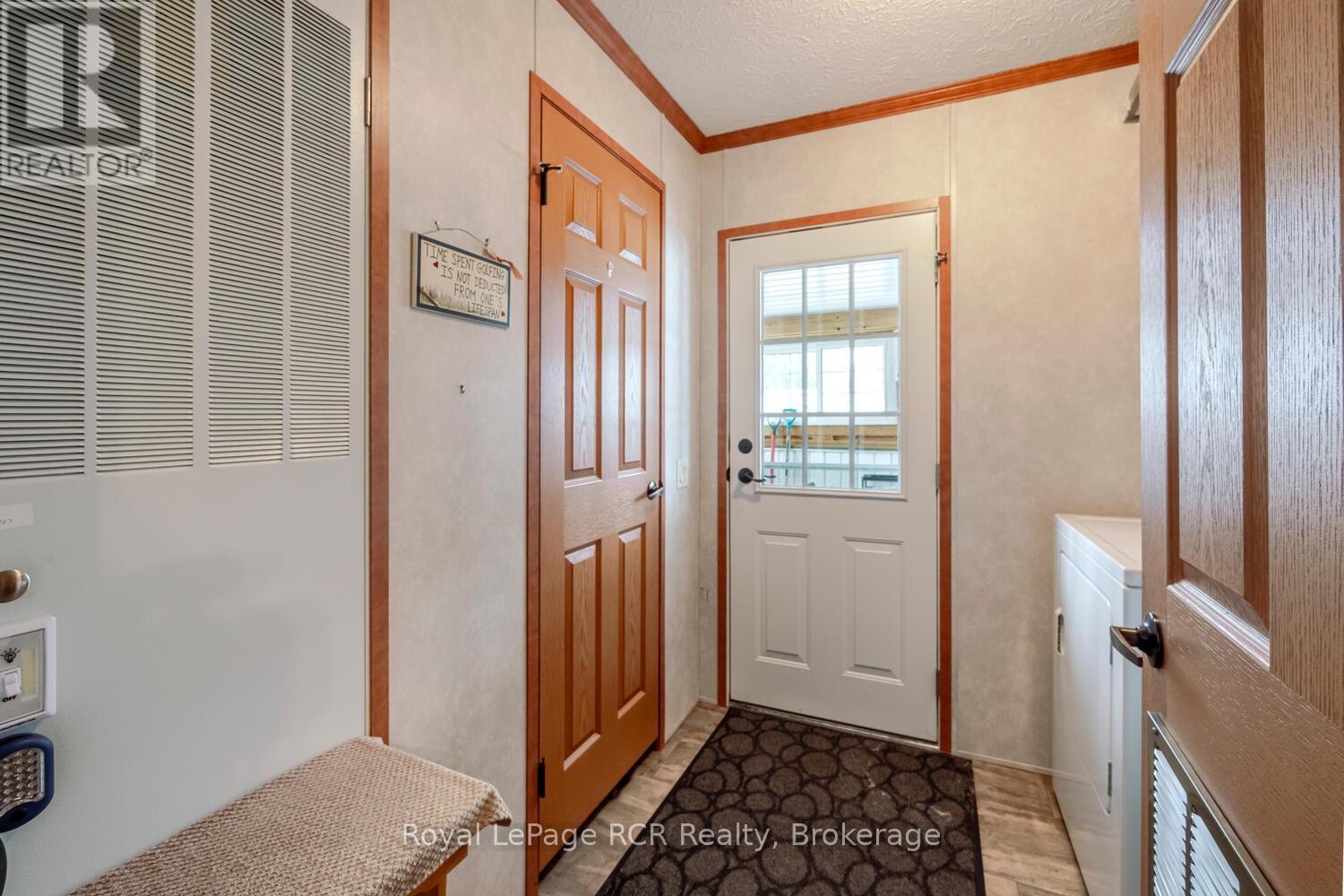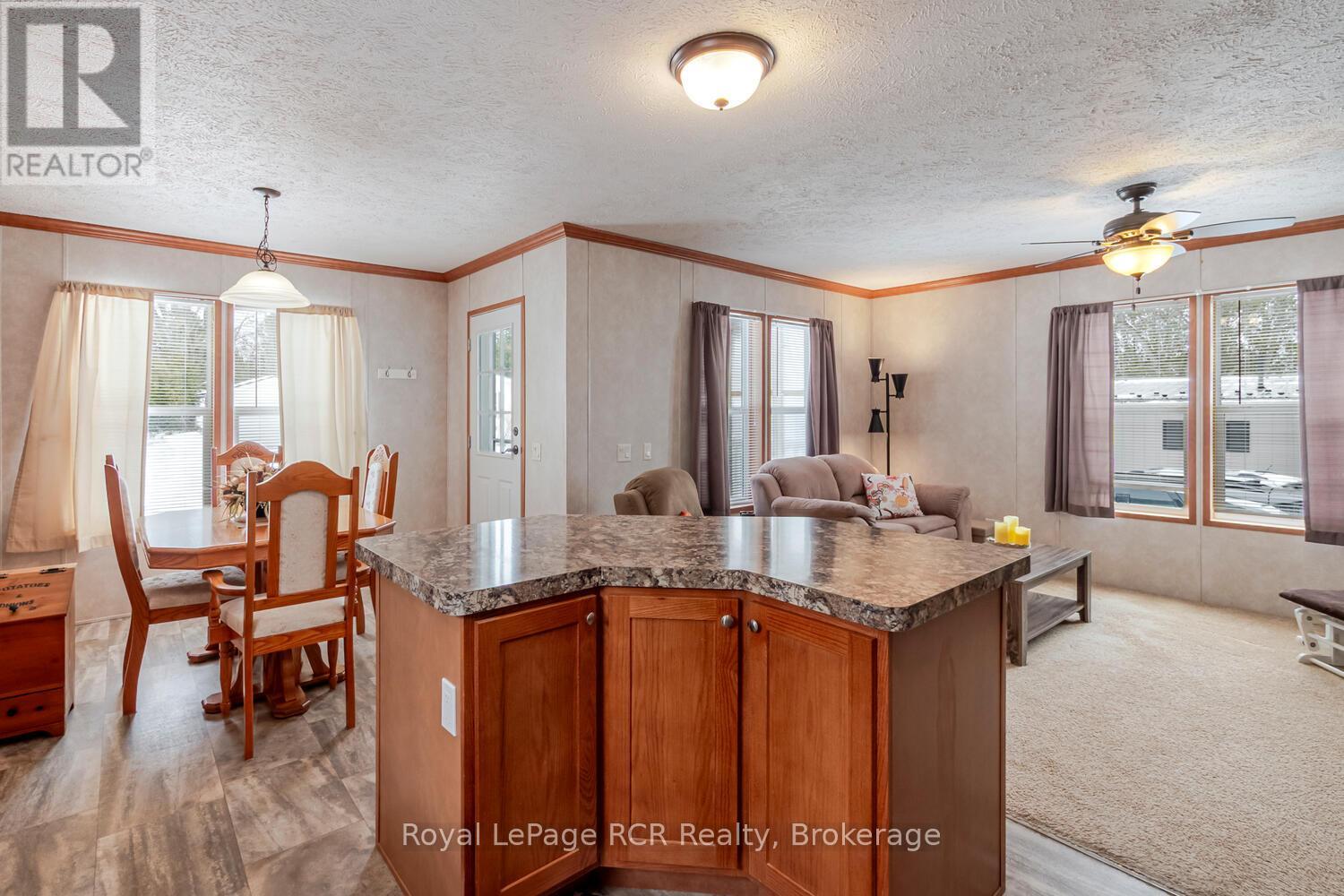Peaceful Country Living Just Minutes from Owen Sound! Enjoy the tranquility of this well-maintained modular home located just 10 minutes south of Owen Sound in a quiet and friendly community setting. The bright living areas create a warm and welcoming atmosphere and open plan kitchen/living/diningroom make entertaining easy. This comfortable home features a spacious primary bedroom with ensuite bathroom and plenty of closet space. The guest bedroom/office/den offers a practical layout ideal for downsizers, retirees, or those seeking a peaceful retreat. Step outside to relax on the cozy front porch, perfect for enjoying morning coffee. The enclosed side porch provides easy access into the home from the private paved driveway . A mudroom/laundry room is conveniently situated by the side entrance. Surrounded by nature yet close to town amenities, this property offers the perfect balance of country charm and convenience. Lease fee $700.00 monthly, plus $45 water and $133.92 property tax. (id:64974)