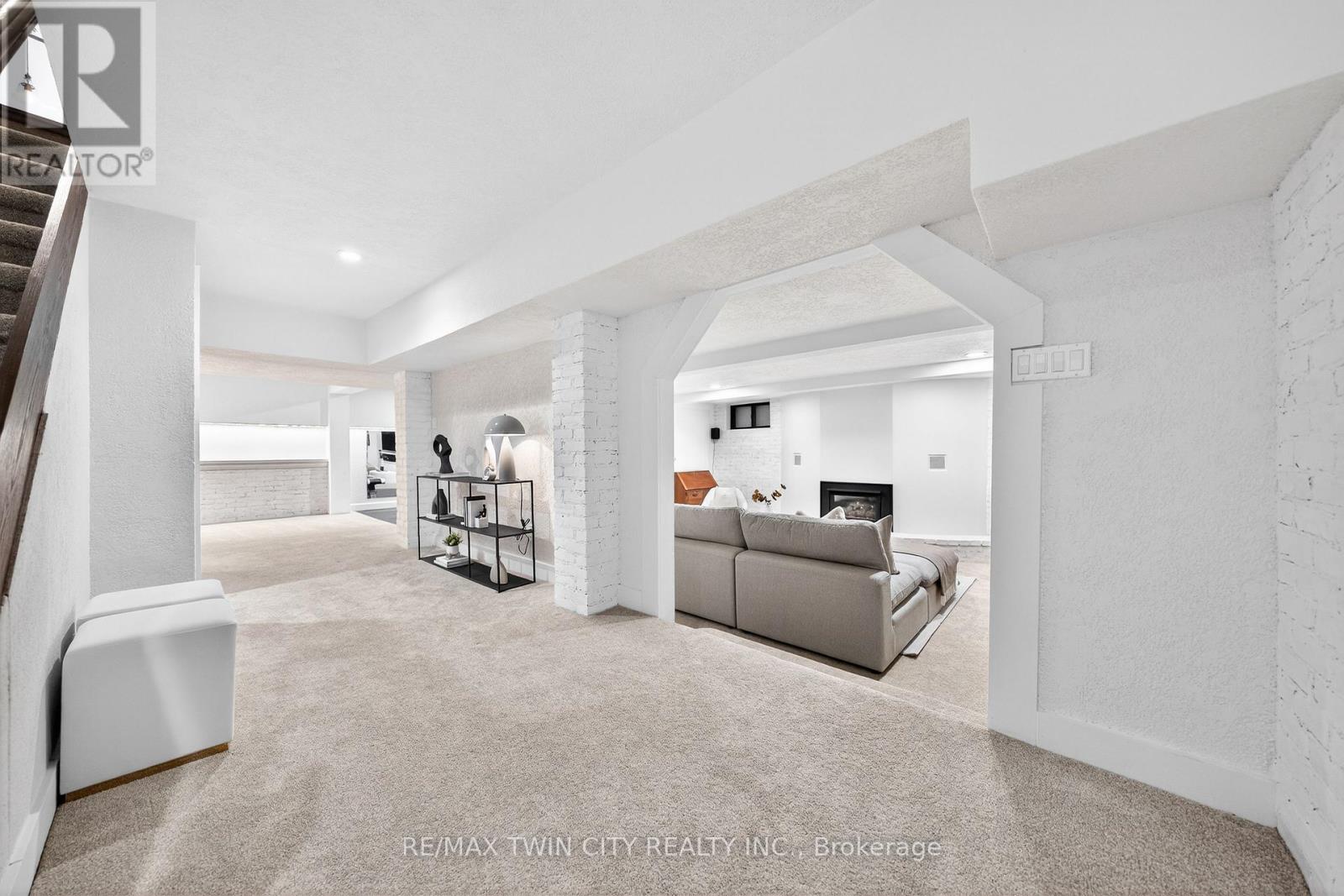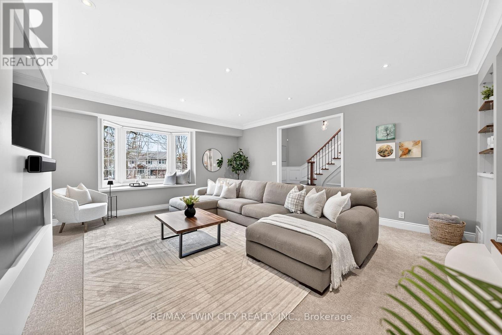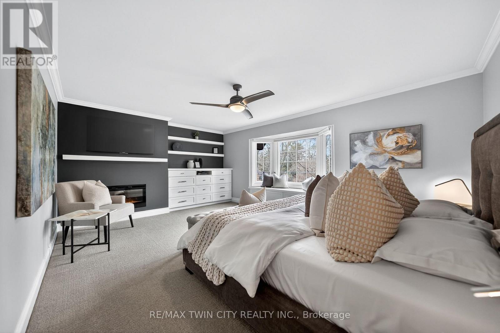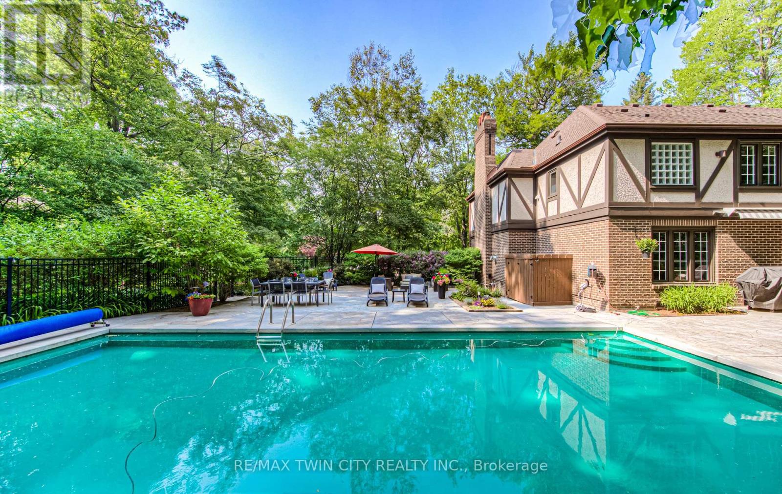 This is the home you have been waiting for. A rare & iconic offering in Old Colonial Acres, one of Waterloo's most prestigious & established neighbourhoods. Set on an expansive, mature, tree-lined lot of approx. acre, this timeless Tudor-style home offers 4,300+ SF of beautifully finished living space with 5 bedrms, 4 bathrms, extensive updates, exceptional privacy, & a backyard that feels like a private resort. Tucked away on a quiet court & surrounded by mature trees, this home offers a level of tranquility rarely found-true cottage-style living in the city, just mins to universities, major employers, & everyday amenities. Designed for both entertaining & everyday living, the bright & spacious layout features a grand 2-storey foyer, impressive great rm with gas FP & bay window, & a formal dining rm. The updated Country Lane kitchen is the heart of the home, complete with heated slate flrs, premium appliances, & oversized island with seating for 6, with direct backyard access for seamless indoor-outdoor living. A functional mudrm with built-ins, garage access, & a well-placed powder rm with backyard entry add convenience. The upper level offers 5 generous bedrms, highlighted by a hotel-inspired primary retreat, with custom feature wall with electric FP, sitting area, walk-in dressing rm with built-ins & laundry area, & a beautifully updated spa-like ensuite with double floating vanities & oversized glass walk-in shower. 4 additional bedrms (3 with balcony access), an updated 5-pc main bath, & 361 SF attic complete the upper level. The finished lower level adds valuable additional living space complete with a rec rm with gas FP, exercise area, games rm, & 2-pc bathrm. Outdoors, the private backyard features an inground pool, expansive patio, covered seating area, & multiple outdoor living spaces-creating a true oasis. This home blends privacy, timeless architecture, & a resort-like lifestyle just mins to universities, Conestoga Mall, parks, trails, & major routes. (id:64974)