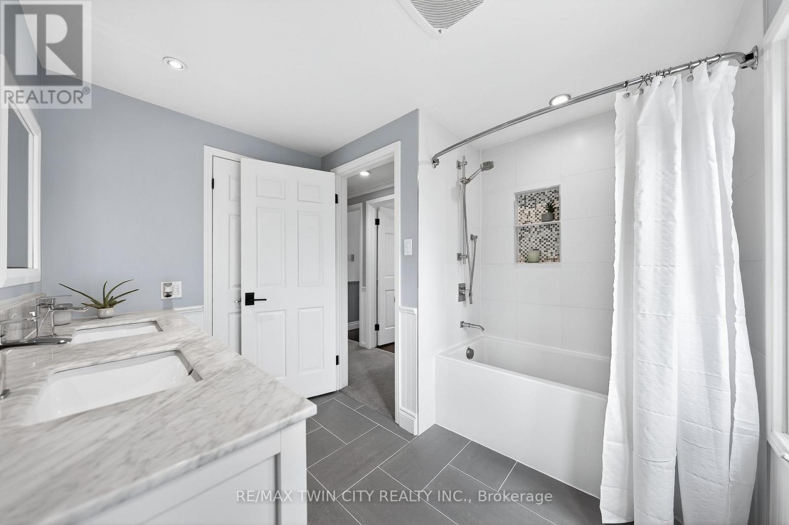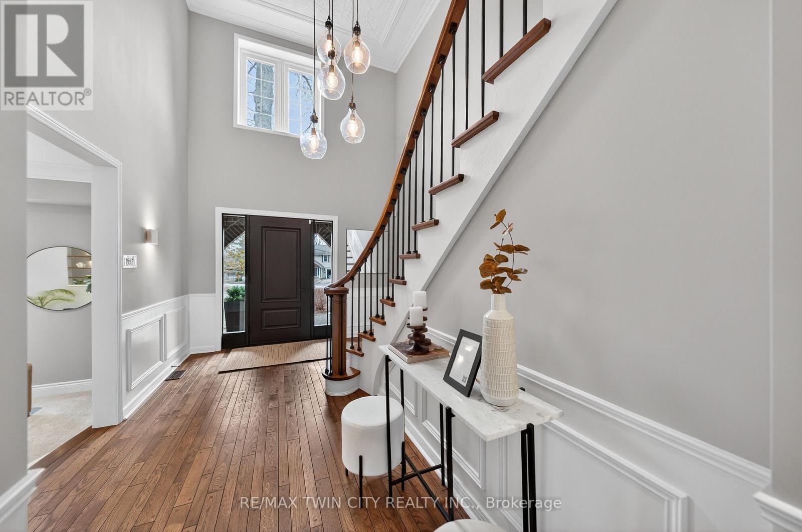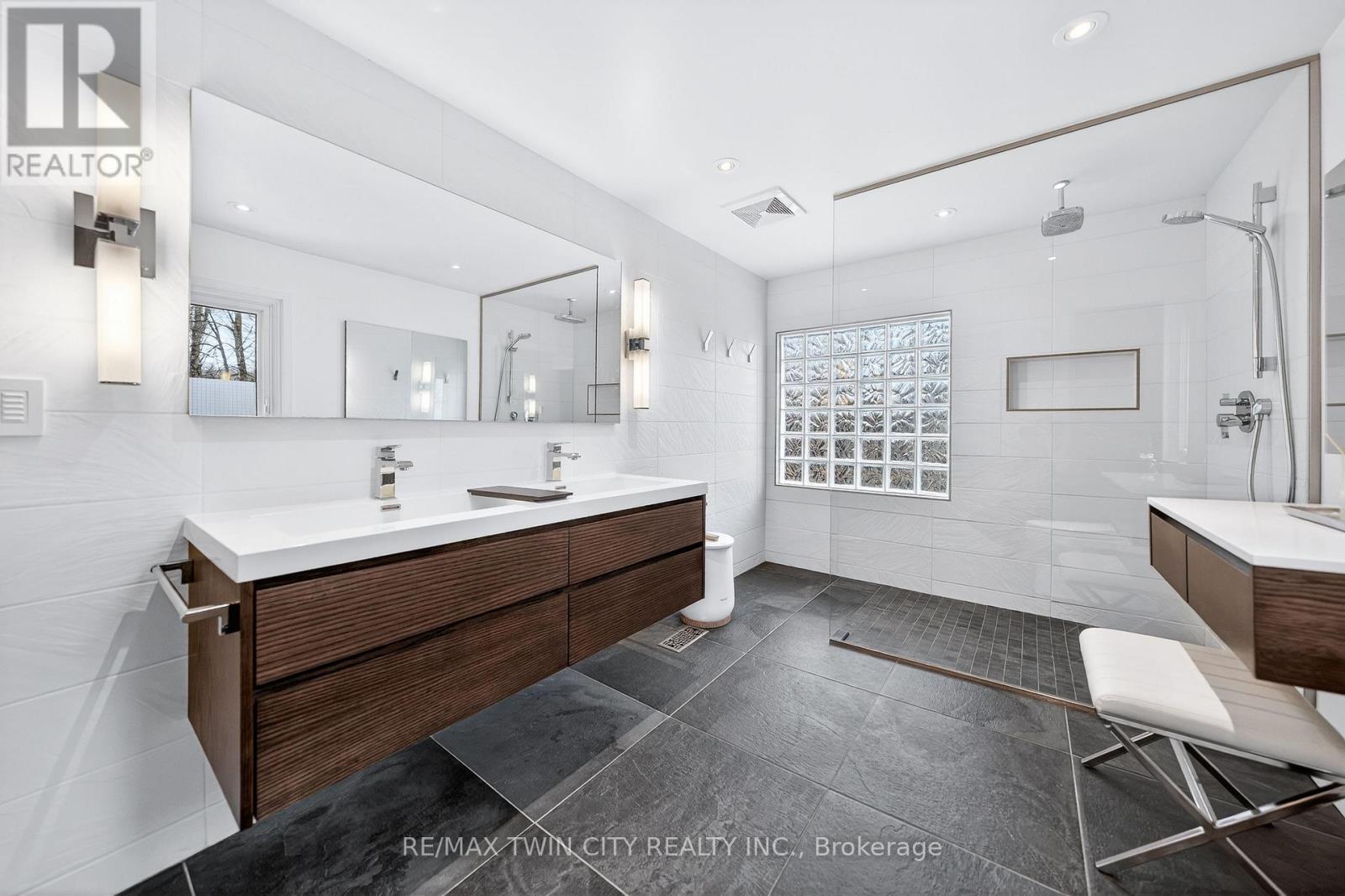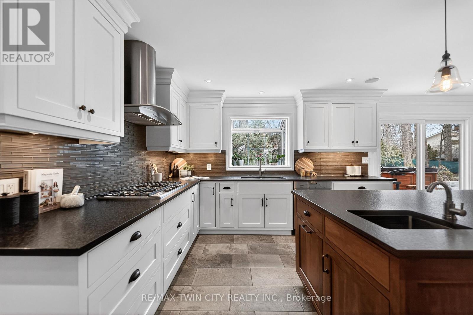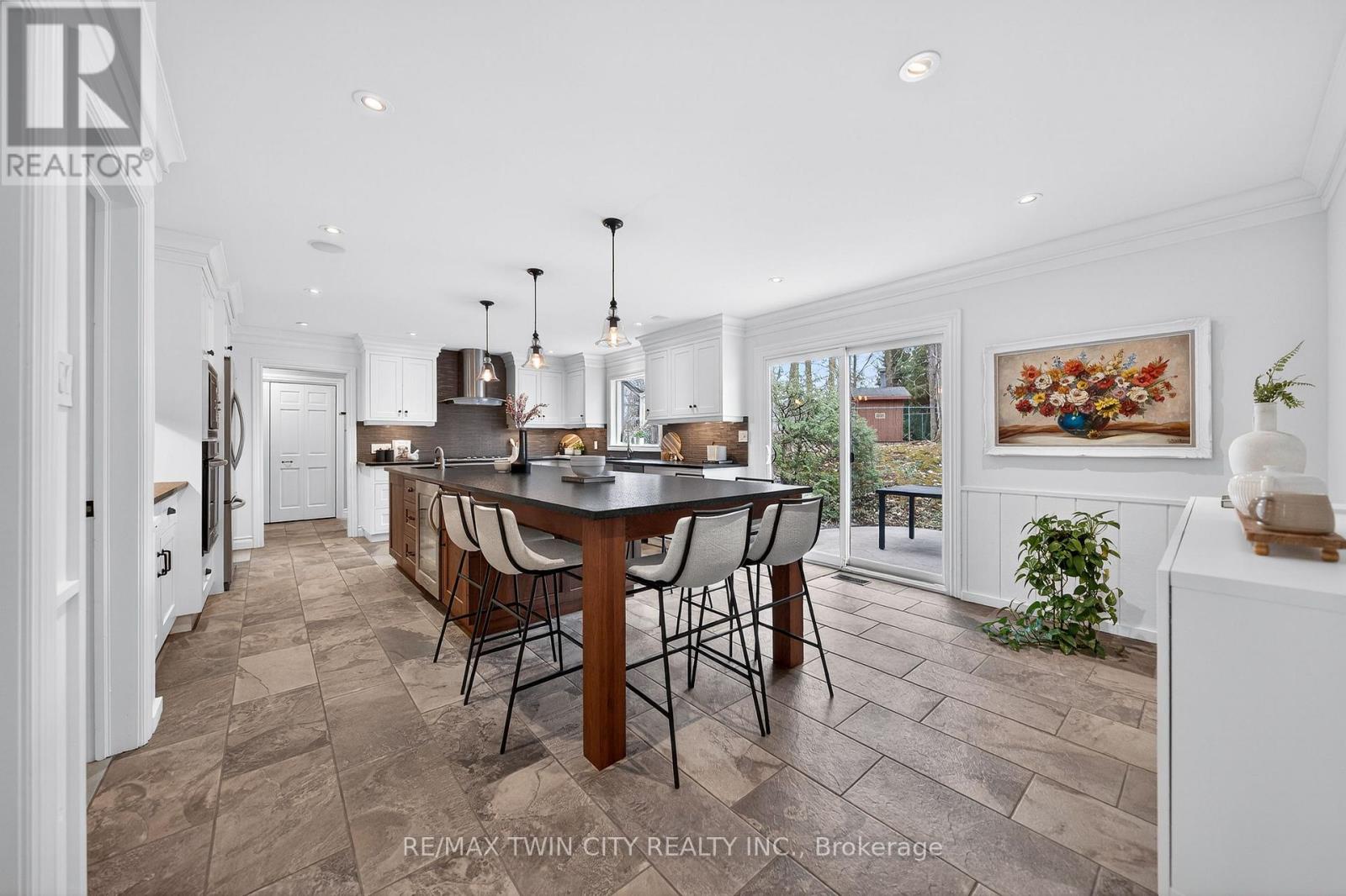 This is the home you have been waiting for. A rare & iconic offering in Old Colonial Acres, one of Waterloo's most prestigious & established neighbourhoods. Set on an expansive, mature, tree-lined lot of approx. acre, this timeless Tudor-style home offers 4,300+ SF of beautifully finished living space with 5 bedrms, 4 bathrms, extensive updates, exceptional privacy, & a backyard that feels like a private resort. Tucked away on a quiet court & surrounded by mature trees, this home offers a level of tranquility rarely found-true cottage-style living in the city, just mins to universities, major employers, & everyday amenities. Designed for both entertaining & everyday living, the bright & spacious layout features a grand 2-storey foyer, impressive great rm with gas FP & bay window, & a formal dining rm. The updated Country Lane kitchen is the heart of the home, complete with heated slate flrs, premium appliances, & oversized island with seating for 6, with direct backyard access for seamless indoor-outdoor living. A functional mudrm with built-ins, garage access, & a well-placed powder rm with backyard entry add convenience. The upper level offers 5 generous bedrms, highlighted by a hotel-inspired primary retreat, with custom feature wall with electric FP, sitting area, walk-in dressing rm with built-ins & laundry area, & a beautifully updated spa-like ensuite with double floating vanities & oversized glass walk-in shower. 4 additional bedrms (3 with balcony access), an updated 5-pc main bath, & 361 SF attic complete the upper level. The finished lower level adds valuable additional living space complete with a rec rm with gas FP, exercise area, games rm, & 2-pc bathrm. Outdoors, the private backyard features an inground pool, expansive patio, covered seating area, & multiple outdoor living spaces-creating a true oasis. This home blends privacy, timeless architecture, & a resort-like lifestyle just mins to universities, Conestoga Mall, parks, trails, & major routes. (id:64974)