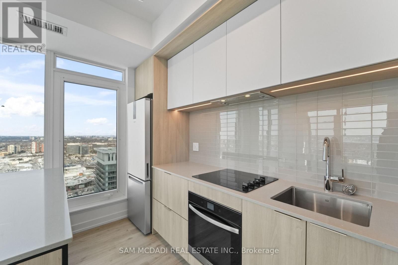 Welcome to this brand new, never-lived-in 2 bedroom, 2 full bathroom residence complete with parking featuring an EV charger and a locker, located in the heart of Mississauga's vibrant Square One District. Designed with both style and functionality in mind, this sun-filled suite offers an efficient open-concept layout with approximately 9-foot ceilings, smooth finished ceilings, and large windows that flood the space with natural light. The contemporary kitchen is thoughtfully appointed with custom European-inspired cabinetry, quartz countertops, integrated under-cabinet lighting, a tile backsplash, and stainless steel appliances, making it ideal for everyday living and entertaining alike. The living and dining areas flow seamlessly to create a welcoming atmosphere, while the bedrooms provide comfortable retreats. Modern bathrooms feature sleek vanities with integrated sinks, frameless mirrors, chrome fixtures, deep soaker tubs or glass-enclosed showers, and full-height tile surrounds. Laminate flooring runs throughout the main living areas, complemented by porcelain and ceramic tile in wet areas. Residents enjoy an exceptional collection of amenities, including a fully equipped fitness centre, rooftop terrace with panoramic views, basketball court, BBQ area, kids' playroom, climbing wall, meditation room, sauna, and 24-hour concierge and security. Steps to Square One Shopping Centre, Sheridan College, Celebration Square, transit hub, GO Transit, and the future LRT, with quick access to Highways 403, 401, and QEW. Move-in ready and impeccably located-an outstanding opportunity for end-users and investors alike. (id:64974)