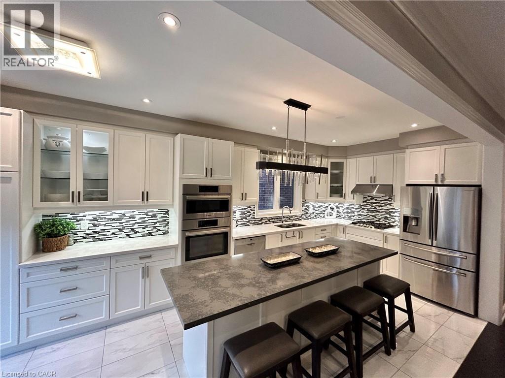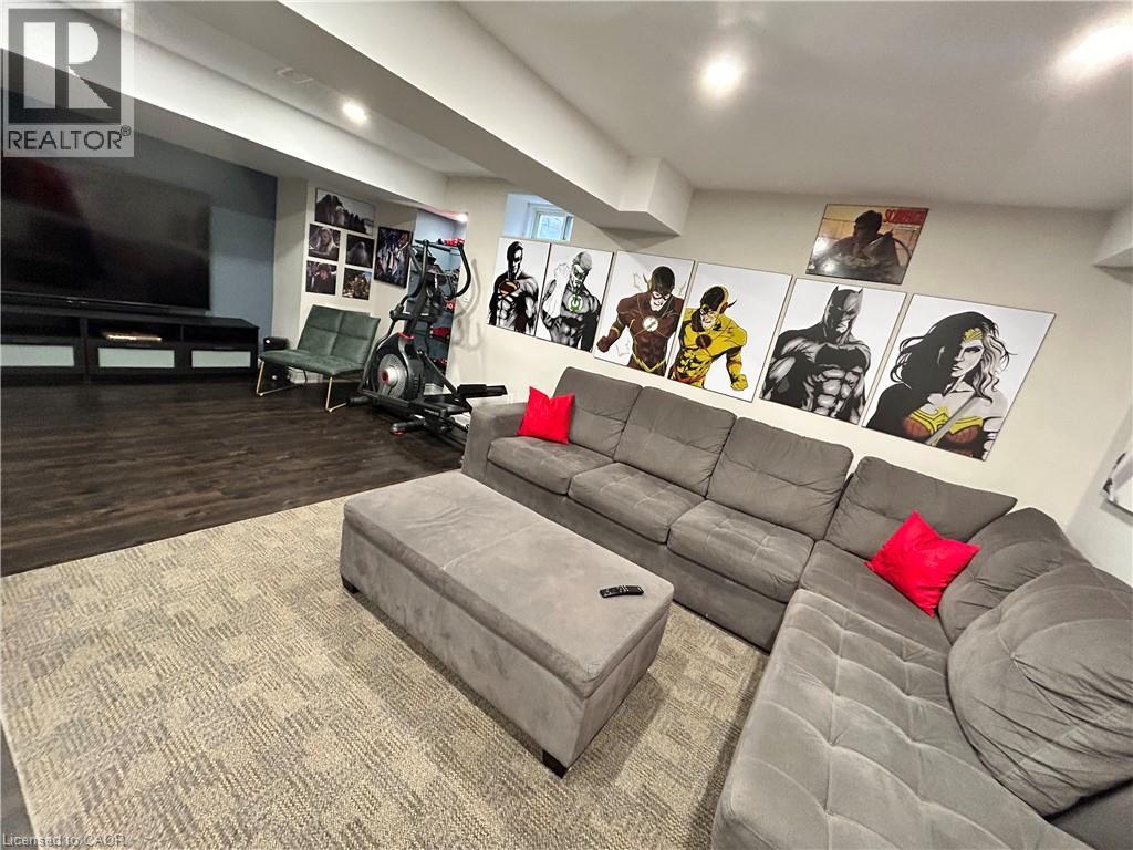 Nestled between the James Snow Parkway and Trudeau Drive, this tastefully upgraded link-detached home is ideally located close to schools, parks, shopping, groceries, and major highways—perfect for a growing family. Offering 4 bedrooms and 3.5 bathrooms, the home features a finished open-concept basement with a spacious great room, wet bar, office/den, pot lights, and a 3-piece bath. The extended chef’s kitchen showcases stainless steel appliances, Caesarstone countertops, a large eat-in island, custom soft-close cabinetry, tiled backsplash, and a walkout to a deck overlooking a paver-stone backyard with an 8' x 10' garden shed. The main floor includes a family room with gas fireplace and a separate living and dining area, enhanced by modern lighting, upgraded handrails with wrought iron pickets, crown mouldings, high baseboards, California shutters, and zebra blinds. Upper-level laundry offers upgraded appliances and linen storage. Hardwood floors throughout, with matching laminate in the basement. Exterior pot lights and fence lighting on timers. Parking for three cars and EV plug-in in the attached garage. (id:64974)