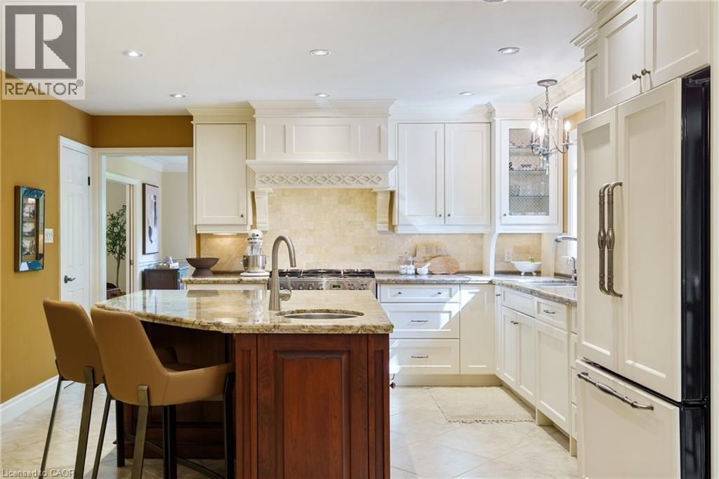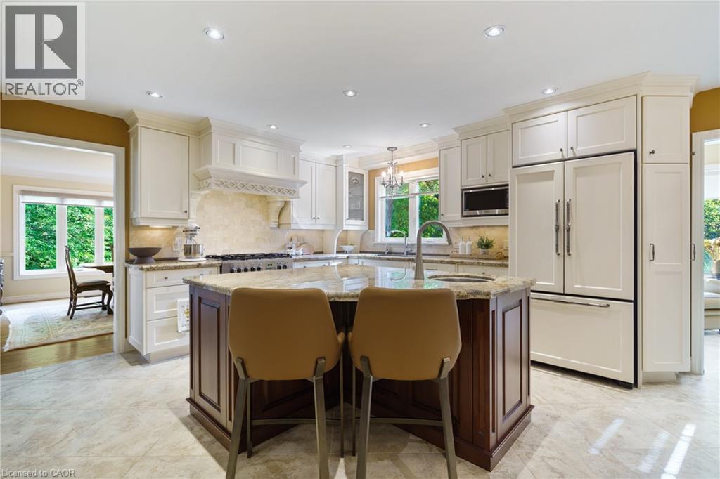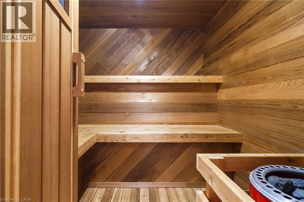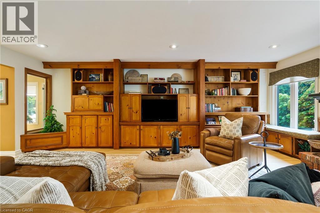 A rare blend of luxury, privacy, and pure lifestyle magic—this exceptional property delivers an experience unlike anything else. Set on a picturesque 0.61-acre, tree-lined lot backing onto protected conservation lands, this pristine all-brick two-storey home offers refined living surrounded by serene, uninterrupted green space. Designed with family living and entertaining in mind, the home offers six spacious bedrooms and five well-appointed bathrooms. The main level features elegant principal rooms, including a formal living and dining area highlighted by a beautiful bay window. The chef-inspired kitchen is a standout, complete with a gas stove, stone countertops, stainless steel appliances, walk-in pantry, and a generous island with bar seating—seamlessly connecting to a bright dinette and an inviting family room anchored by a wood-burning fireplace with a classic brick mantle. Thoughtful touches continue with a sun-filled reading nook, powder room, main floor laundry, and convenient inside access to the garage. Upstairs, a sweeping oak staircase leads to a luxurious primary retreat featuring a walk-in closet and a recently updated spa-like five-piece ensuite with soaker tub and separate glass shower. Additional bedrooms are generously sized, with well-designed Jack-and-Jill bath layouts, ideal for family or guests. The fully finished walk-out basement expands the living space even further, offering a large recreation area, dedicated exercise room with three-piece bath and sauna, and the show-stopping squash court. Outdoors, the property transforms into a private oasis with tiered decking, a stone patio, and beautifully landscaped grounds—all perfectly oriented to capture the tranquility of the protected green space beyond. Plus, a charming log cabin retreat and a separate viewing deck perfectly positioned to take in the sweeping natural backdrop. An extraordinary offering where sophistication, comfort, and a sense of adventure come together effortlessly. (id:64974)