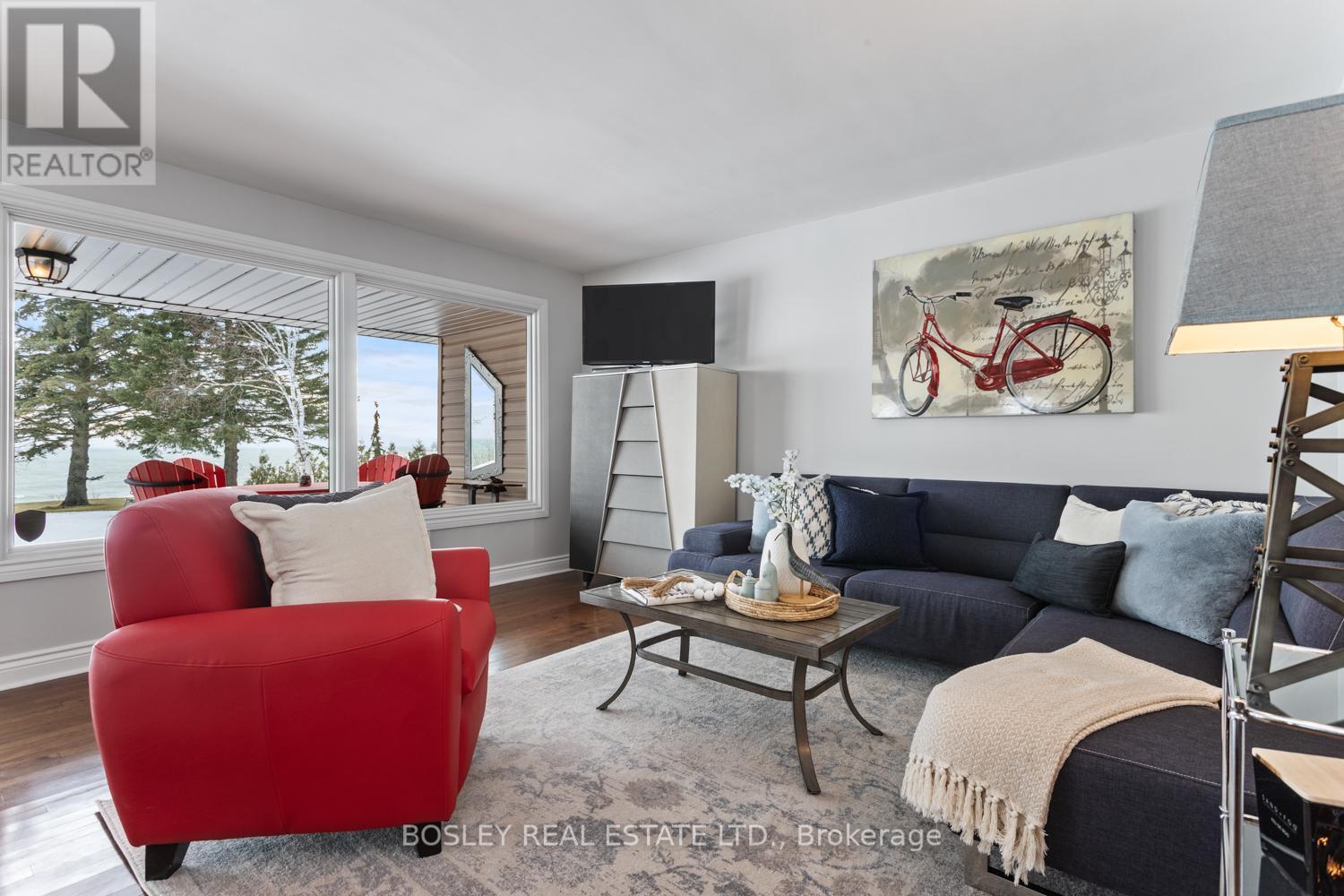 Magnificent Lakefront Views from this incredible and unique waterfront property, a rare find along the Lake Ontario Shoreline with direct beach access and a view that brings a smile to your face all year round. Plenty of thoughtful details, a well designed interior main floor layout with space to take in the view from every window, watch the skyline all day, evening and into the night surrounded by privacy. A beautiful exterior space for entertaining, large stamped concrete patio overlooking the exterior lights illuminating the landscaped grounds, custom fire pit and decking along the shore, leading directly down to the lake with views through to Presqu'ile Provincial Park. A beautiful interior with tasteful updates, eat in kitchen with beautiful cabinetry and storage, overlooking the main floor den with oversized windows, large living room adjacent with plenty of space for you to personalize and orientate furniture to spend time entertaining or just enjoying the peace and tranquility. Expansive lower level with additional room for finished living space and guest accomodation, laundry etc.... The primary bedroom provides a second walk out to the Southern part of the property and a diverse landscaped yard with mature trees and clear views. A very special place to call your own, an asset cottage for those who like to travel or a full time residence, a multitude of options for those looking to really take in "Lake Life" and appreciate the little details. Relax, swim, sunsets, stargazing and breathe in the lake breeze! (id:64974)