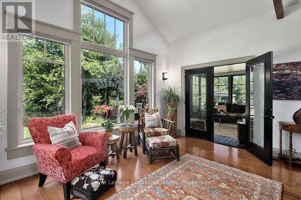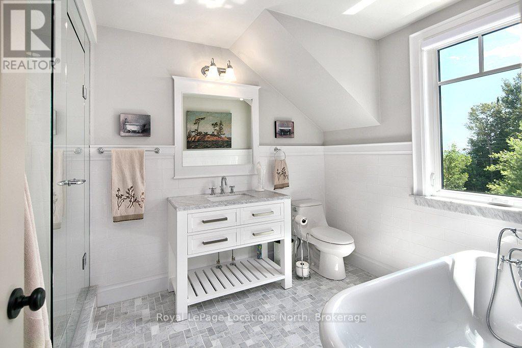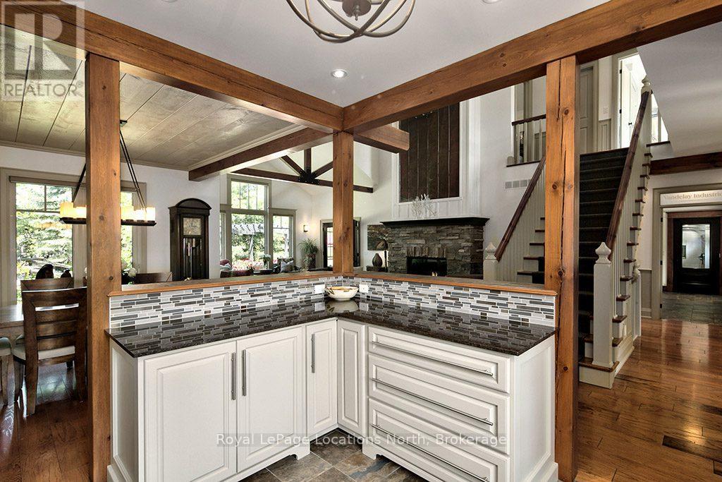 Discover a rare gem in Lora Bay, steps from the beautiful Lora Bay beach. Rainmaker Estates meticulously designed and custom-built 6 bed residence, perfectly positioned across from Georgian Bay, this Sunset Blvd location offers unparalleled luxury and convenience. 4300sqft of living space, this home features a thoughtful open concept layout on the main floor. The space is graced with exposed wood beams, lovely hardwood floors & wood ceiling.The chef's kitchen, complete with top-of-the-line stainless steel appliances, seamlessly connects to the dining room and the light-filled great rm. The great rm boasts a double-height cathedral ceiling and stunning stone and copper-clad gas fp, creating a focal point of warmth and sophistication. The main floor also includes a sun room, mudroom w/convenient main floor laundry and luxurious primary suite, complete with a 5pc spa-like ensuite bath. The mudroom opens onto a poured concrete covered front porch and has access to the 3-car insulated/heated garage. Upstairs, you'll find 3 more beds, a stylish 4pc bath with a clawfoot tub and a bonus area that overlooks the great room below offering breathtaking views of Georgian Bay! The lower level is a true entertainer's space, featuring 9ft ceilings, radiant in-floor heating throughout, 2 bedrooms, and a 3pc bath. The expansive rec room, with its gas fireplace and wet bar, is perfect for gatherings, while the private home theatre adds a touch of luxury for movie nights. Every inch of this property has been thoughtfully crafted, including professional landscaping by The Landmark Group. Enjoy the meticulously designed flagstone patios and walkways, custom gas fire pit, pergola, dedicated dining area, extensive stonework is imported from Tobermory and 75 newly planted trees for added privacy. The home is supported by a Generac generator system. Lora Bay residents enjoy access to a wealth of amenities including the golf course, a restaurant, a members-only lodge, a gym and 2 beaches. (id:64974)