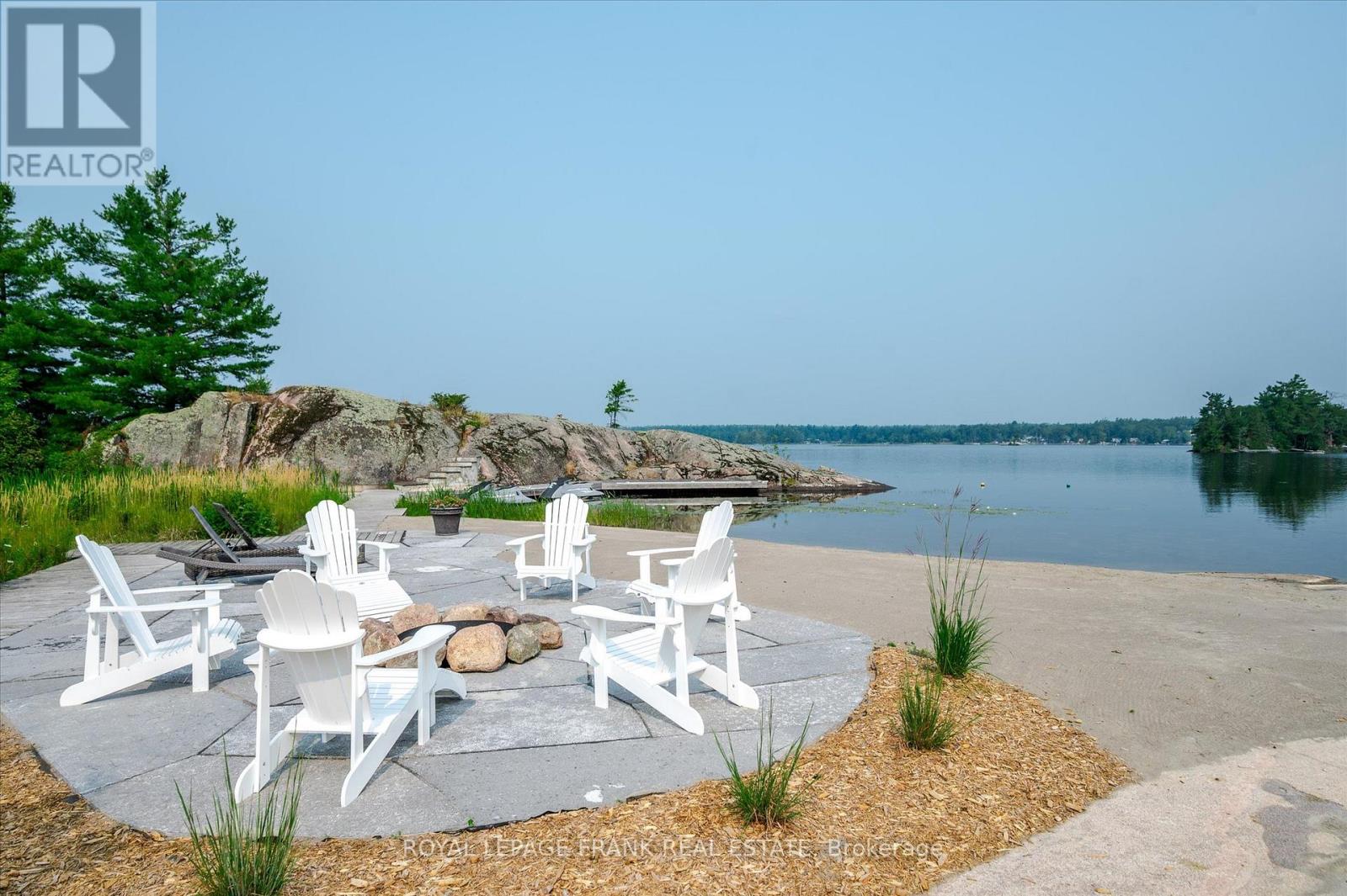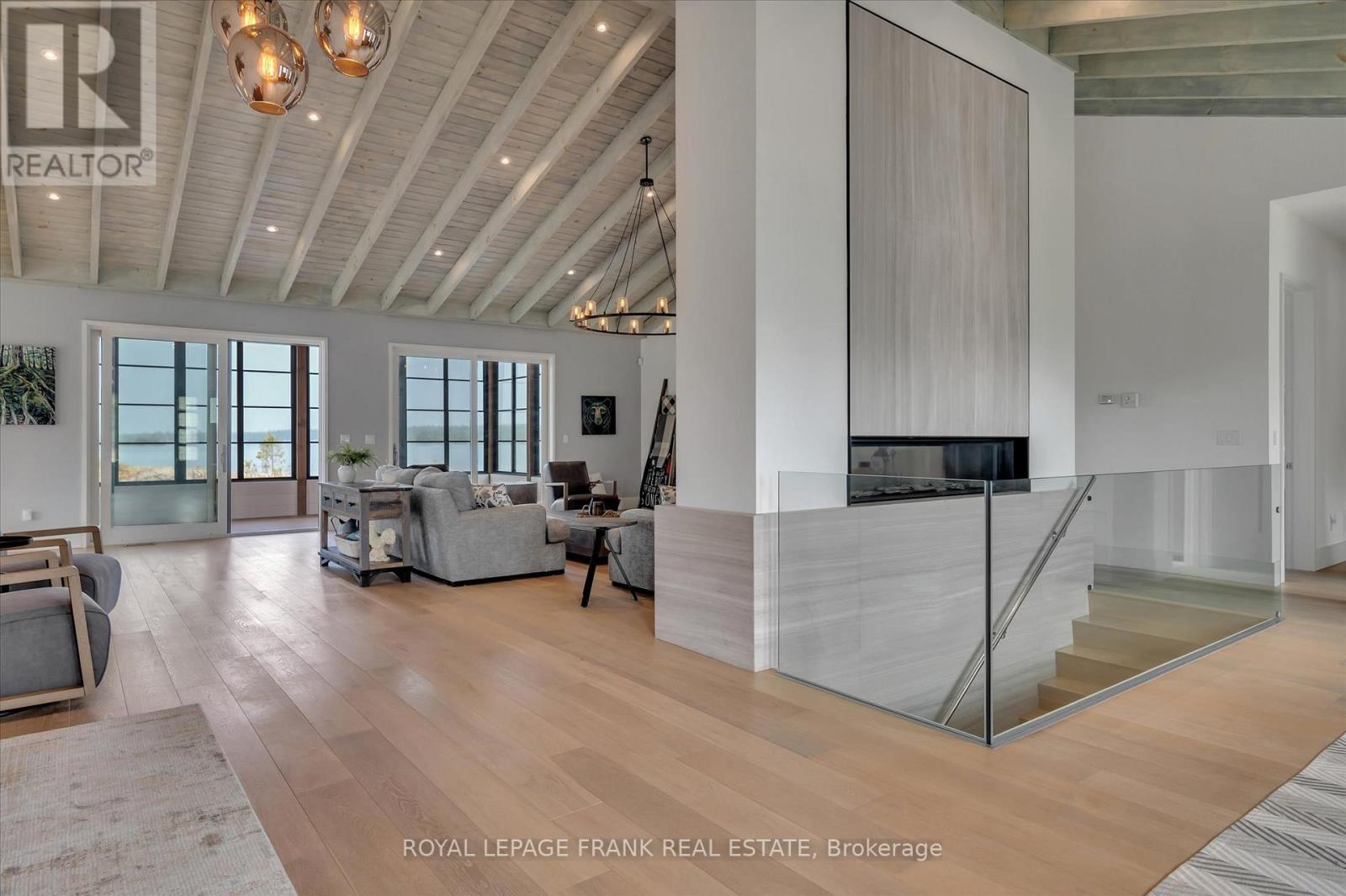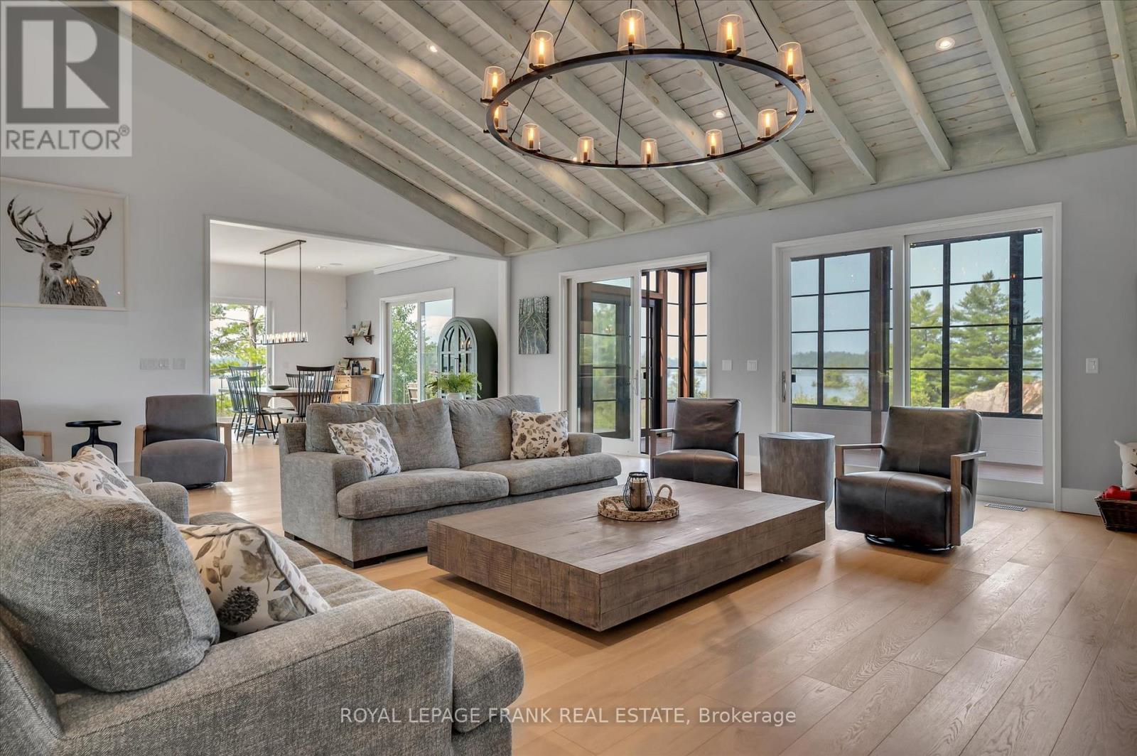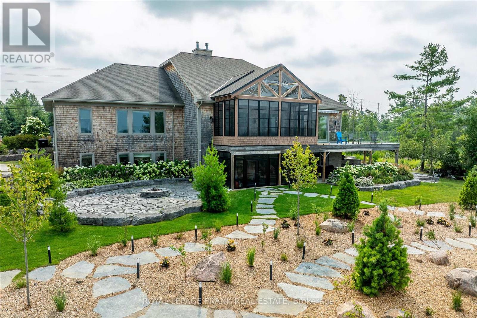 Experience the pinnacle of lakeside living at this stunning Stoney Lake estate. Rarely do properties of this scale become available. Set on over 3 acres of beautifully landscaped grounds with an impressive 1,000 feet of water frontage, this estate offers sweeping views down the length of Upper Stoney Lake. The setting is truly spectacular complete with breathtaking sunsets, exceptional privacy, and a massive sand beach. A distinctive granite island point (offering an additional 700+ ft of frontage) provides the perfect location for deep-water swimming, all ideally positioned to capture the sunset. The 5-bedroom, 4.5-bathroom home is impeccably designed, blending relaxed lakeside charm with refined modern finishes. Bright, spacious interiors are thoughtfully appointed, including a dream kitchen ideal for both casual family time and elevated entertaining. Step outside to enjoy the extensive professional landscaping, a lakeside fire pit for unforgettable evenings, and a brand-new bunkie or yoga studio just steps from the shoreline. The screened-in Kawartha Room invites you to enjoy the outdoors in comfort -- rain or shine. A detached triple-car garage offers ample storage and convenience, with direct access off a paved road. Located only minutes from the prestigious Wildfire Golf Club, this exceptional property delivers an unmatched opportunity to enjoy luxury, nature, and lifestyle -- all in one extraordinary package. Click "Multi Media", below, for aerial video, additional photos and more. (id:64974)