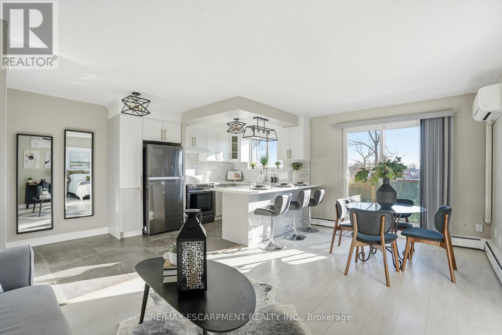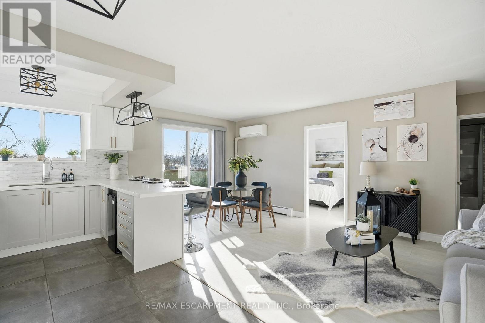 Welcome to this beautifully renovated condo apartment in the highly desirable Bartonville-Glenview neighbourhood of East Hamilton. Offering a comfortable, low-maintenance lifestyle, this move-in-ready unit with an owned storage locker, presents a rare combination of modern updates, peaceful surroundings, and exceptional views-ideal for first-time buyers, downsizers, or investors. The thoughtfully renovated interior features carpet-free living throughout, stone countertops, a functional breakfast bar, and one of the few units in the building with built-in air conditioning, creating a bright, modern space ideal for everyday living and entertaining. Large windows and a massive private balcony extend the living space outdoors and showcase an exceptional scenic view overlooking the tree-lined skyline of the Red Hill Valley Bowl, offering a peaceful green backdrop and a rare connection to nature seldom found in condo living. Enjoy nearby green spaces, including Red Hill Valley Trail across the street providing scenic walking and biking trails throughout the Red Hill Valley. Commuters will appreciate easy access to major routes including the Red Hill Valley Parkway, the LINC, QEW, and Highway 403, making travel across Hamilton and into the GTA efficient and stress-free. Public transit, shopping, restaurants, and essential amenities are all nearby along King Street East, Queenston Road, and Centennial Parkway. Surrounded by parks, schools, and community services, this location offers a peaceful residential setting enhanced by stunning tree-lined valley views, while remaining minutes from downtown Hamilton, Stoney Creek, and major employment hubs. A fantastic opportunity to own in a well-established East Hamilton neighbourhood known for its accessibility, natural surroundings, and lifestyle appeal. (id:64974)