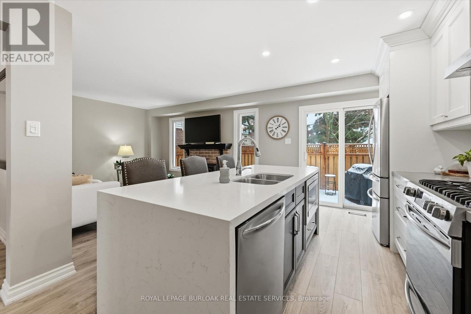Gorgeous updated town home in the sought after South East Burlington steps to the Lake & all amenities. A small enclave of owners in a private setting with mature trees, gardens, parks and tree lined neighbourhoods for walking and enjoying life. The home has recently been updated with new flooring throughout, a stunning open concept chefs kitchen with large quartz island, backsplash, custom cabinetry, breakfast bar, pot lighting open to a cozy family room with natural gas fireplace, bright natural light and a walk-out to your private sun deck for outdoor dining/bbq area. Separate dining area with plenty of space for large gatherings open to a spacious living room for entertaining. The 2nd floor features two large primary bedrooms with spacious ensuites, large windows/natural light/skylights. The lower level has been fully finished with 3 piece bathroom, comfortable den and office space. This house is perfect for families, down sizers, retirees and those looking to lock up and go. Move in and enjoy. New A/C & furnace. HOA includes snow removal to the door, salting, all landscaping. Close to Go Train, Highway access, Lake Ontario, grocery, restaurants and banking. Move in ready. (id:64974)