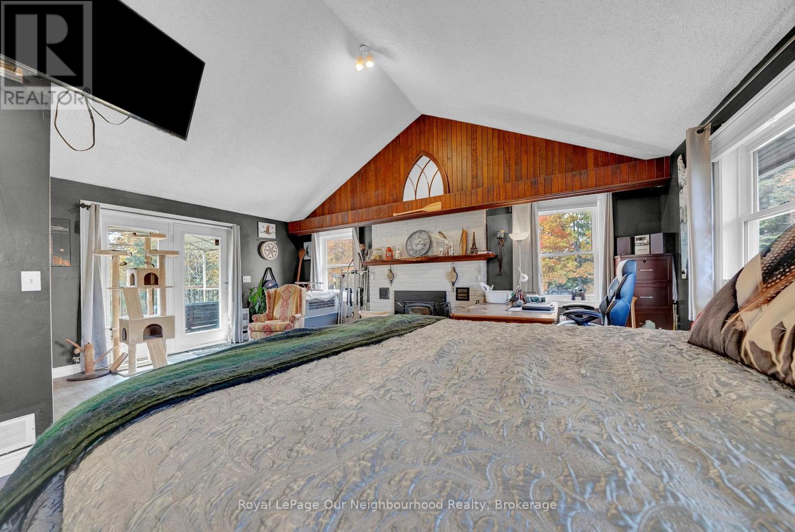 Charming, former Crooked Creek Schoolhouse, set on 1.49 private acres, offering character, space, and multigenerational potential. This unique country home features warm wood accents, a cozy woodstove, and inviting rustic charm throughout. The main level includes a bright eat-in kitchen with pantry area, spacious living room with wood accent wall, and a charming library/reading nook. Walk out to the deck and enjoy peaceful countryside views. The impressive primary suite offers vaulted ceilings, large windows that fill the space with natural light, wood-burning fireplace, his and hers cedar-lined closets, coffee station, ensuite bath, and private deck access. The walkout lower level provides excellent flexibility with a third bedroom, kitchenette, 3-piece bath, generous storage, and separate entrance - ideal for extended family or in-law potential. Additional features include an attached double garage, raised garden beds, chicken coop, mature cherry trees, and new Honeycrisp apple trees. A rare opportunity to own a distinctive country property with history and endless possibilities. (id:64974)
