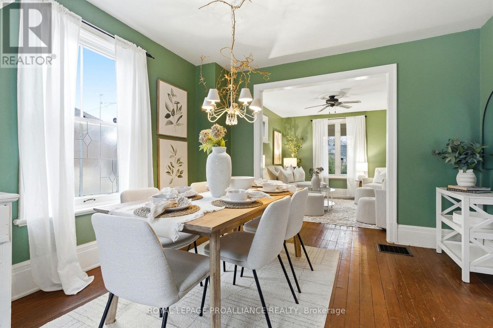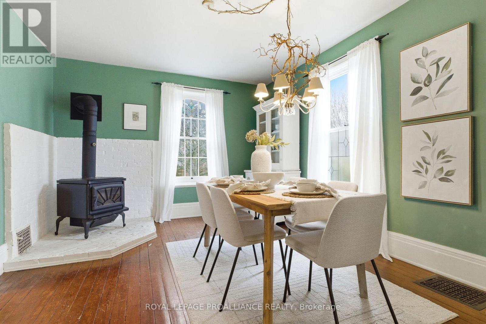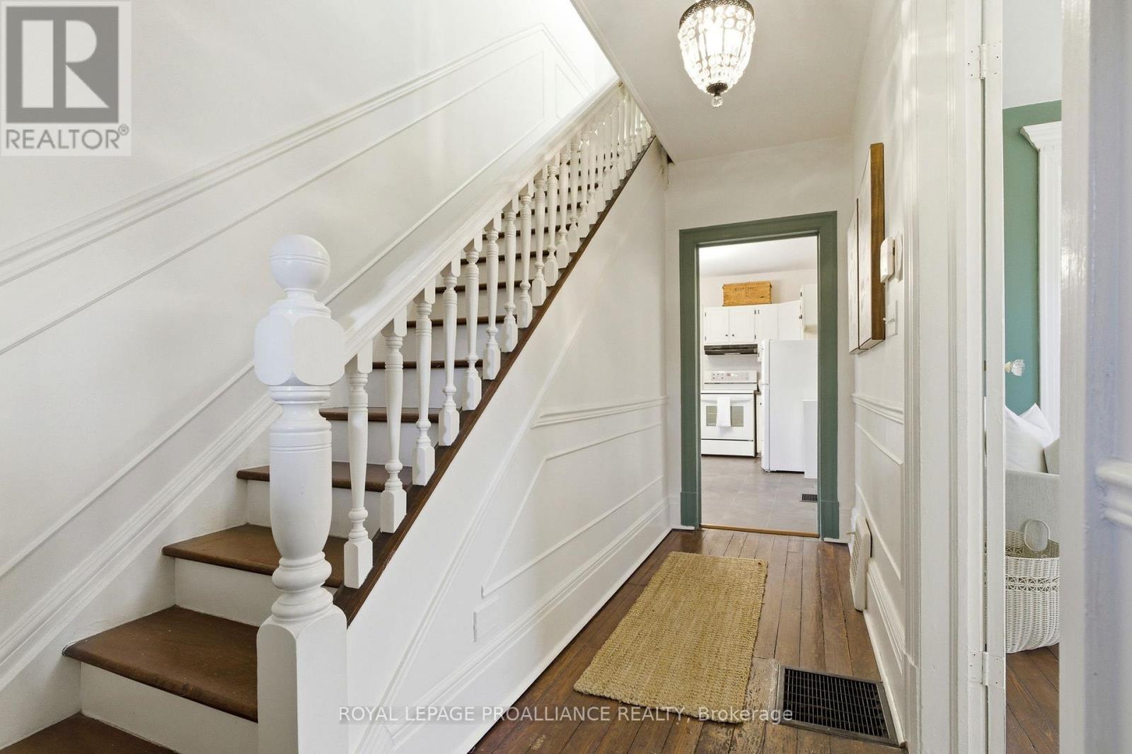 Welcome to 383 Mathew St, a charming Jackson-style home built in 1916 just steps from downtown Cobourg. Situated on a quiet street, this classic 2-storey brick home features 3 bedrooms, 1.5 bathrooms, original wood floors throughout, and central A/C for year-round comfort. Fresh paint and thoughtful updates complement the original architectural details, including the original front hall banister, creating a warm and inviting atmosphere, while newer appliances, including a recently replaced fridge and dryer, add everyday convenience. The dining room features a cozy wood stove, adding both warmth and character to the space. The full unfinished basement provides excellent storage and potential for future use. A covered front porch invites you to unwind, and the fully fenced yard with mature perennial gardens creates a private outdoor setting to enjoy. Just a short stroll to downtown shops, restaurants, parks, and Cobourg's waterfront, this property blends timeless character with an exceptional lifestyle location. Updates: Roof (approx 8 yrs old), Furnace (approx 4 yrs old), Central A/C (approx 1 yr), knob and tube removed (16 yrs ago), fridge & dryer (2025) (id:64974)